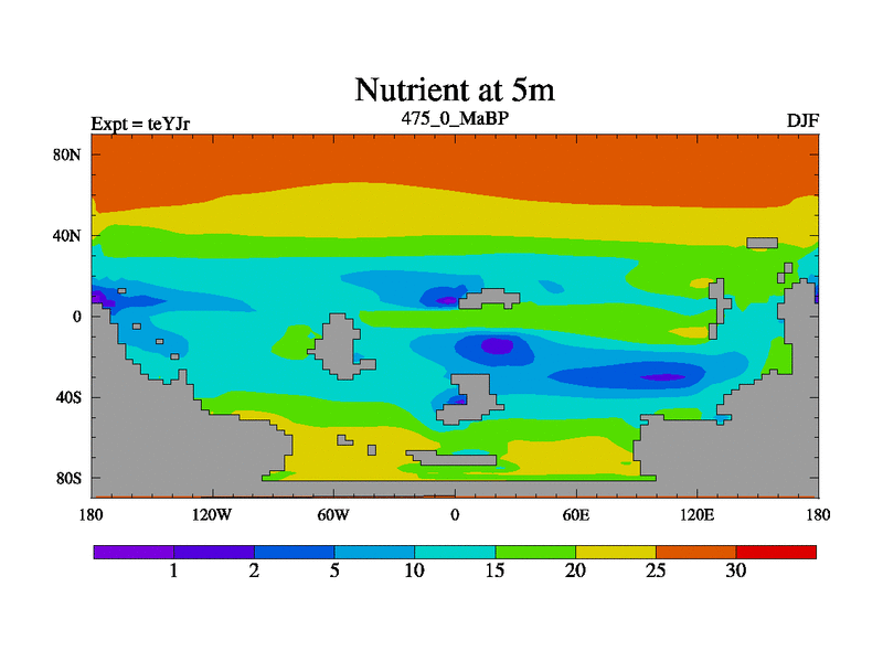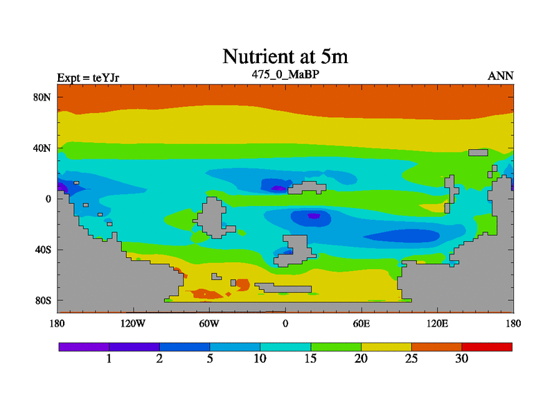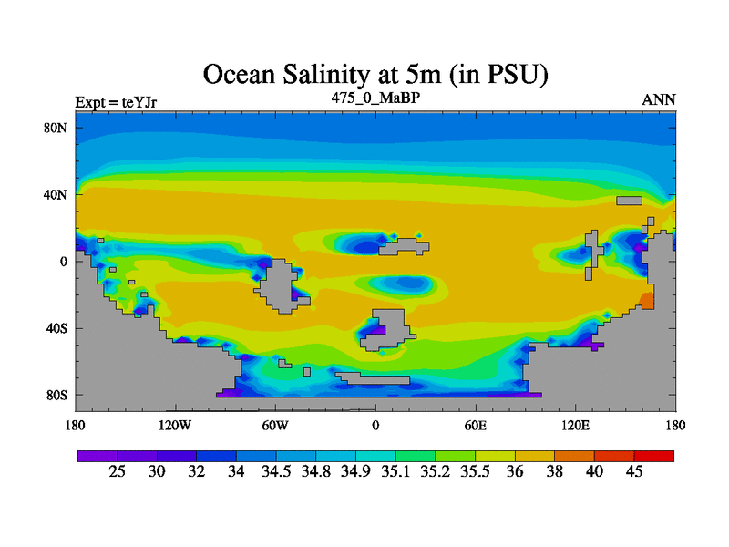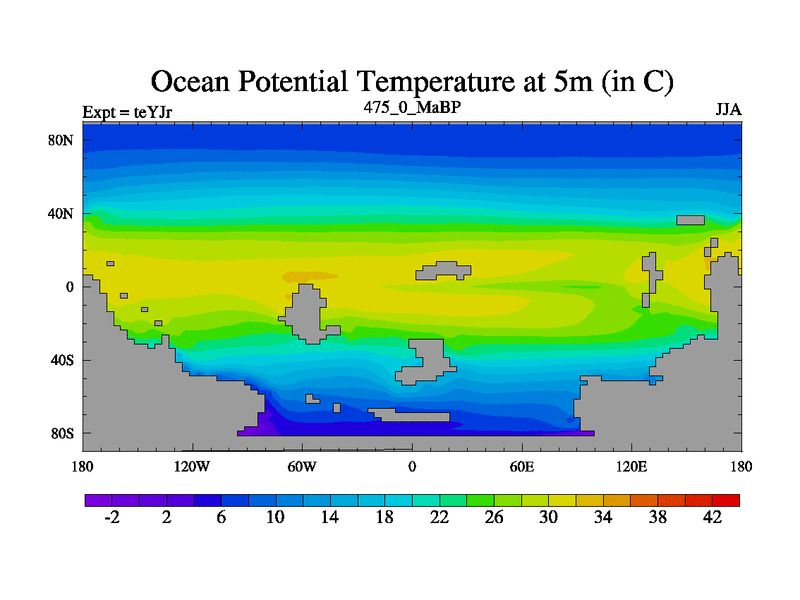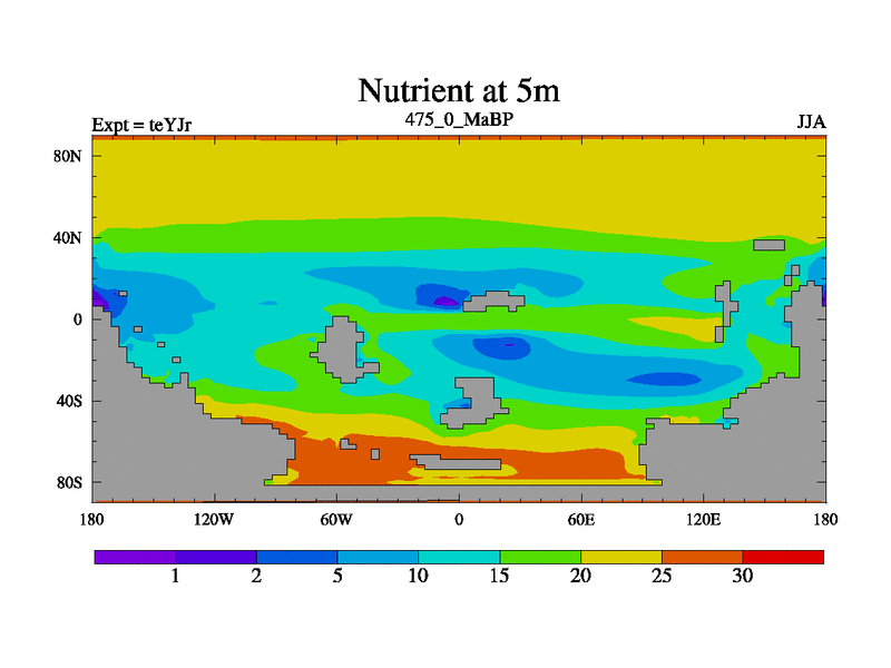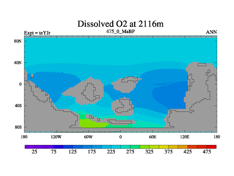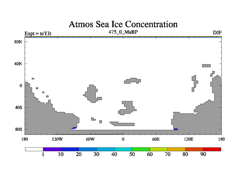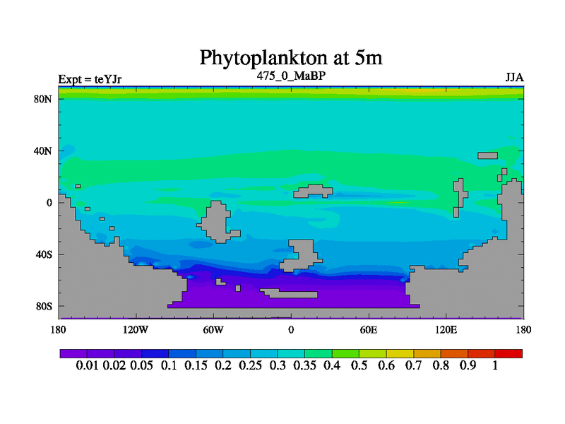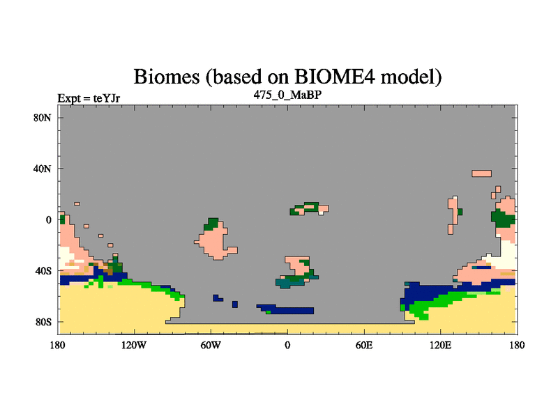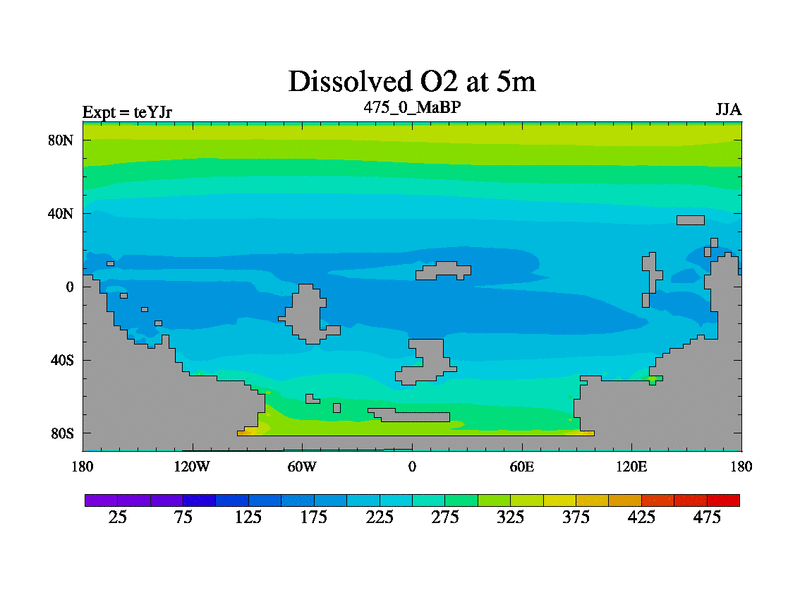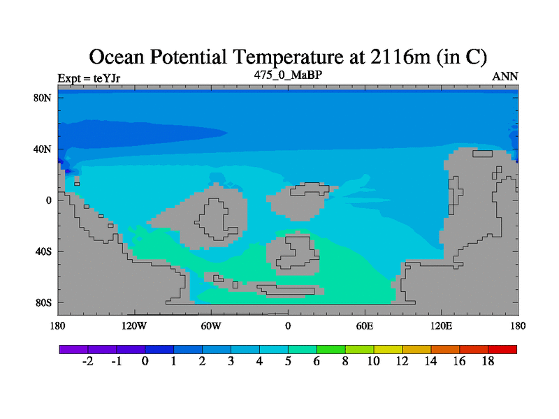This is the 475.0 Ma simulation using the Scotese palaeogeographies and revised CCN etc. As teyfa3 but corrected orography problem over Antartartica. Now includes ocean biogeochemistry