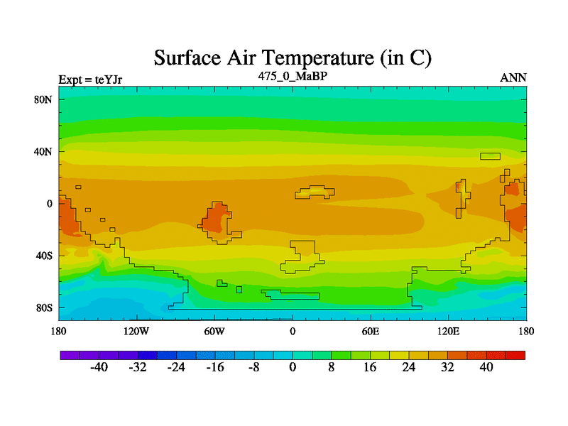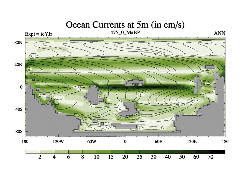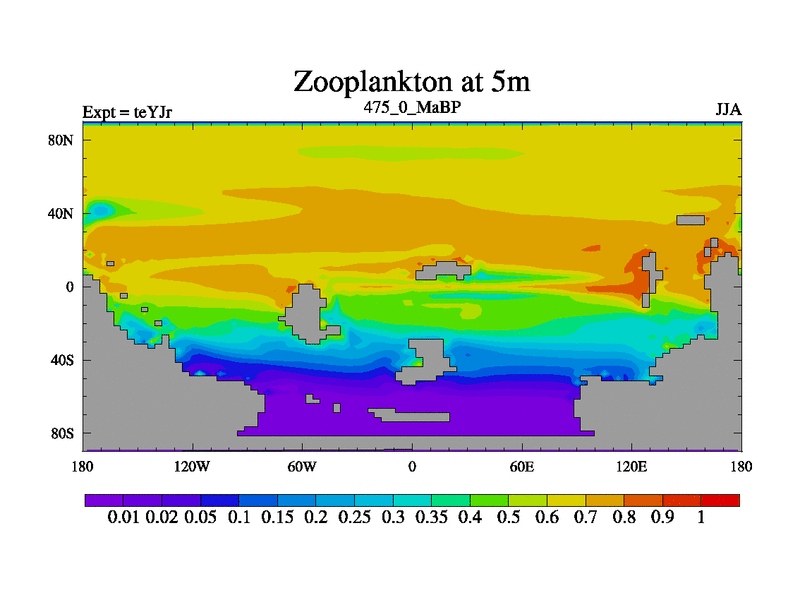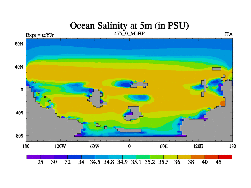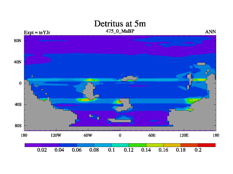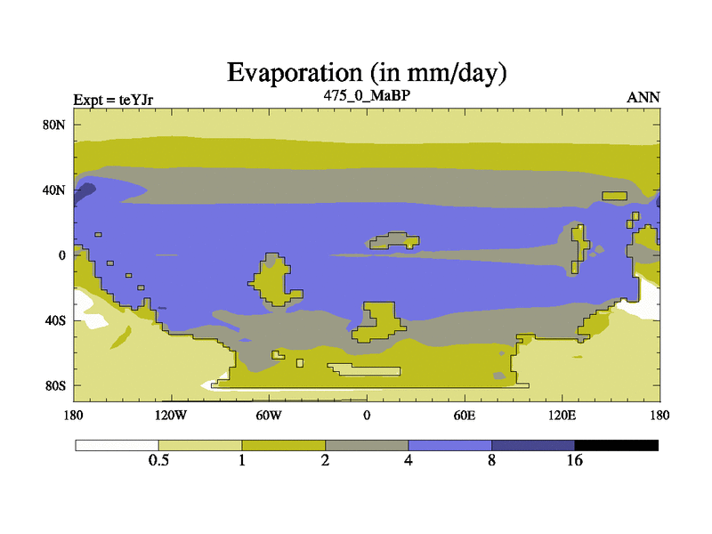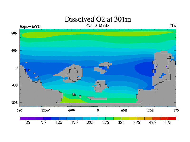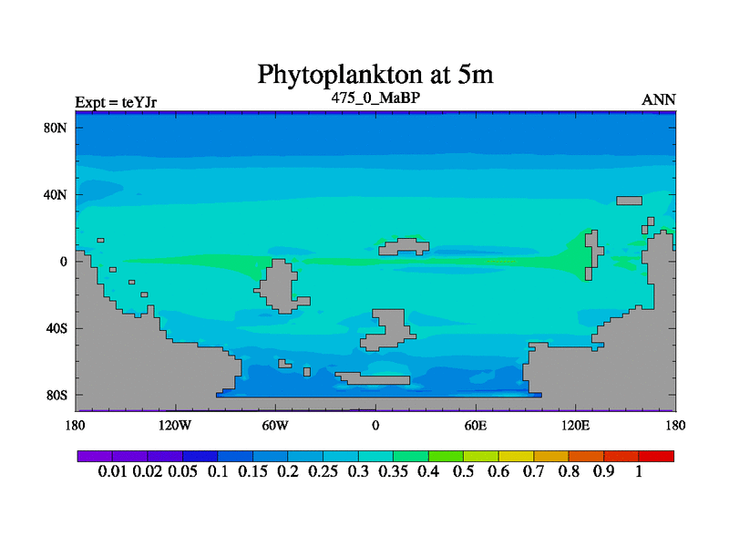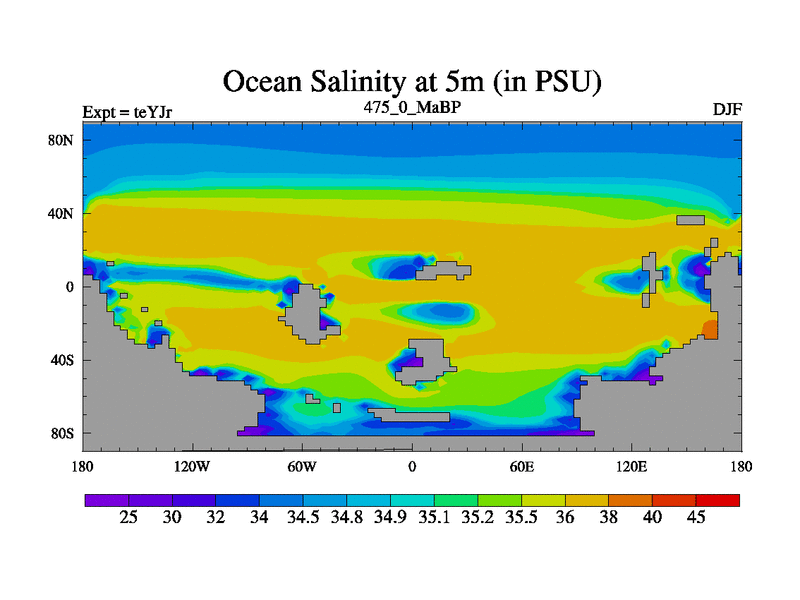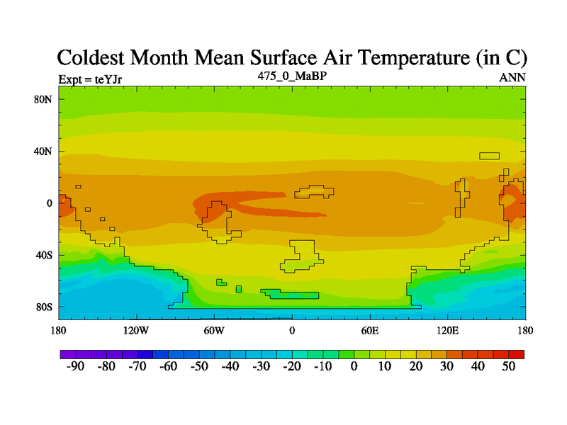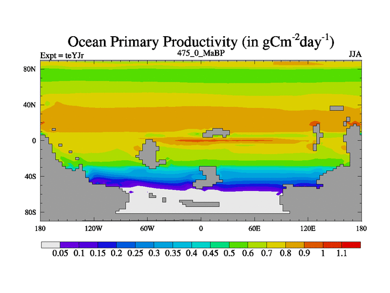 This is the 475.0 Ma simulation using the Scotese palaeogeographies and revised CCN etc. As teyfa3 but corrected orography problem over Antartartica. Now includes ocean biogeochemistry