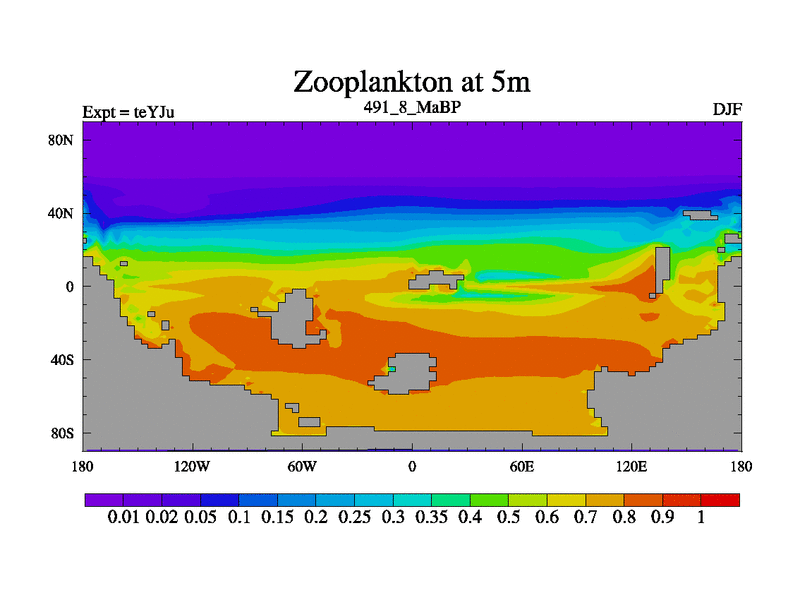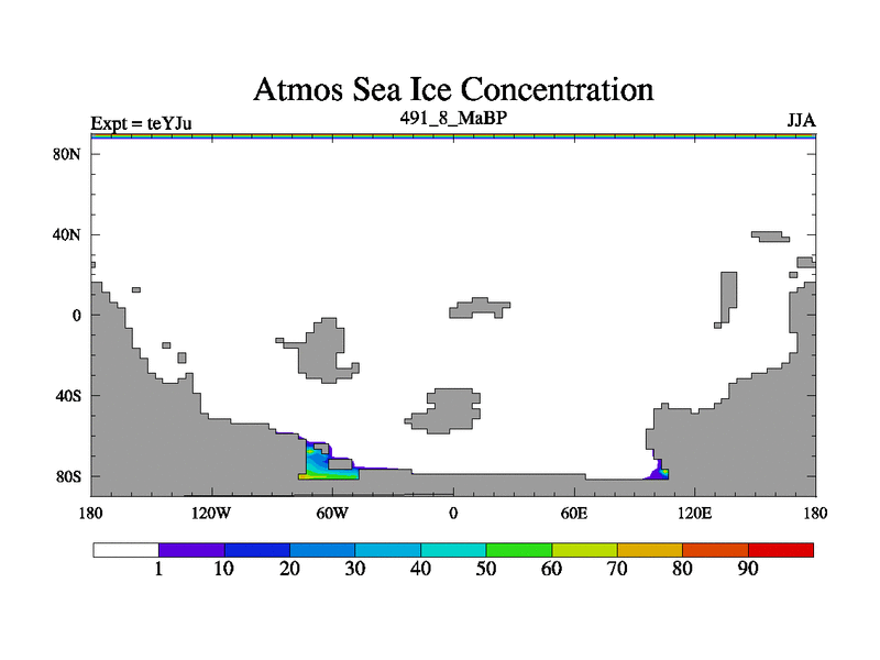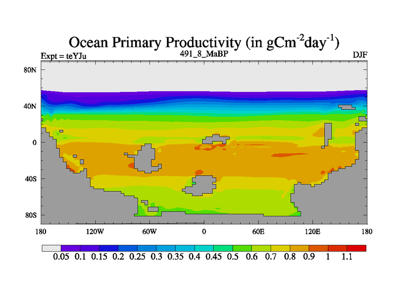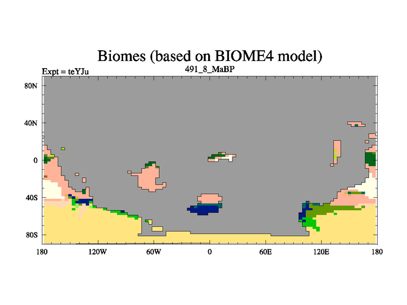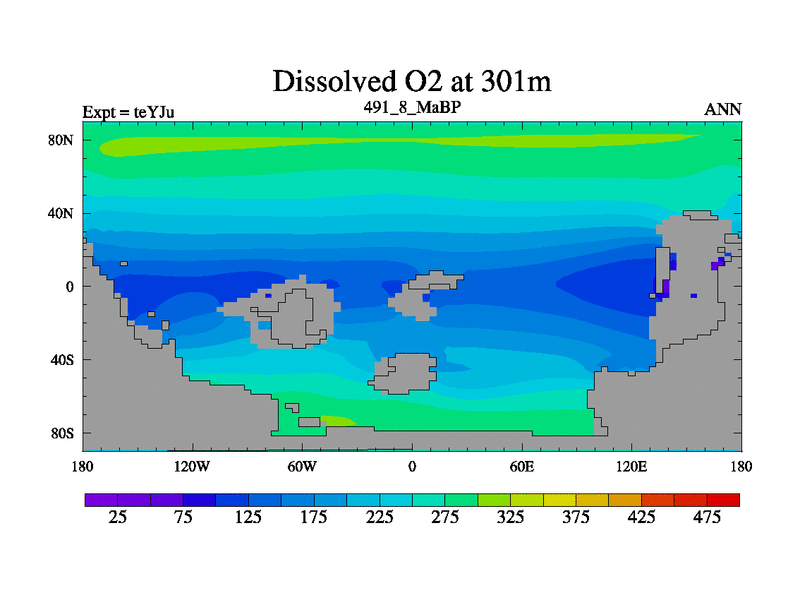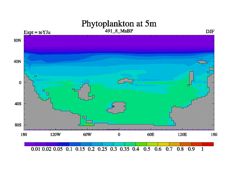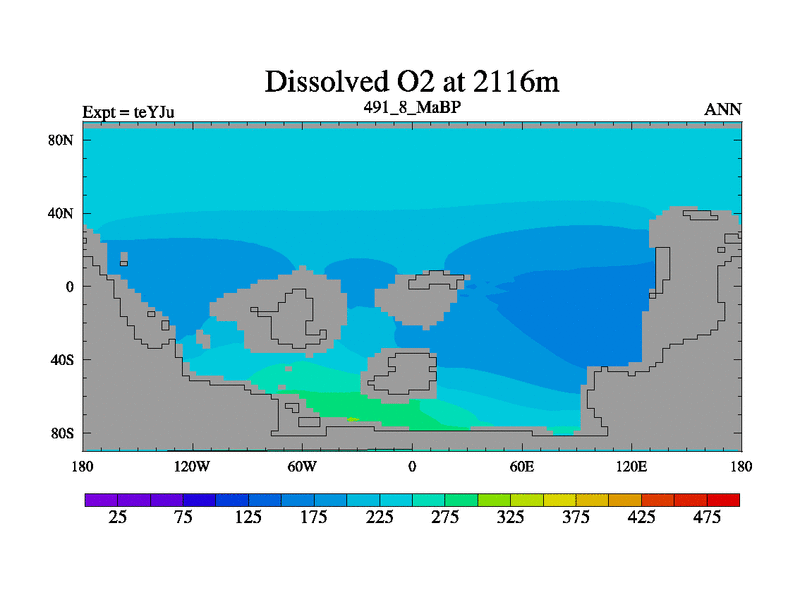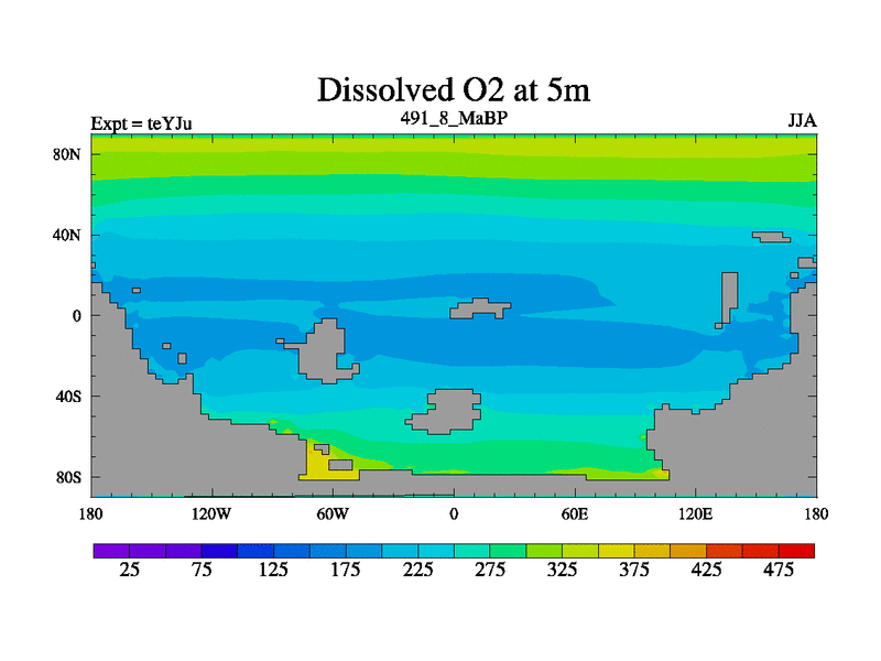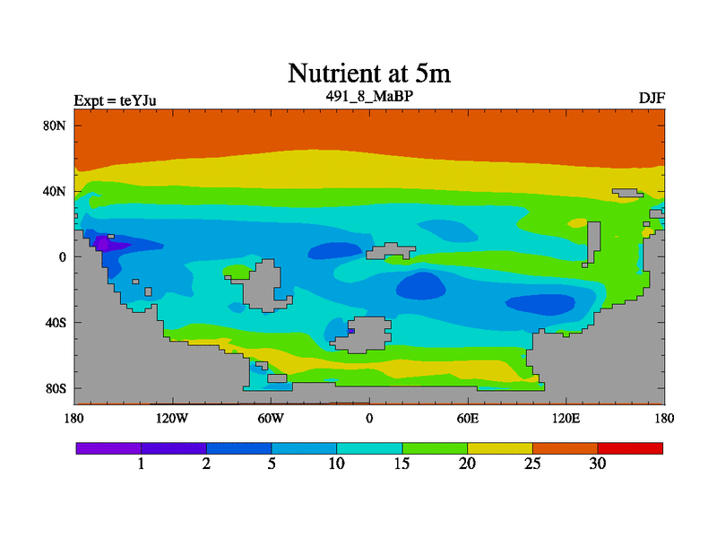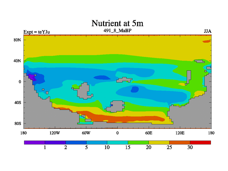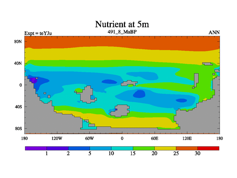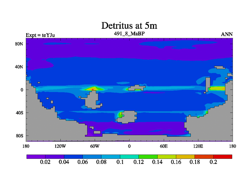 This is the 491.8 Ma simulation using the Scotese palaeogeographies and revised CCN etc. As teyfa3 but corrected orography problem over Antartartica. Now includes ocean biogeochemistry
