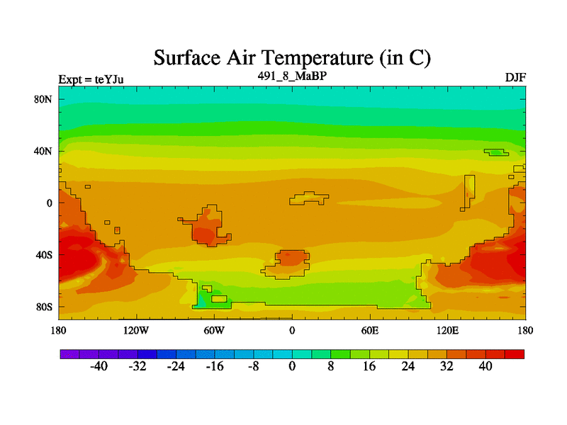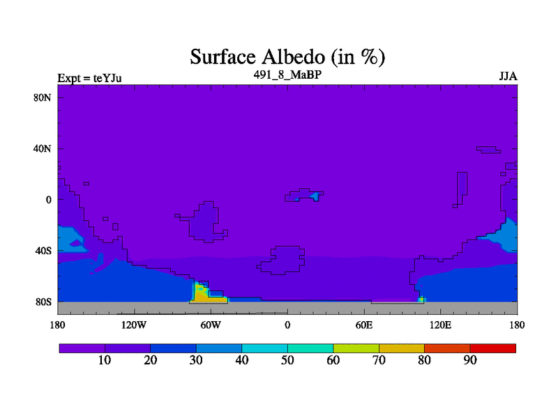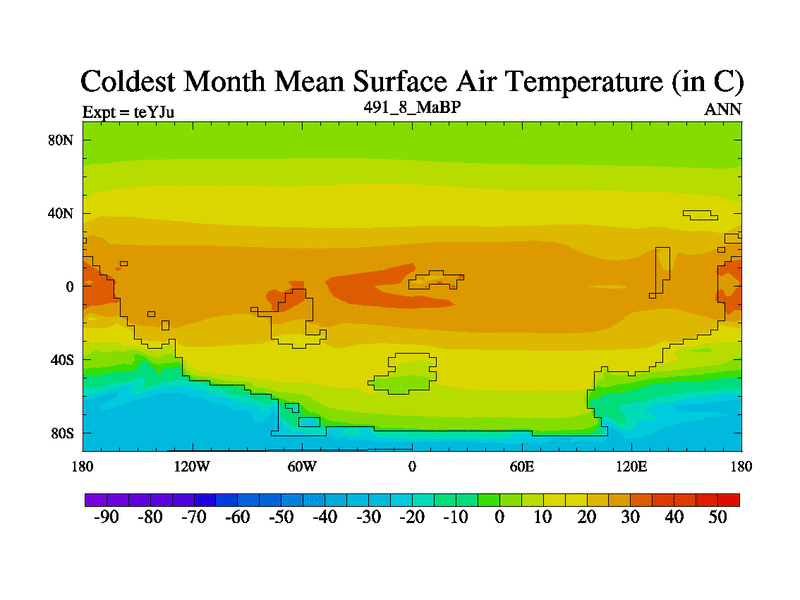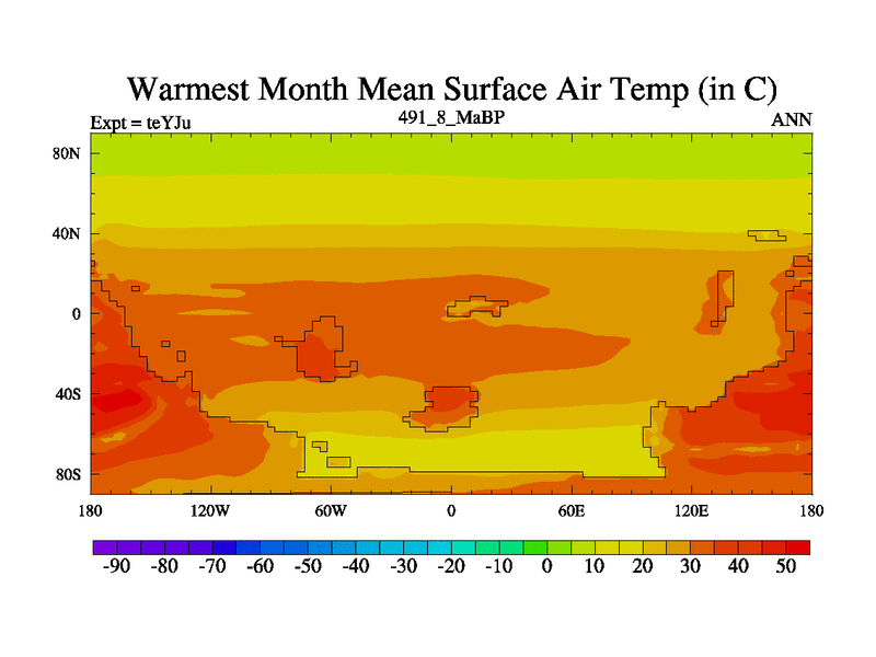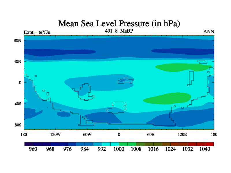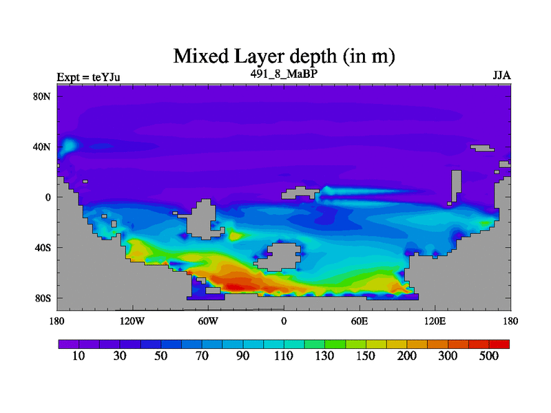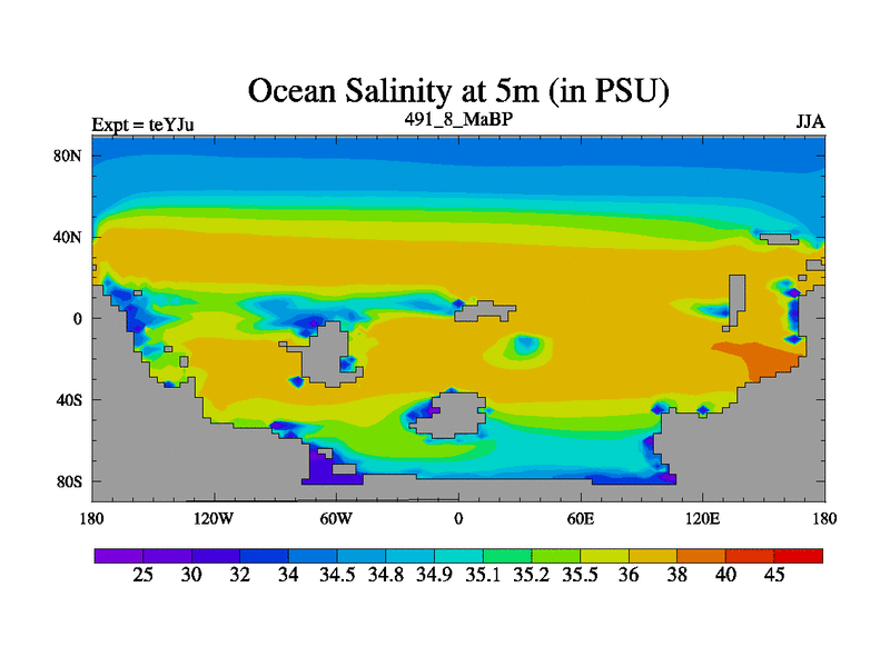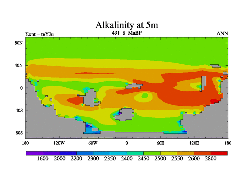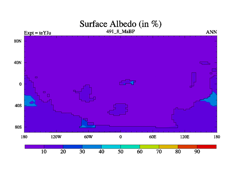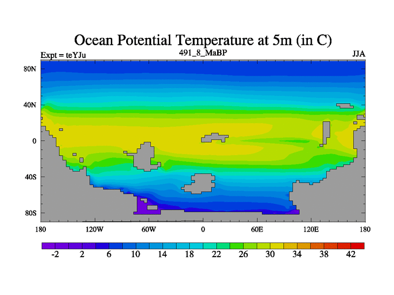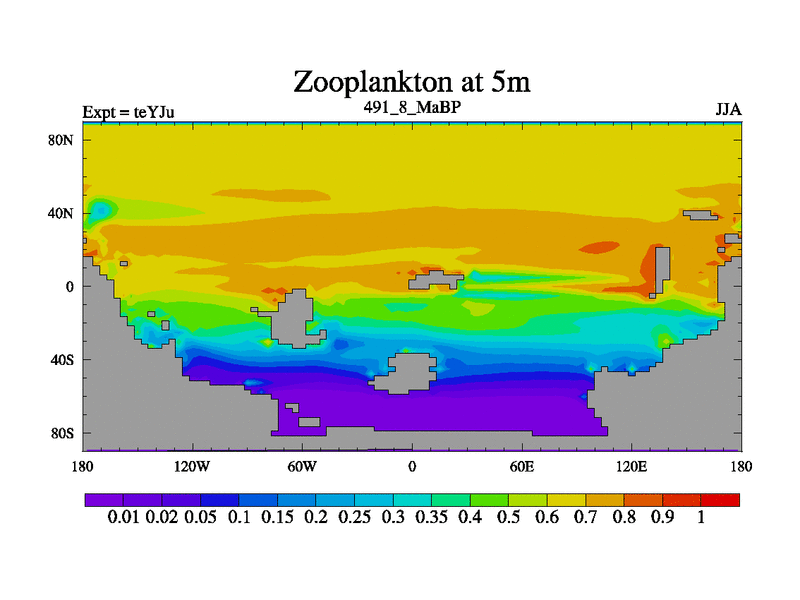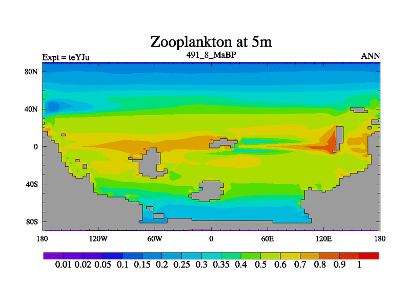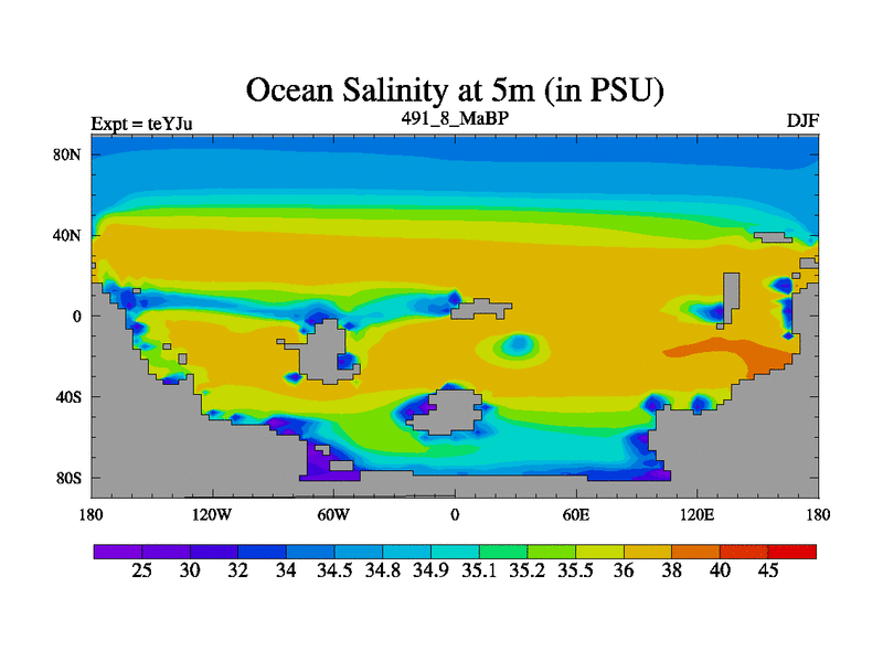 This is the 491.8 Ma simulation using the Scotese palaeogeographies and revised CCN etc. As teyfa3 but corrected orography problem over Antartartica. Now includes ocean biogeochemistry