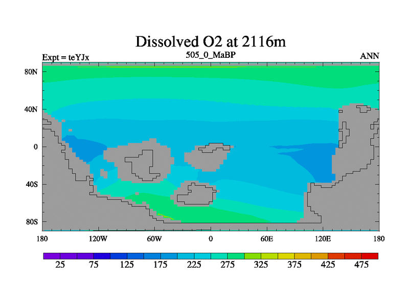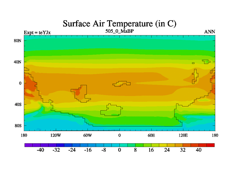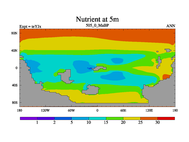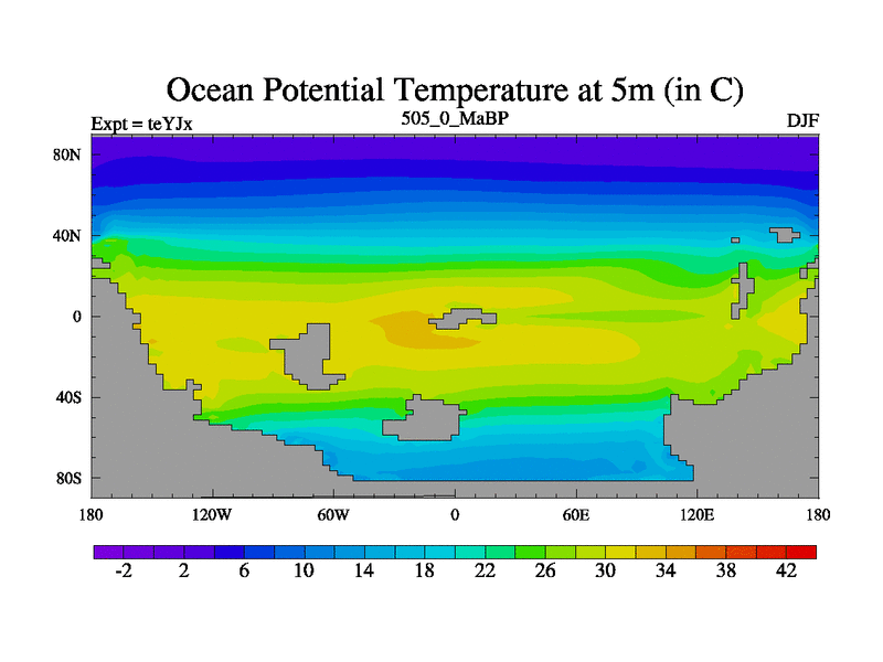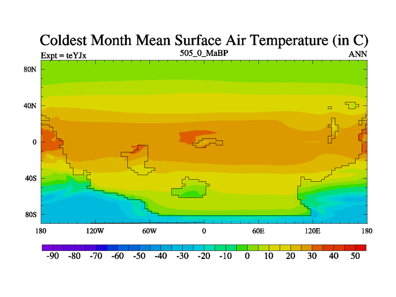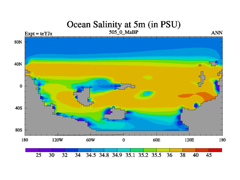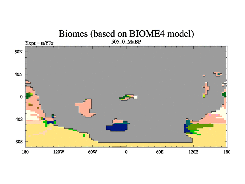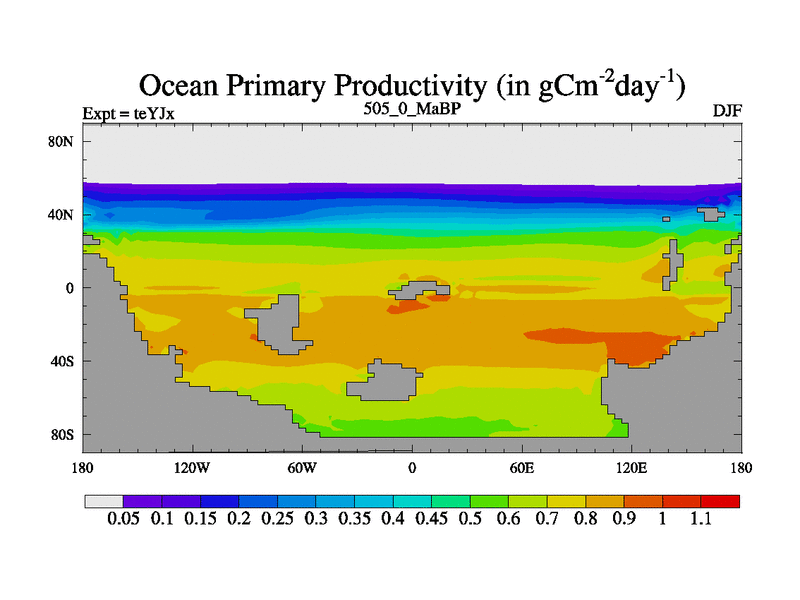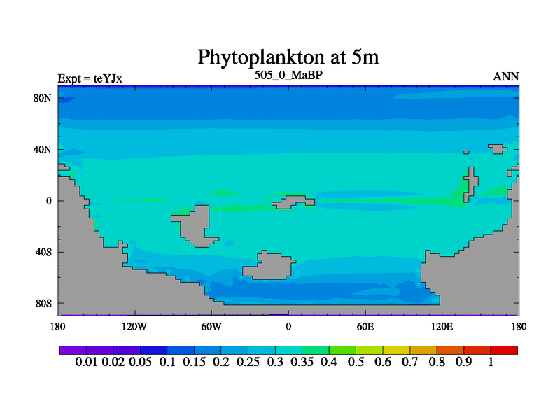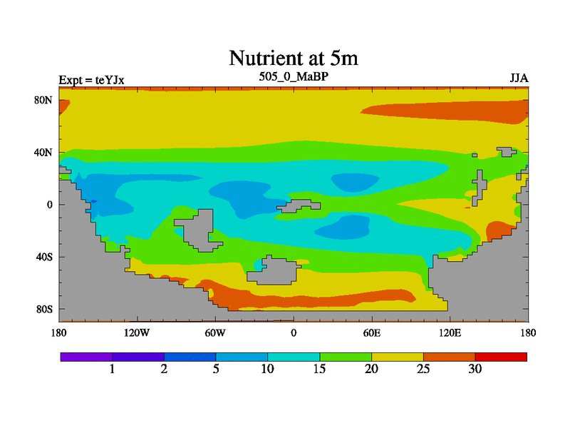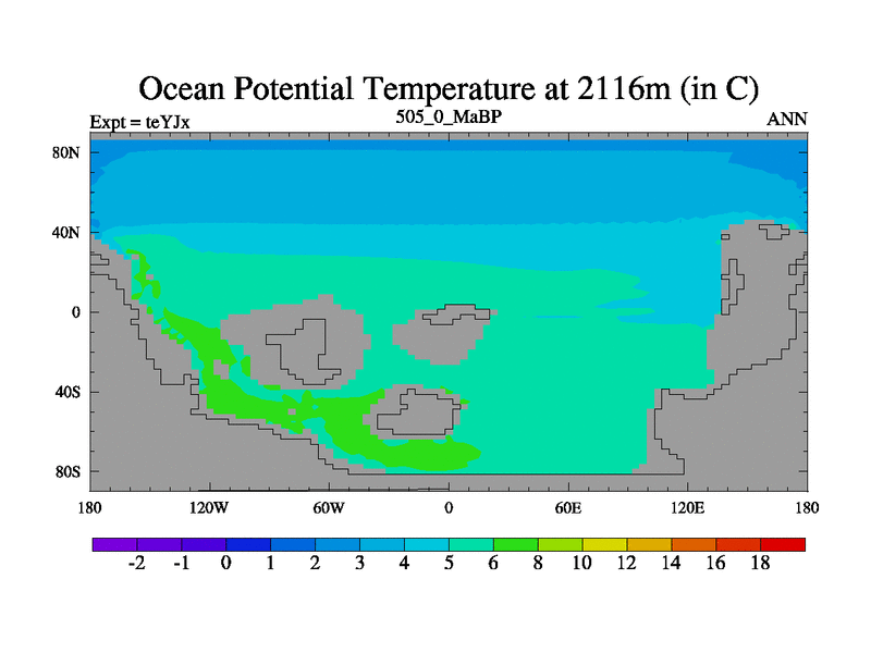 This is the 505.0 Ma simulation using the Scotese palaeogeographies and revised CCN etc. As teyfa3 but corrected orography problem over Antartartica. Now includes ocean biogeochemistry