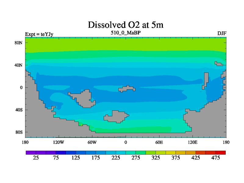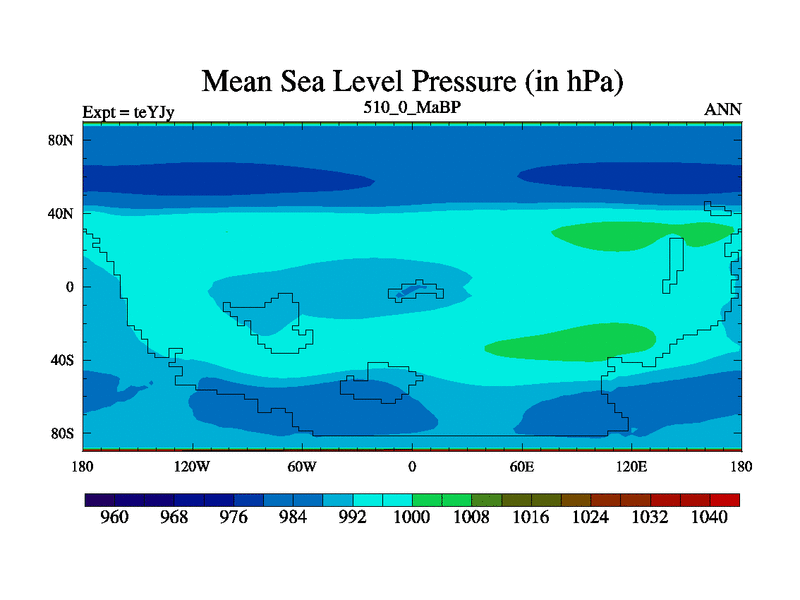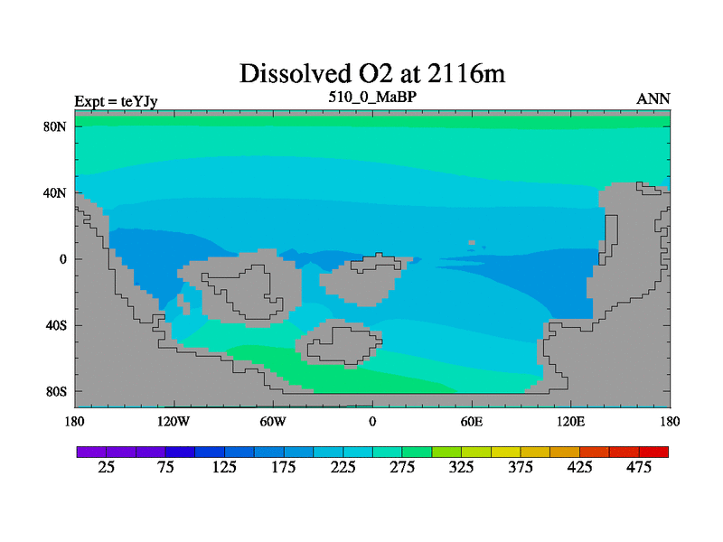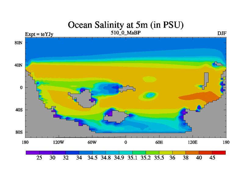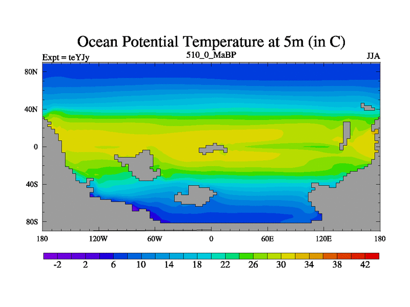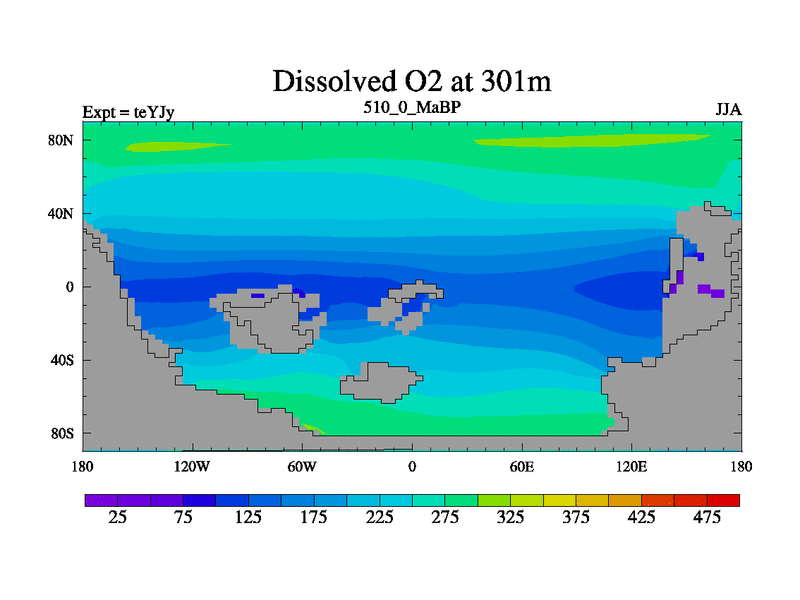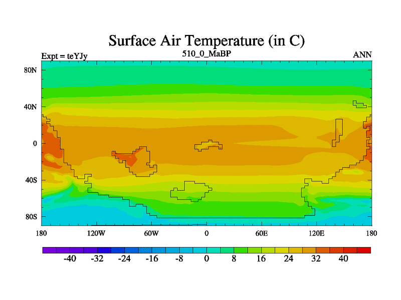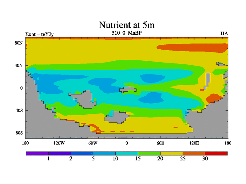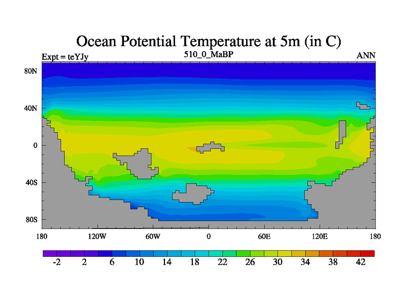 This is the 510.0 Ma simulation using the Scotese palaeogeographies and revised CCN etc. As teyfa3 but corrected orography problem over Antartartica. Now includes ocean biogeochemistry