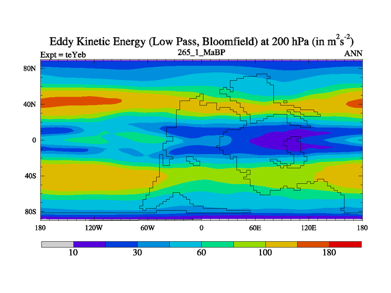 Low Pass Eddy Kinetic Energy at 200 hPa