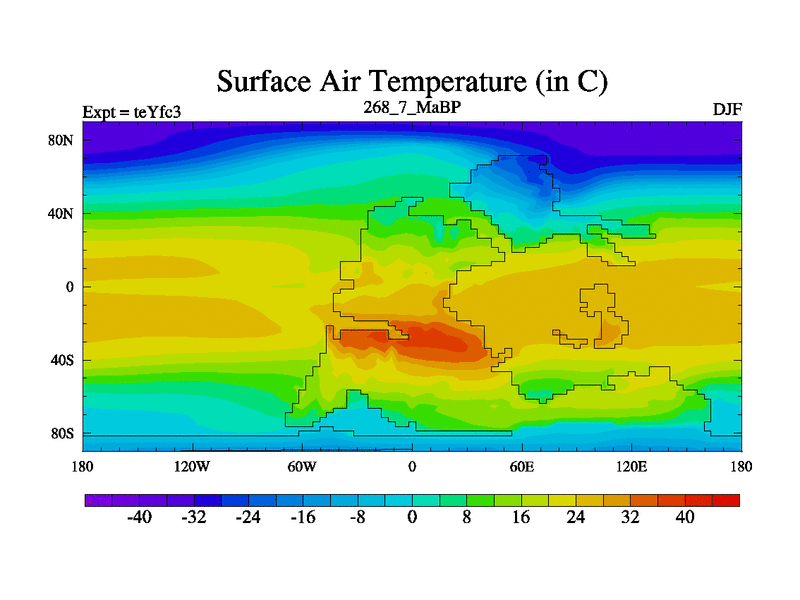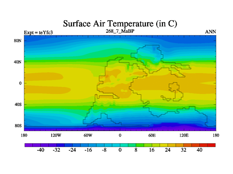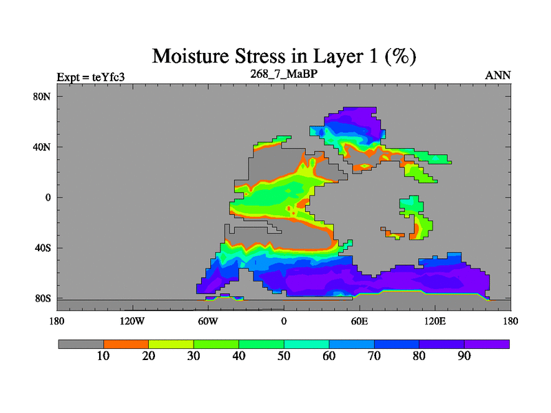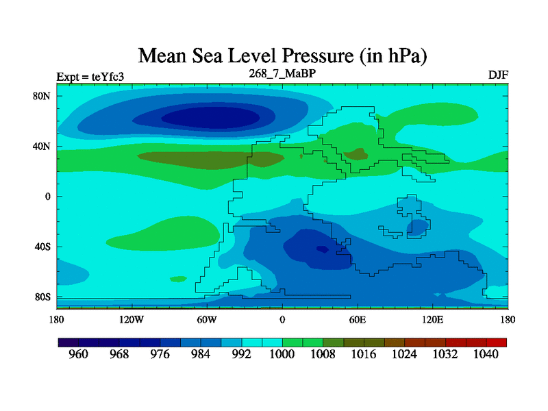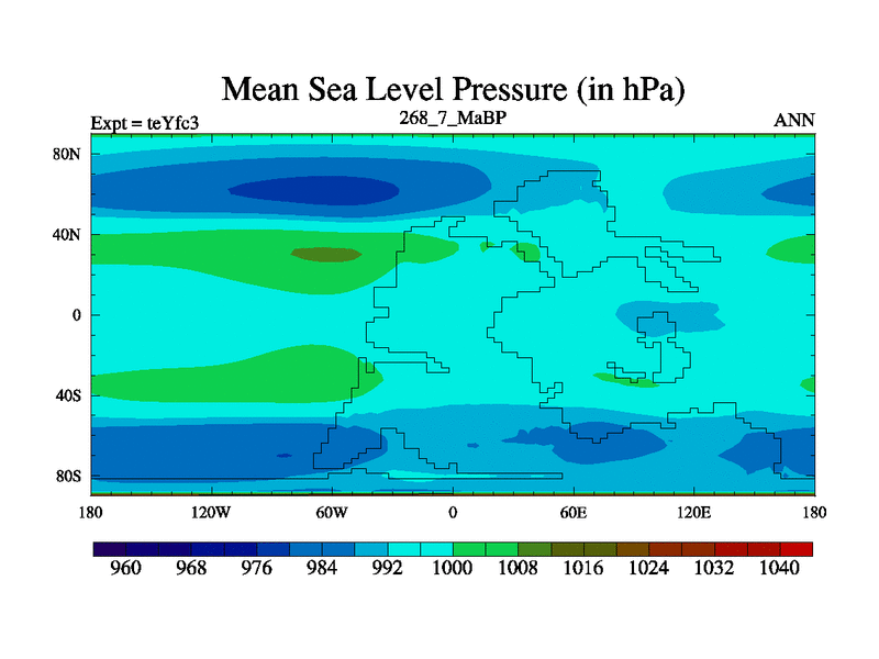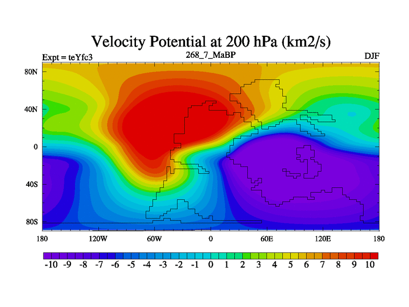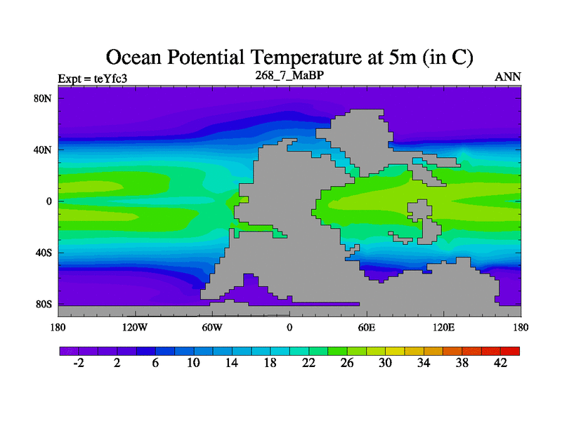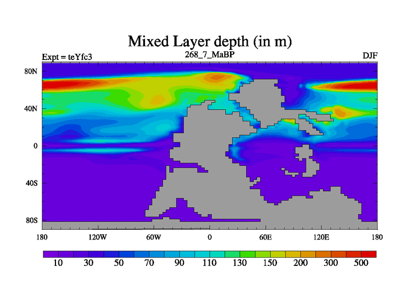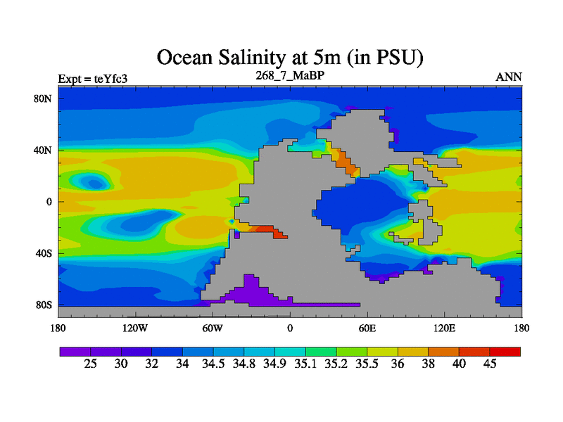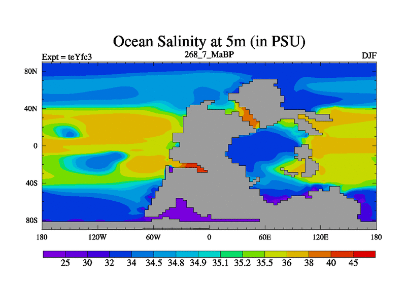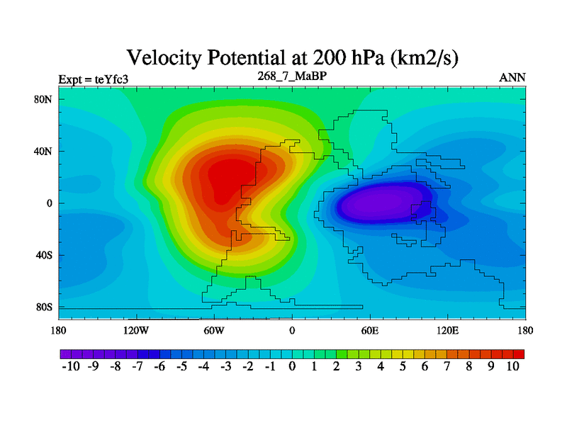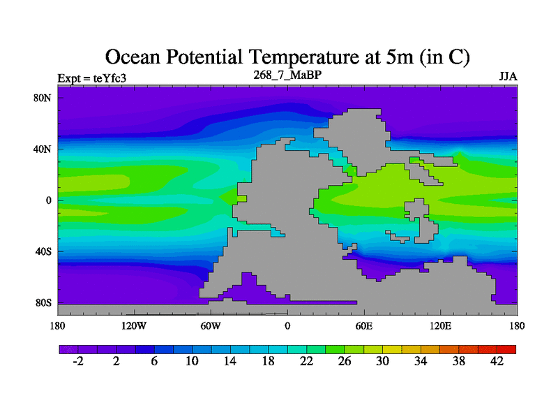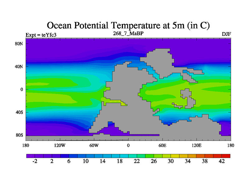 This is the 268.7 Ma simulation using the Scotese palaeogeographies and revised CCN etc. Updated HadCM3L ocean parameters and soil parameters. Also made sure orography gravity wave drag was consistent.