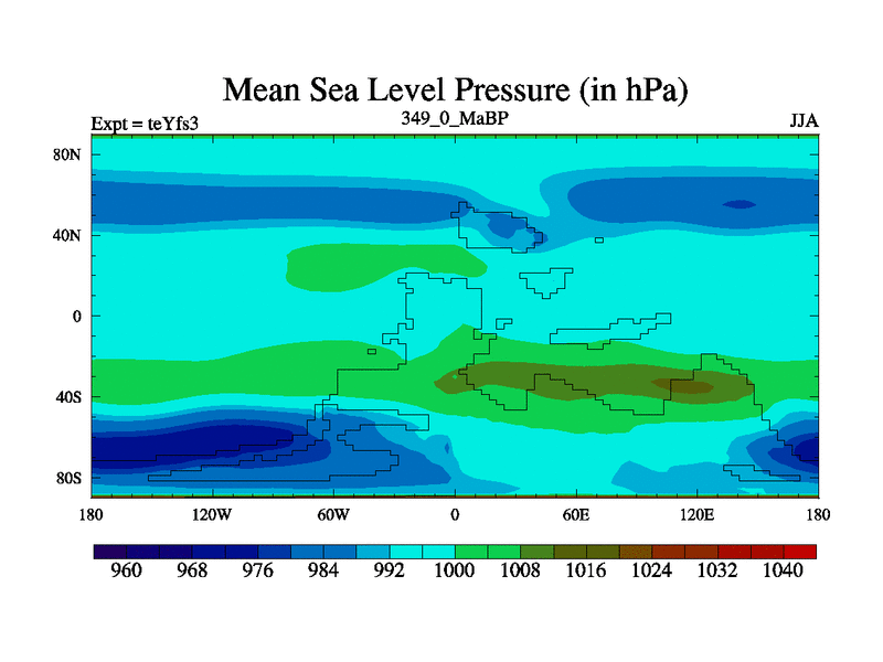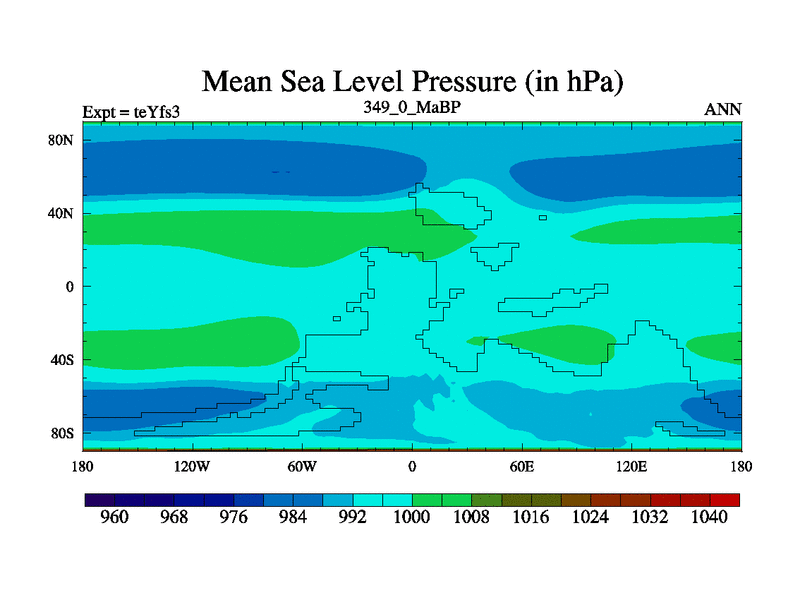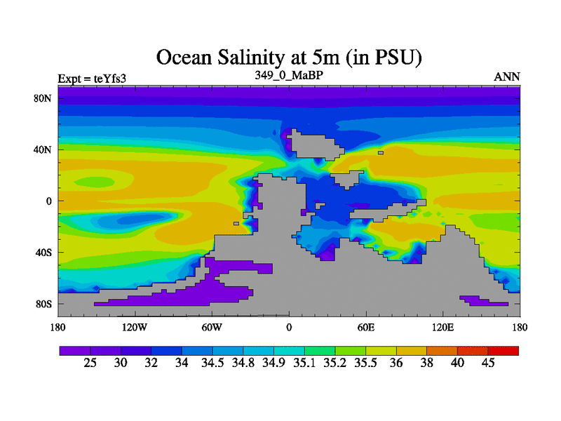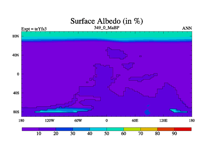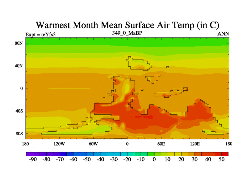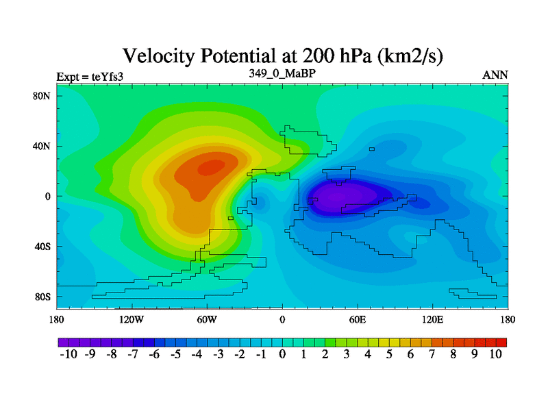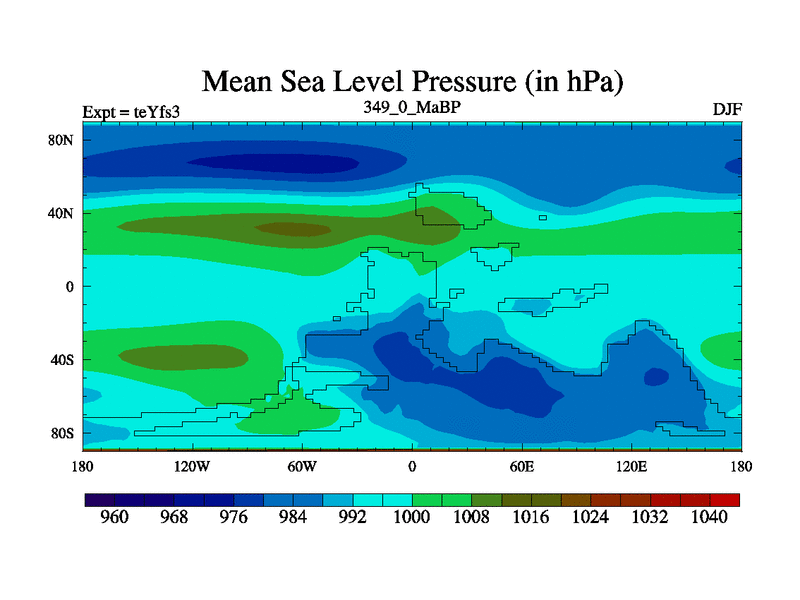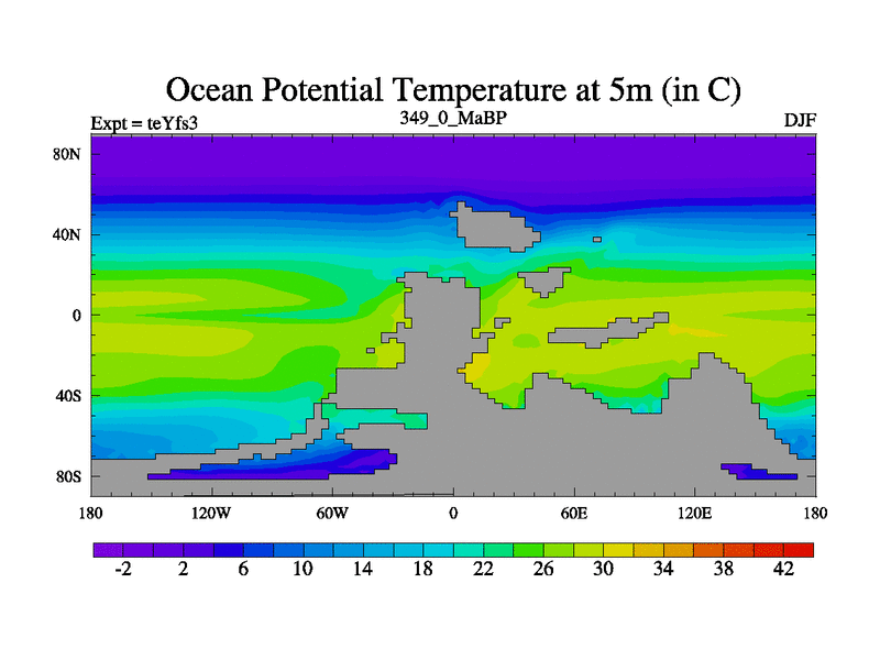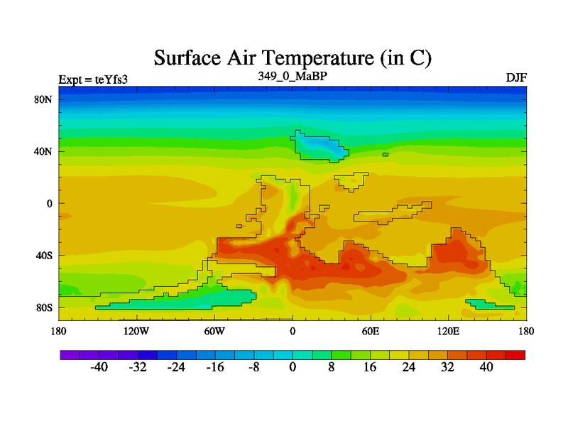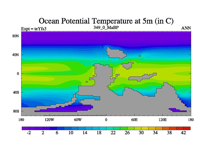 This is the 349.0 Ma simulation using the Scotese palaeogeographies and revised CCN etc. Updated HadCM3L ocean parameters and soil parameters. Also made sure orography gravity wave drag was consistent.