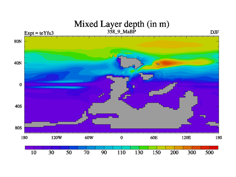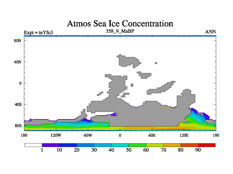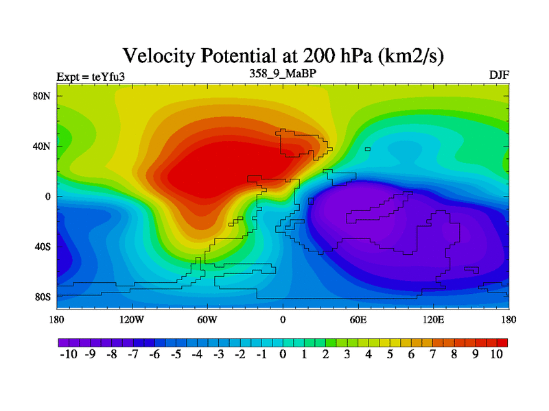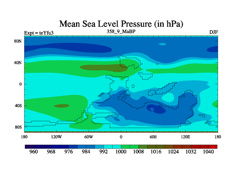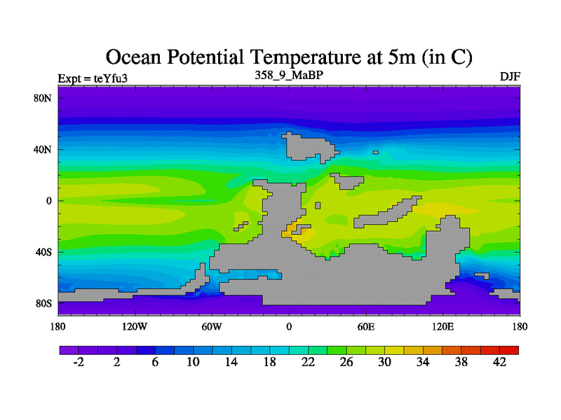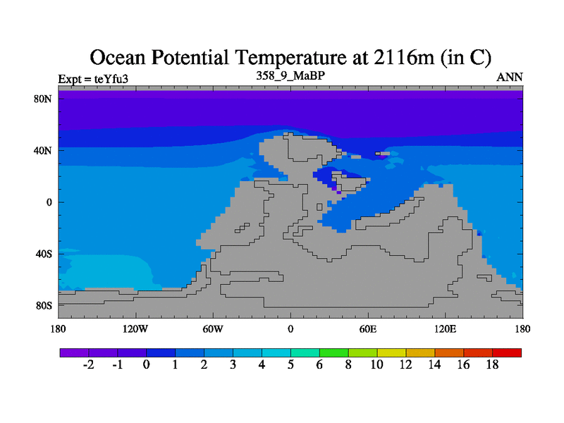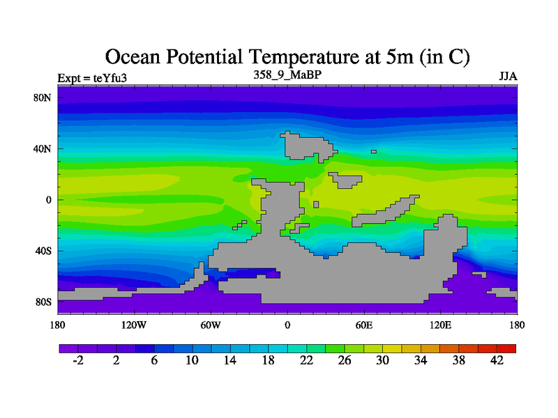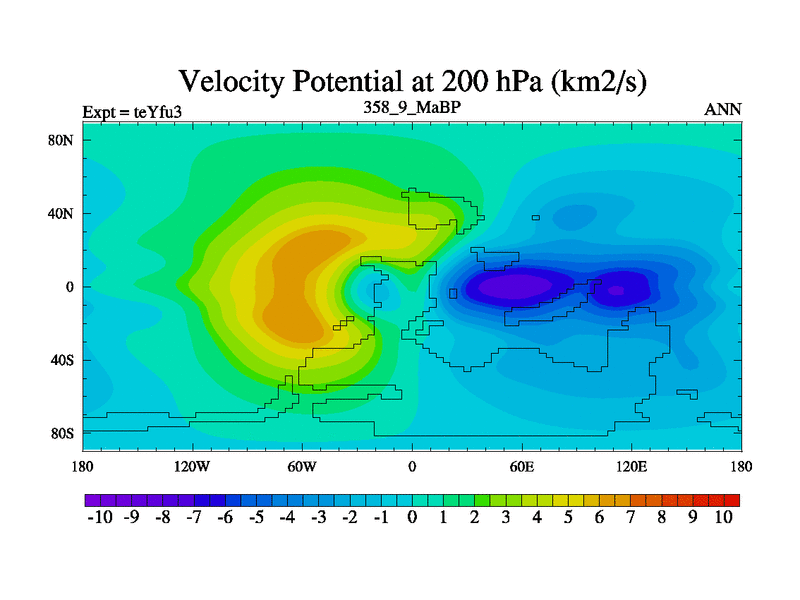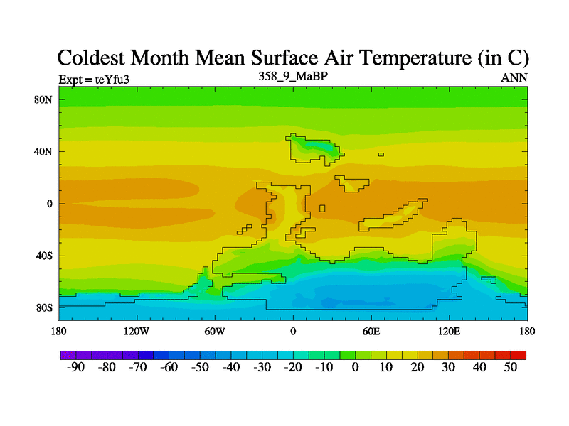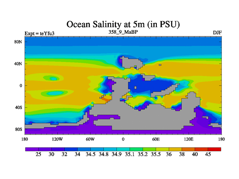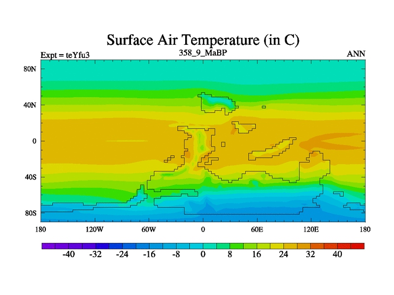 This is the 358.9 Ma simulation using the Scotese palaeogeographies and revised CCN etc. Updated HadCM3L ocean parameters and soil parameters. Also made sure orography gravity wave drag was consistent.