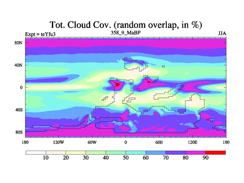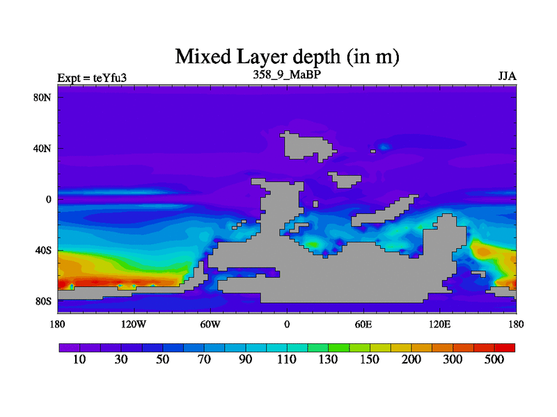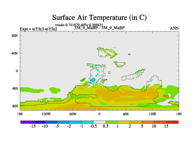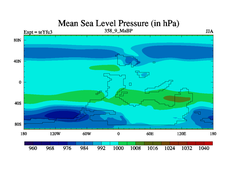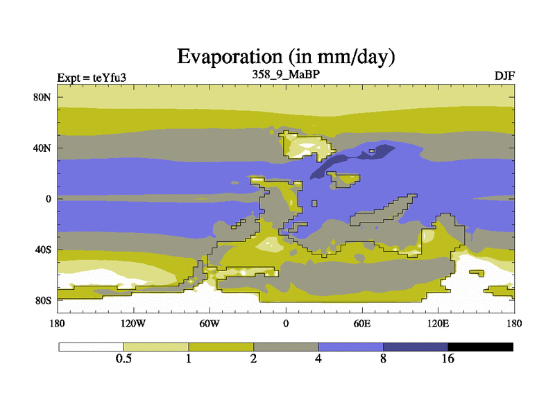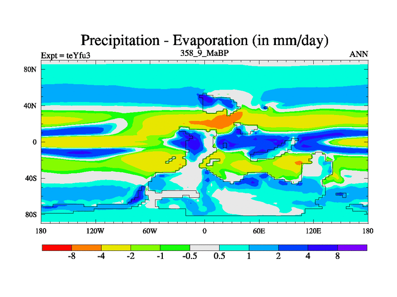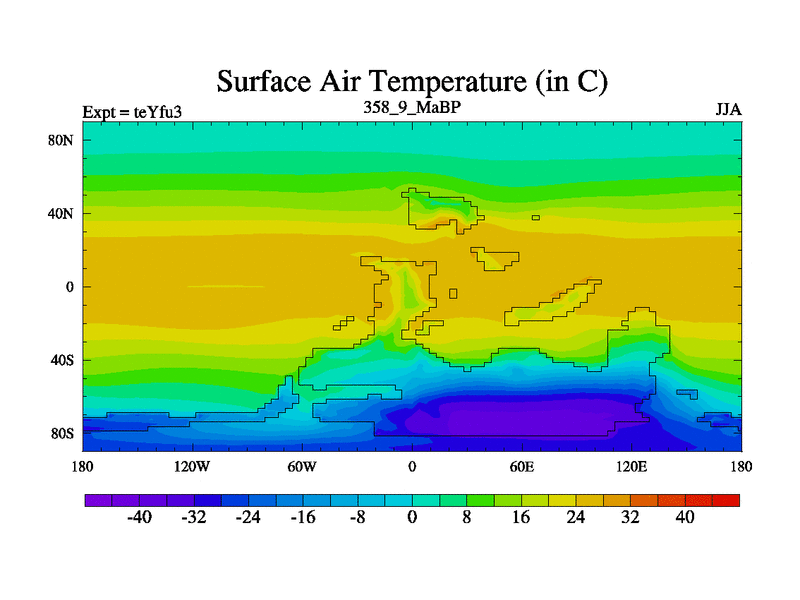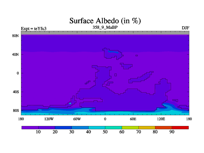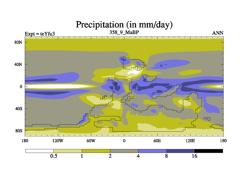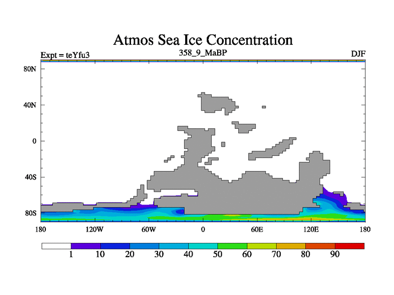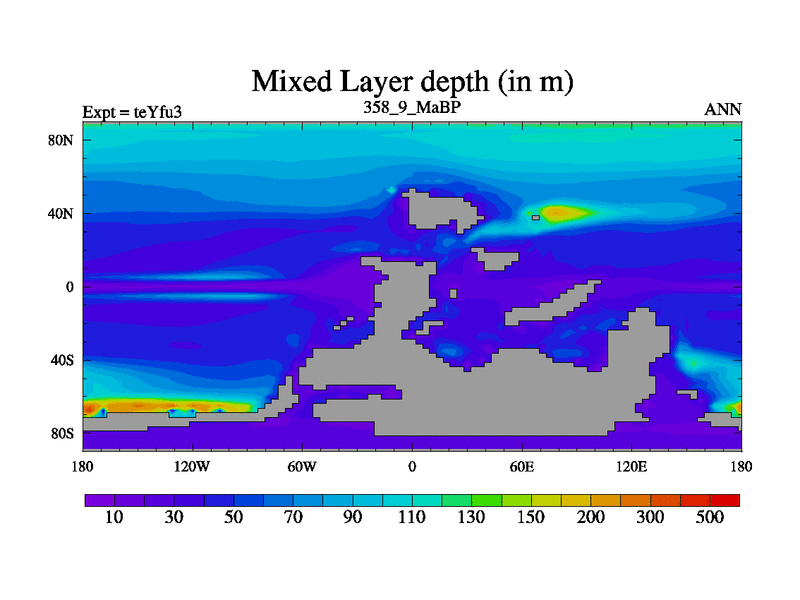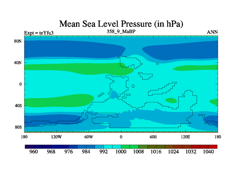 This is the 358.9 Ma simulation using the Scotese palaeogeographies and revised CCN etc. Updated HadCM3L ocean parameters and soil parameters. Also made sure orography gravity wave drag was consistent.