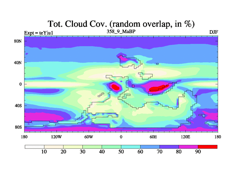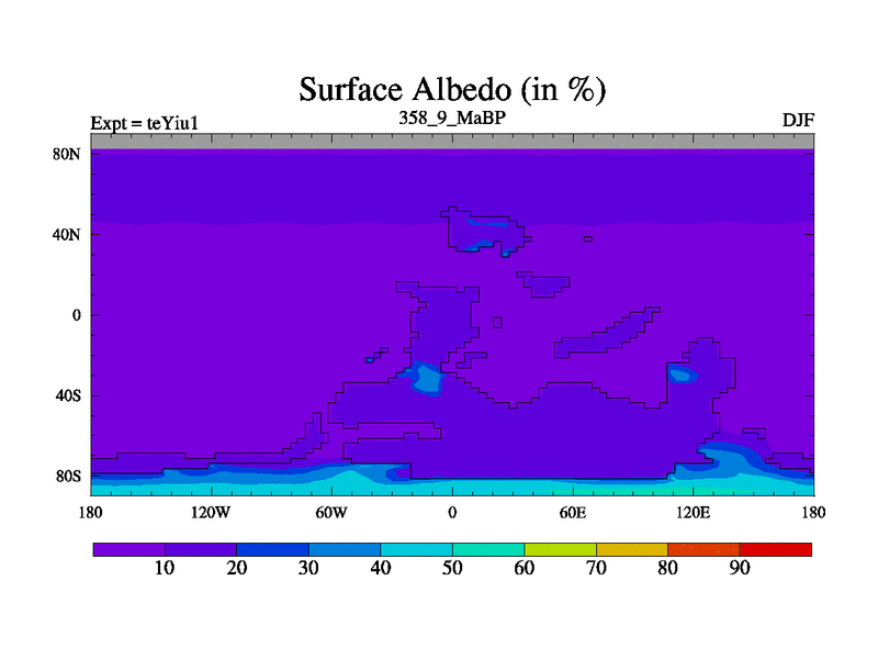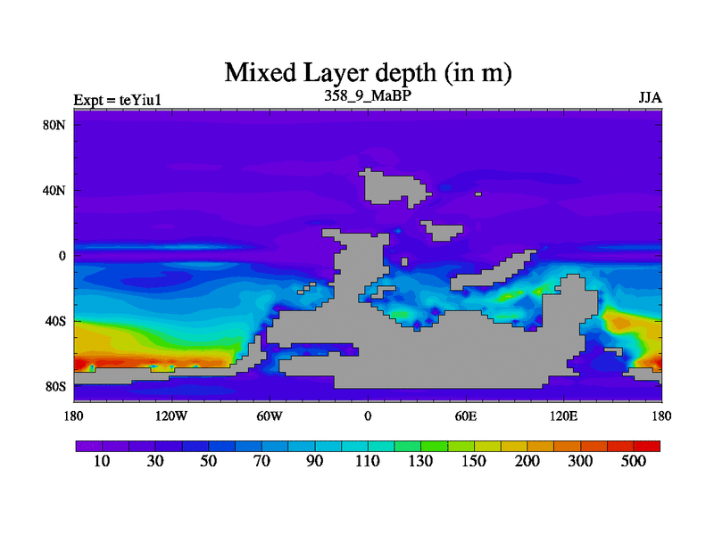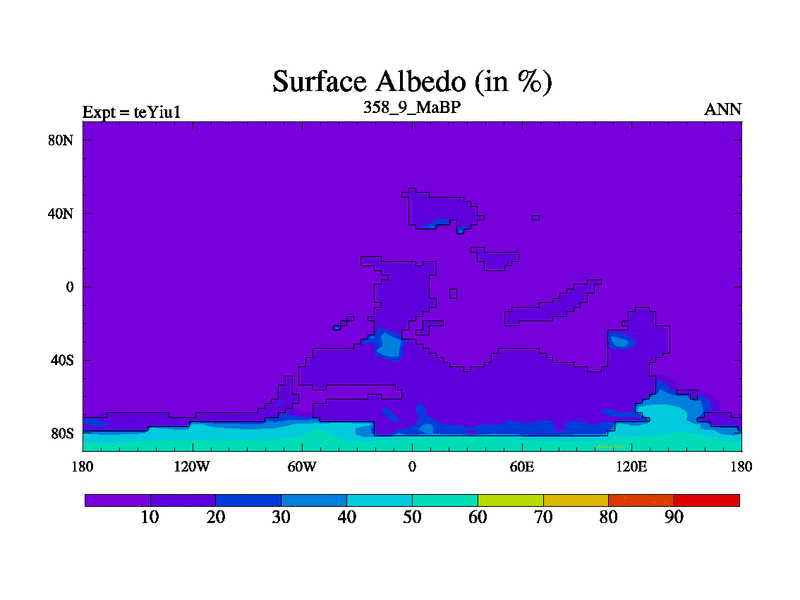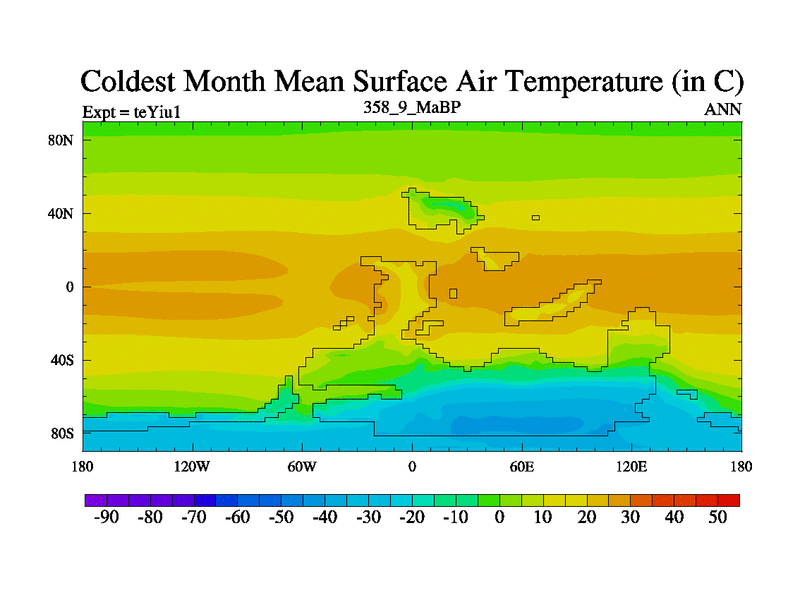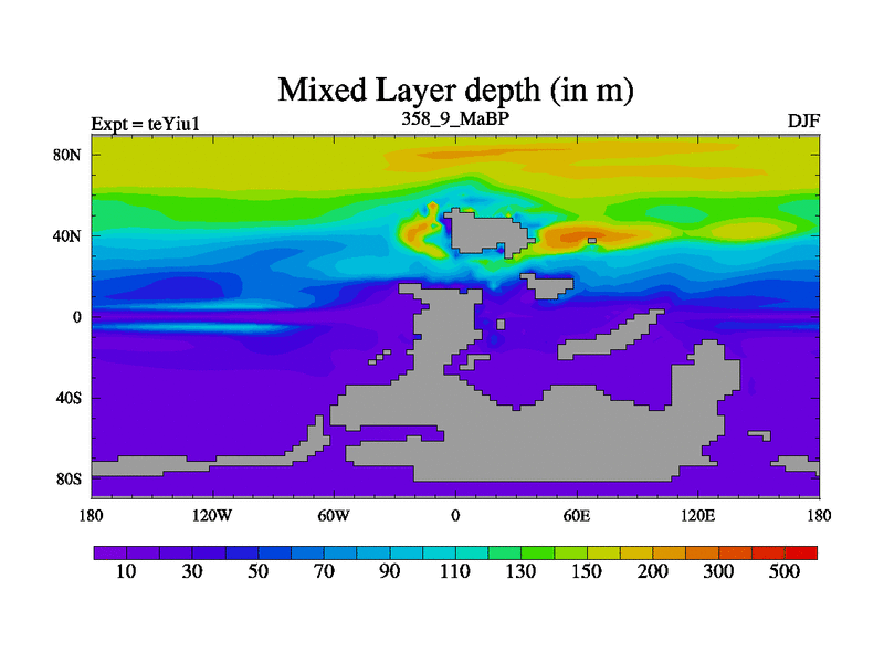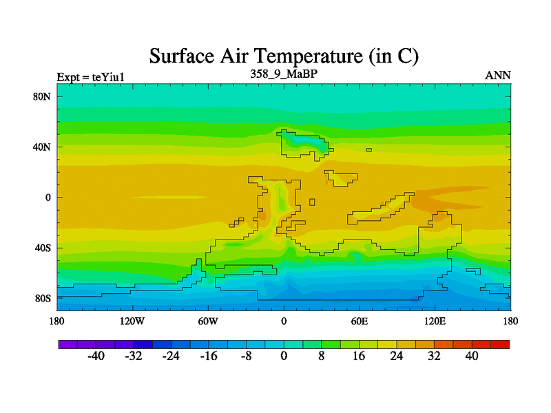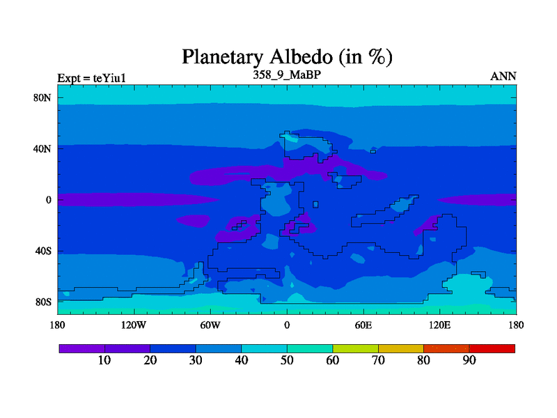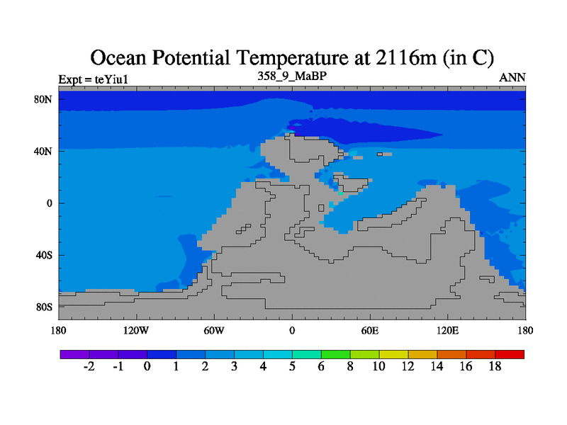 This is the 358.9 Ma simulation using the Scotese palaeogeographies and revised CCN etc. Now includes ocean biogeochemistry