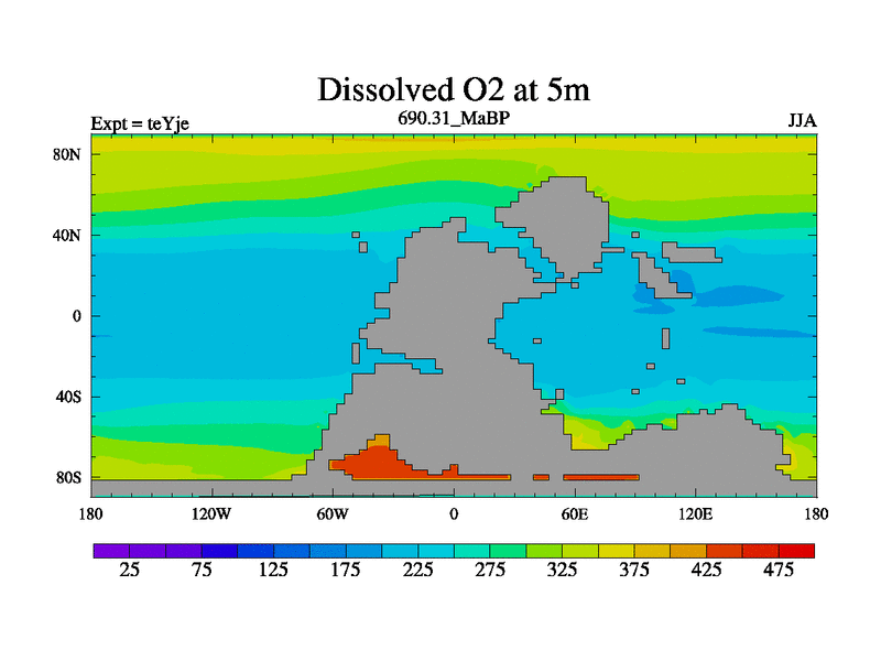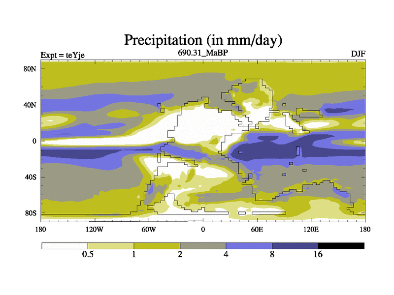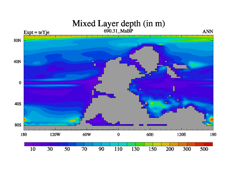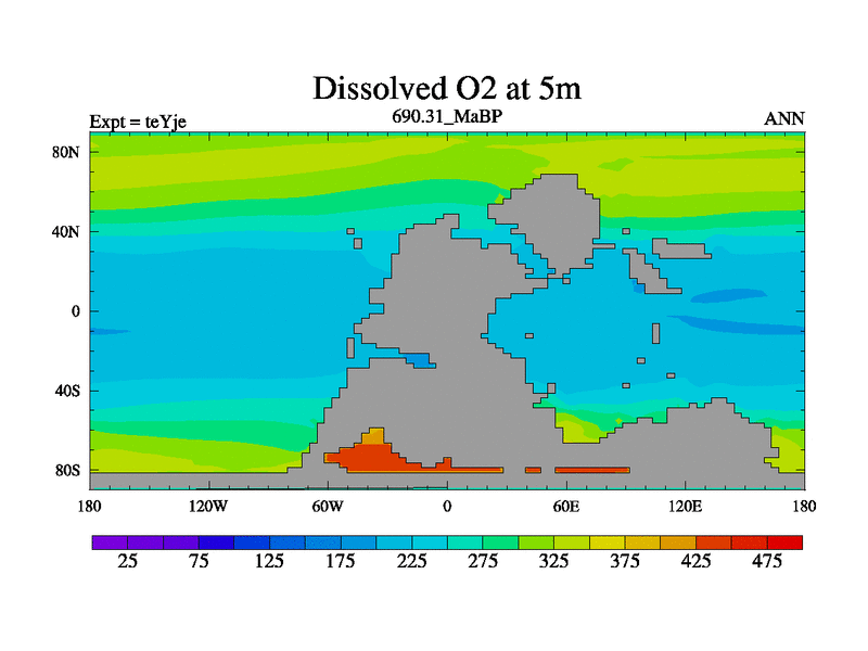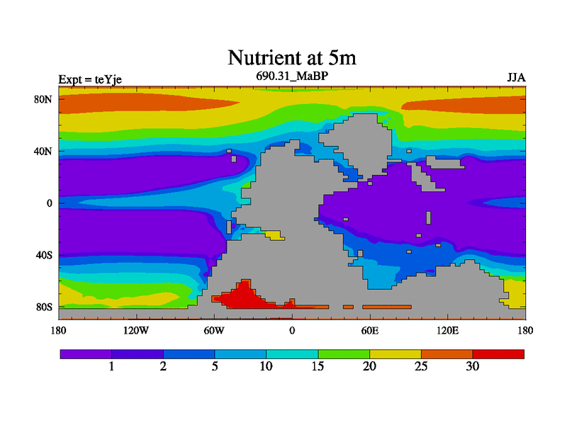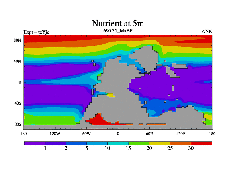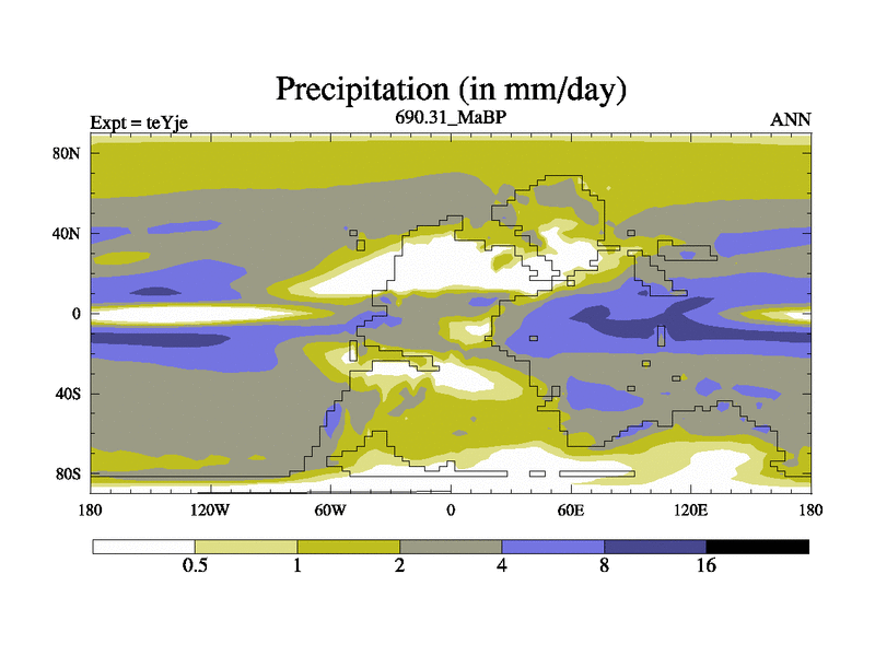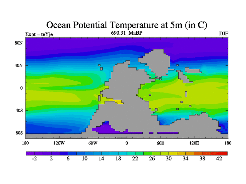 This is the 690.31 Ma simulation using the Scotese palaeogeographies and revised CCN etc. As teyfa3 but corrected orography problem over Antartartica. Now includes ocean biogeochemistry