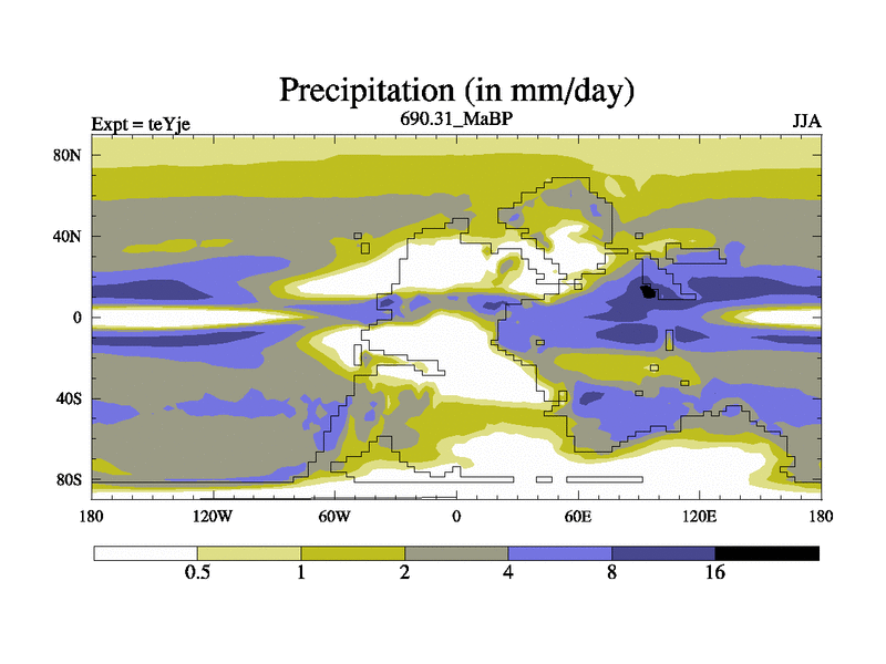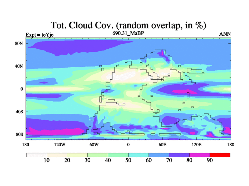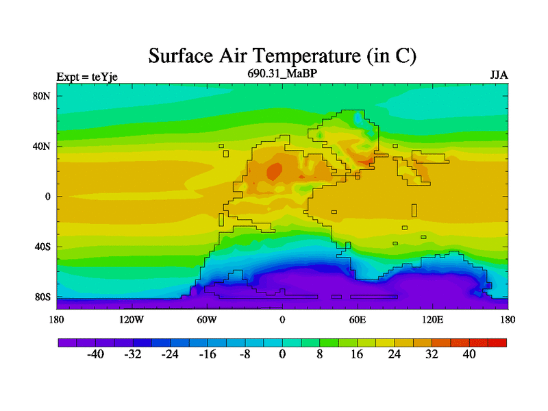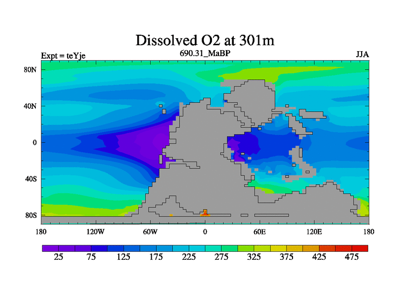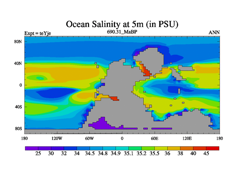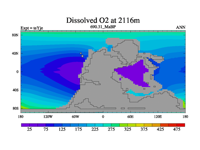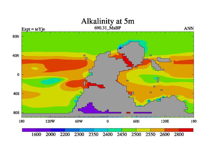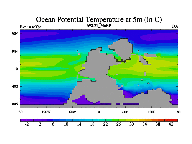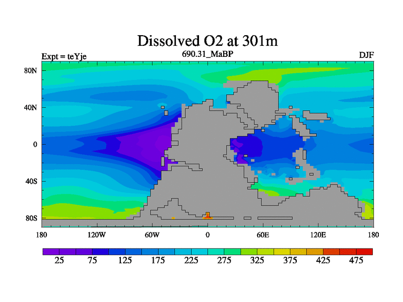 This is the 690.31 Ma simulation using the Scotese palaeogeographies and revised CCN etc. As teyfa3 but corrected orography problem over Antartartica. Now includes ocean biogeochemistry