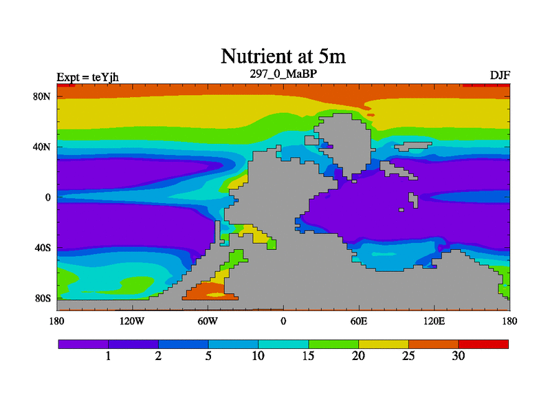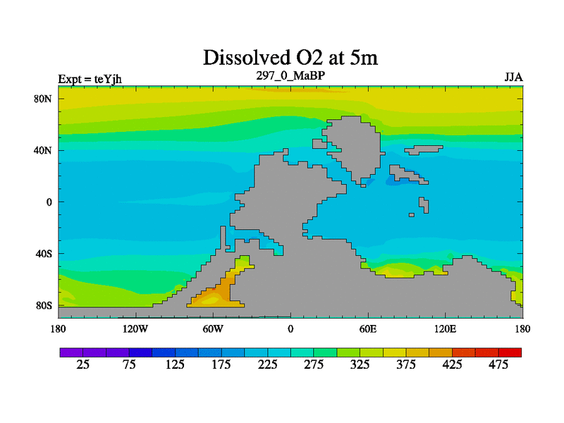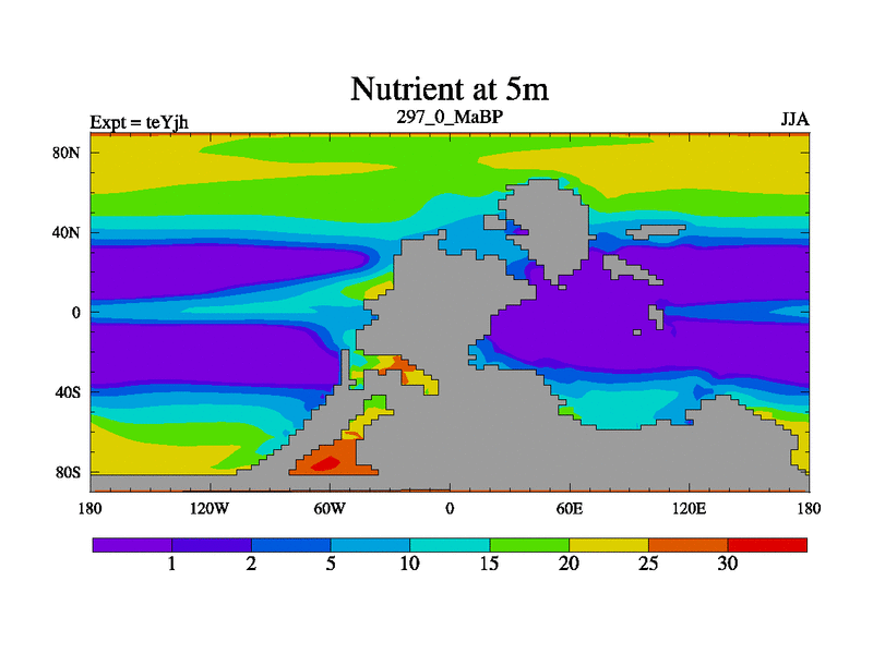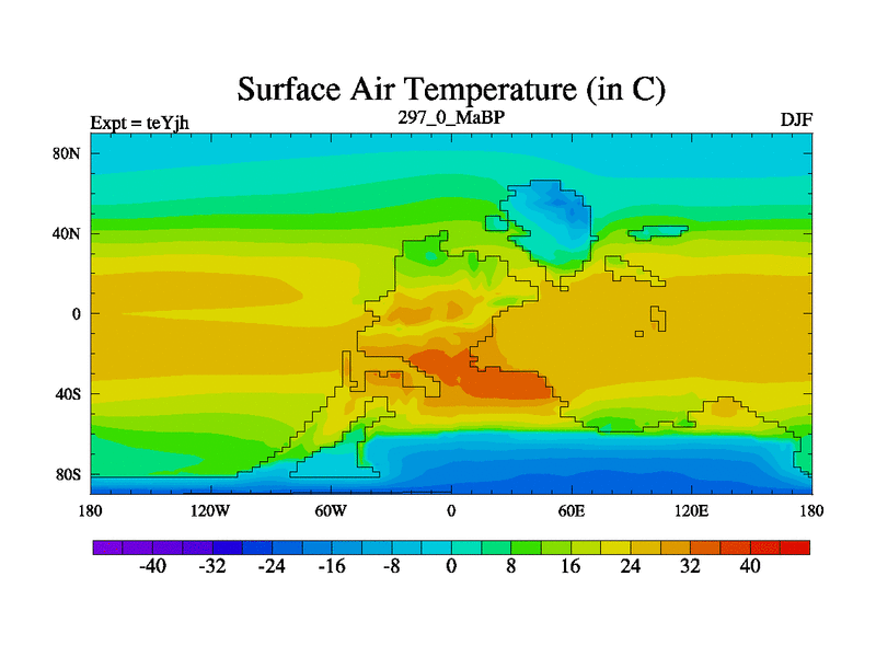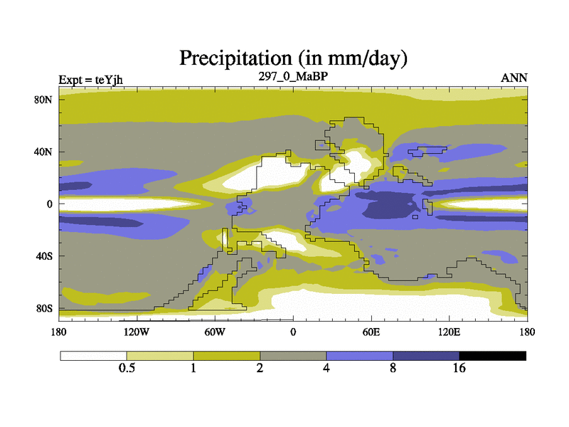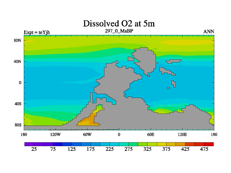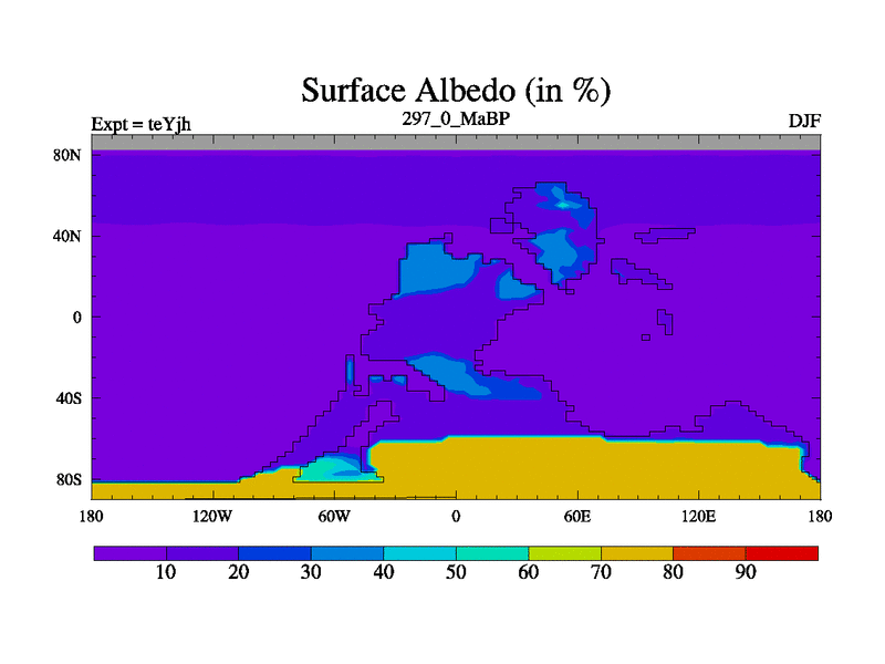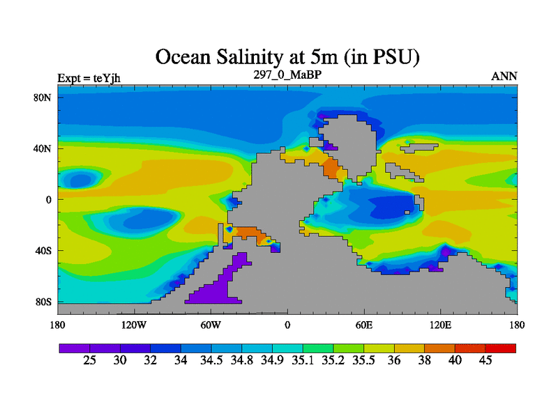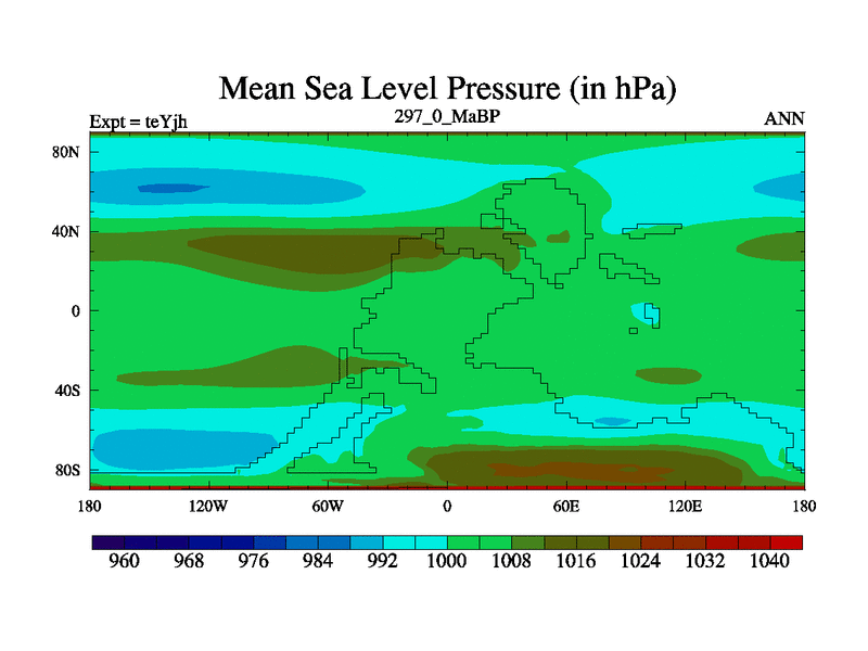 This is the 297.0 Ma simulation using the Scotese palaeogeographies and revised CCN etc. As teyfa3 but corrected orography problem over Antartartica. Now includes ocean biogeochemistry