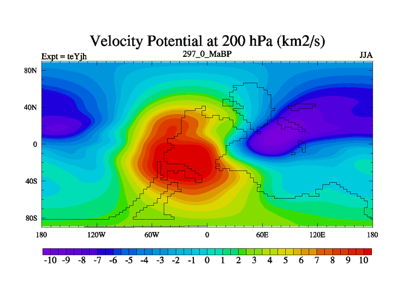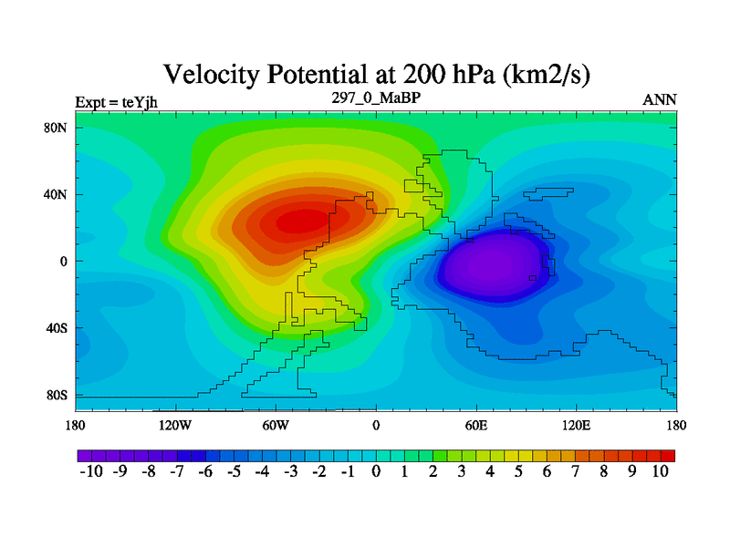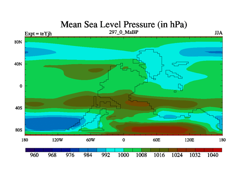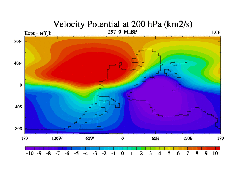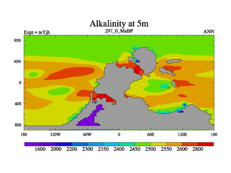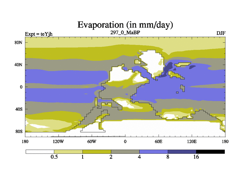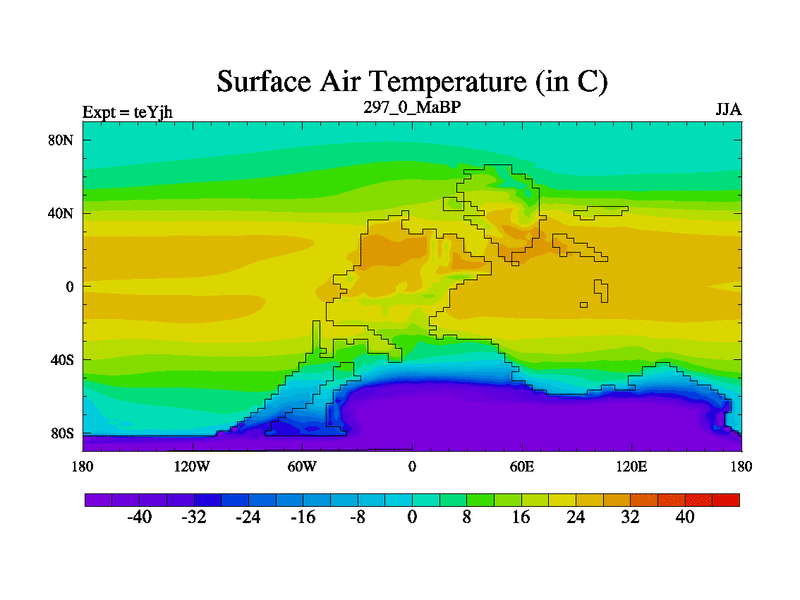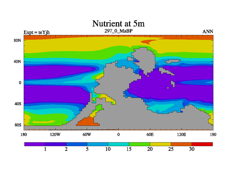 This is the 297.0 Ma simulation using the Scotese palaeogeographies and revised CCN etc. As teyfa3 but corrected orography problem over Antartartica. Now includes ocean biogeochemistry