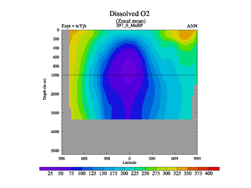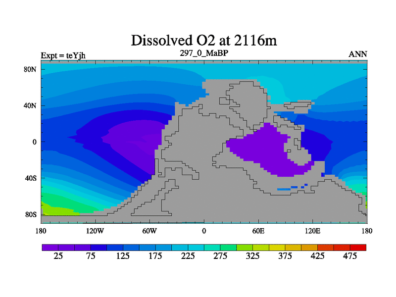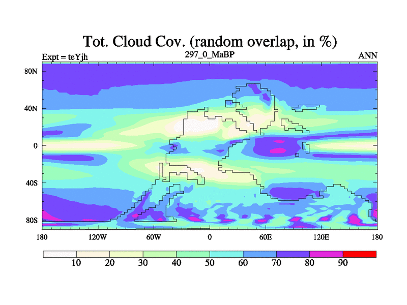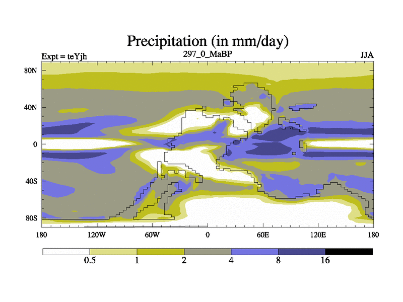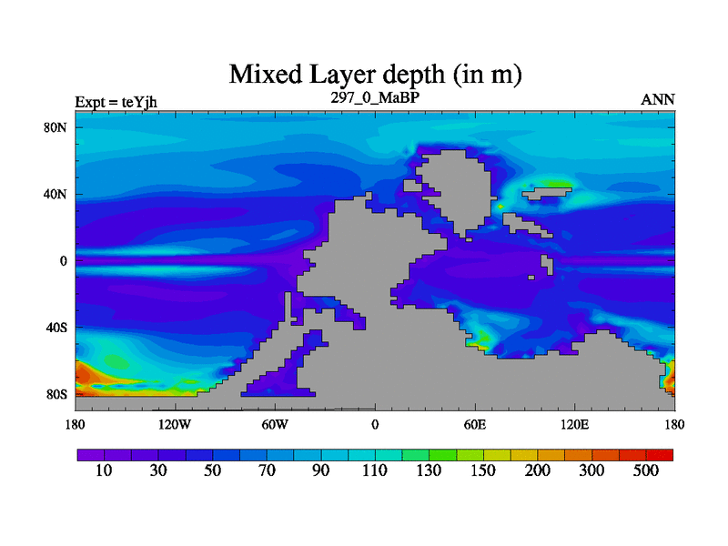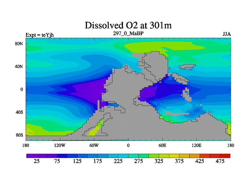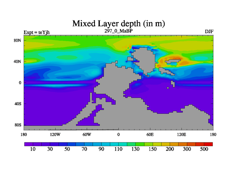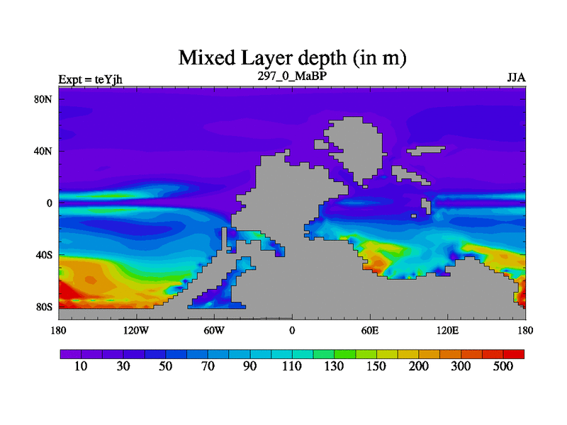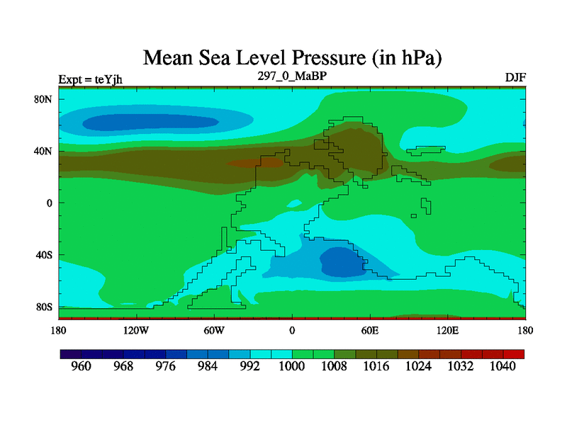 This is the 297.0 Ma simulation using the Scotese palaeogeographies and revised CCN etc. As teyfa3 but corrected orography problem over Antartartica. Now includes ocean biogeochemistry