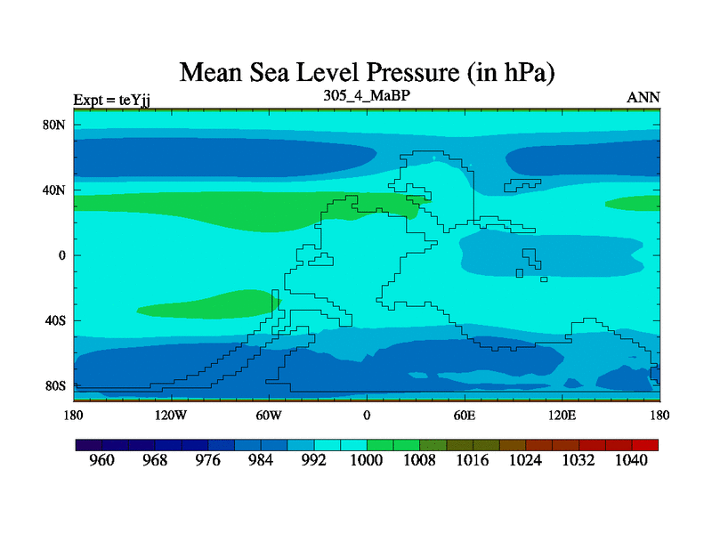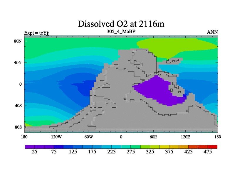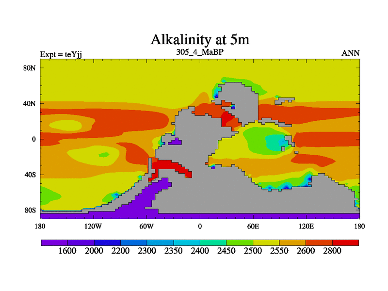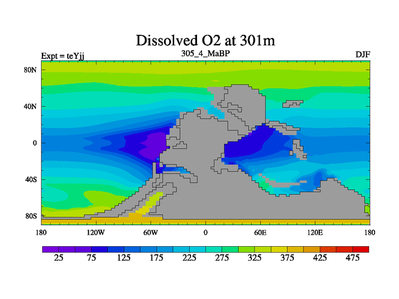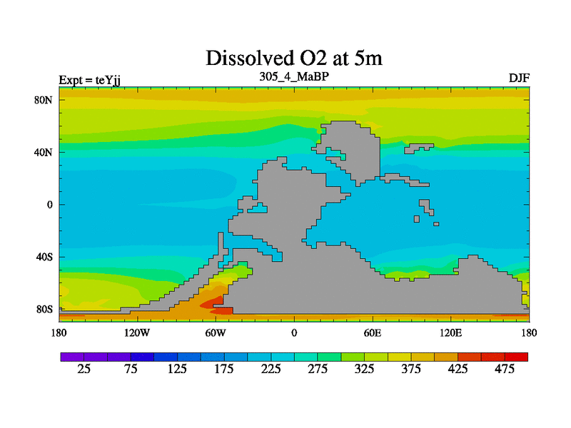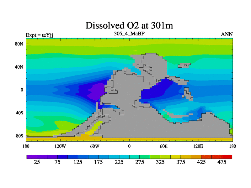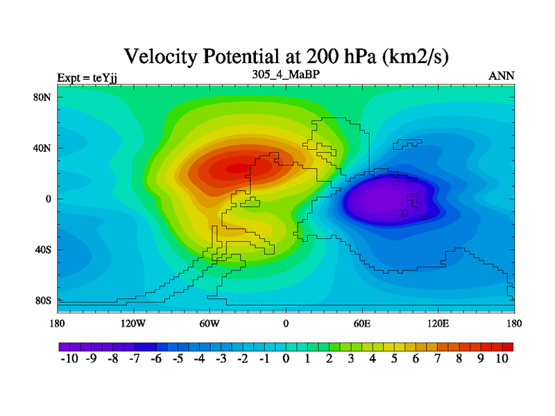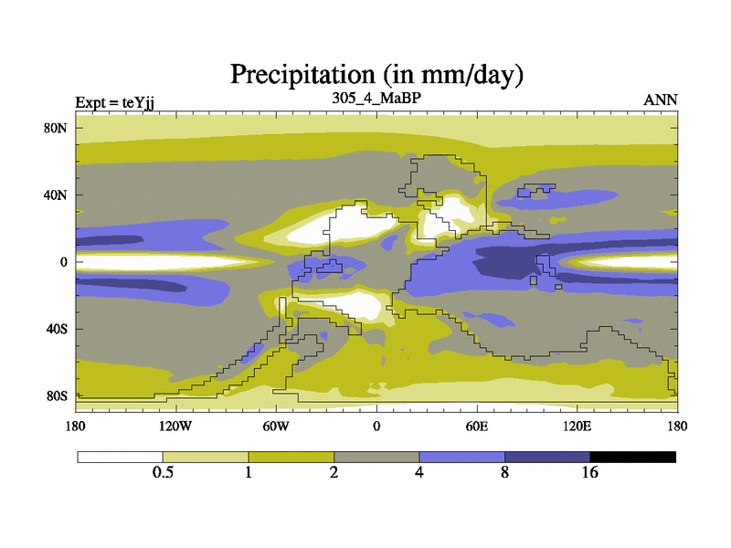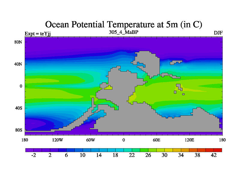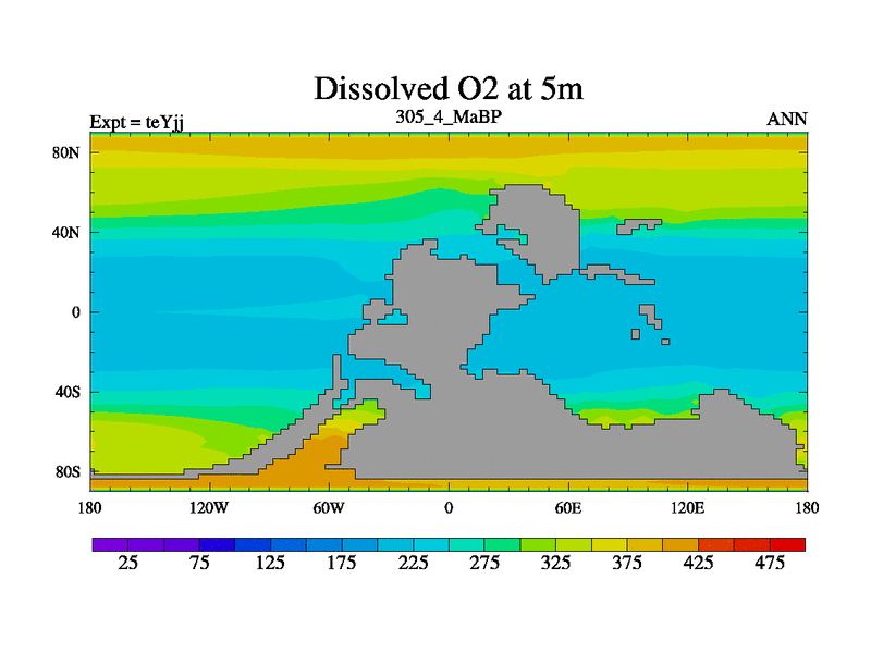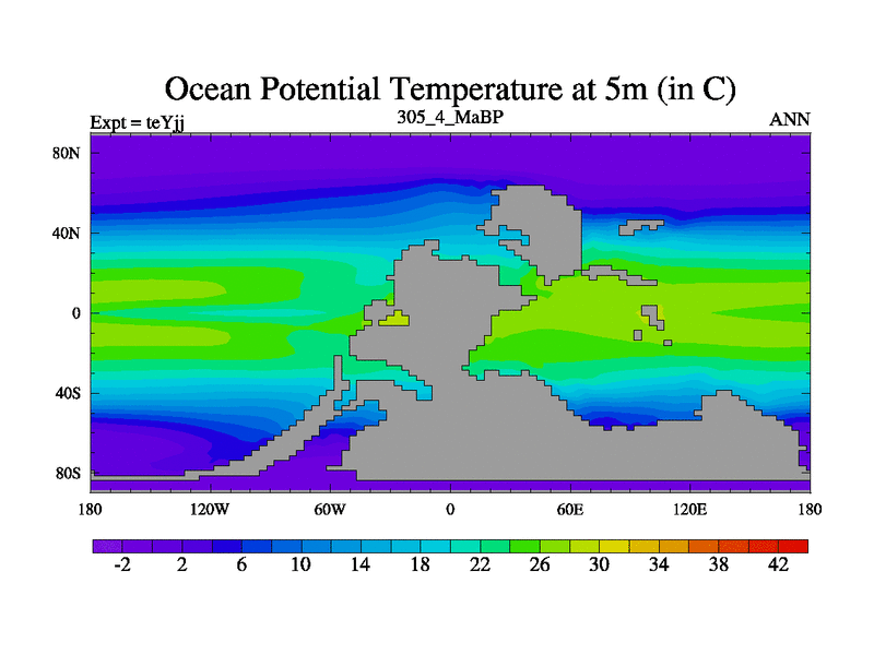 This is the 305.4 Ma simulation using the Scotese palaeogeographies and revised CCN etc. As teyfa3 but corrected orography problem over Antartartica. Now includes ocean biogeochemistry
