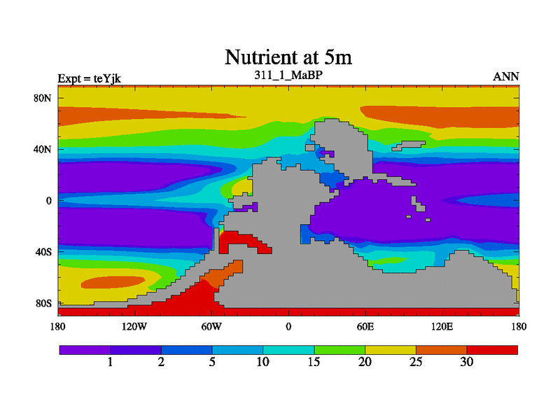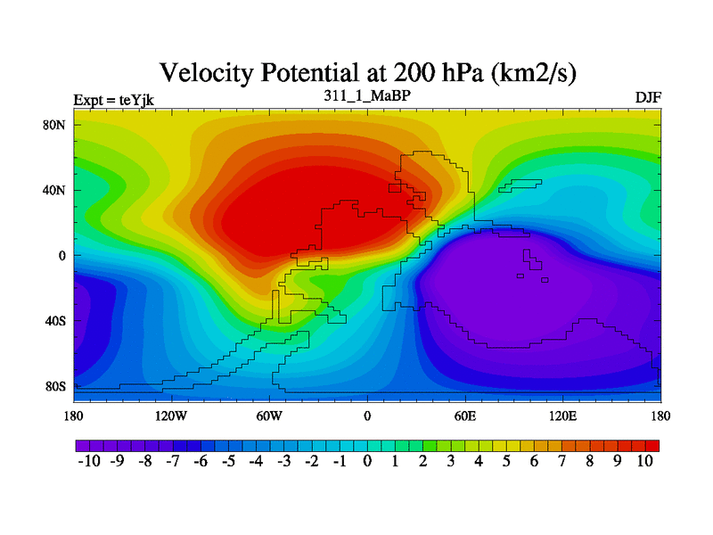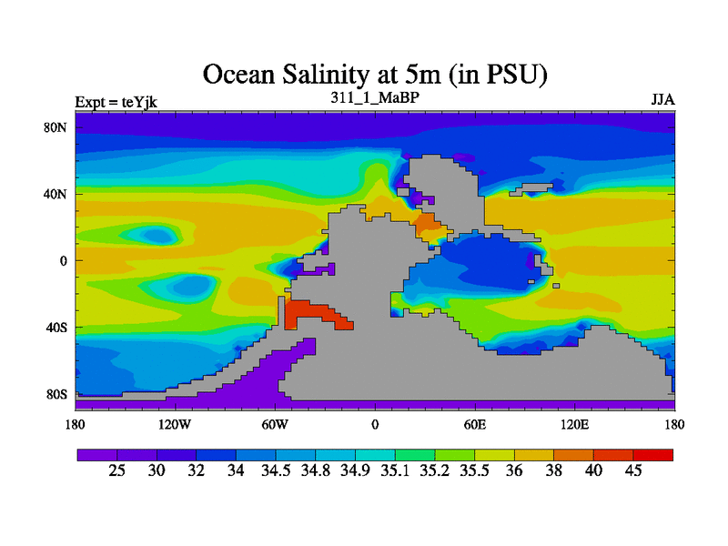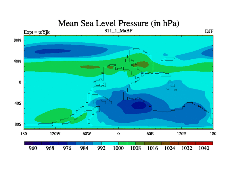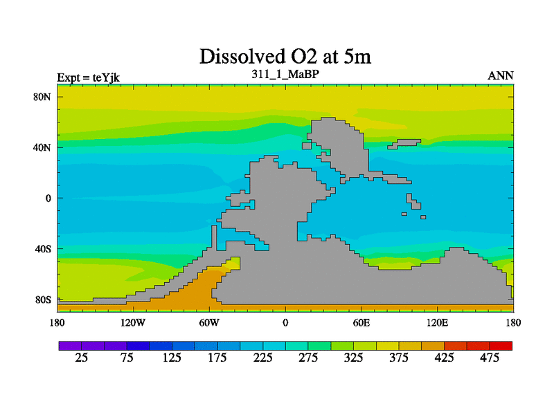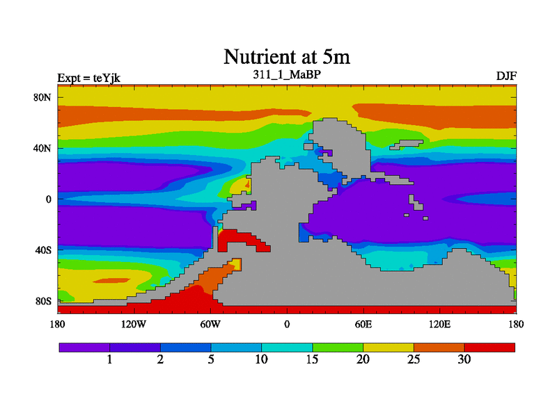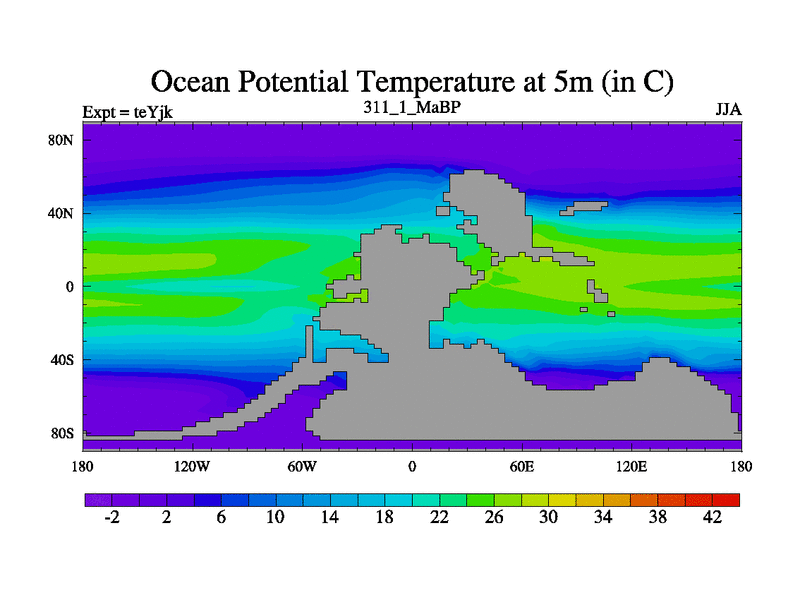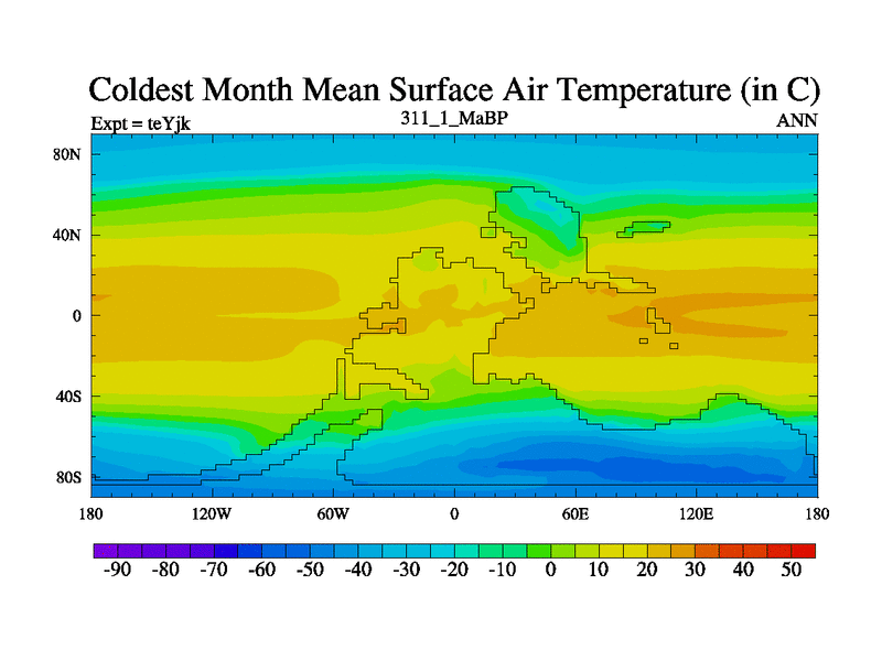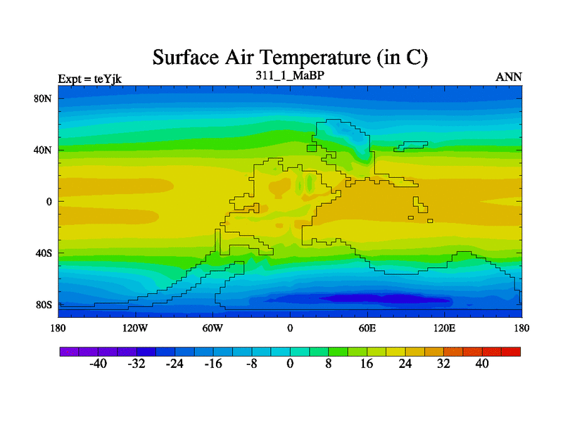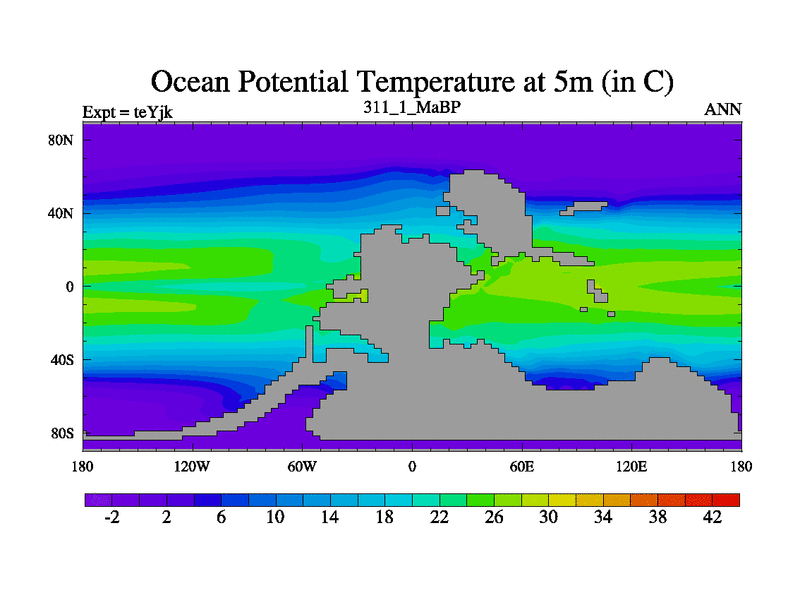 This is the 311.1 Ma simulation using the Scotese palaeogeographies and revised CCN etc. As teyfa3 but corrected orography problem over Antartartica. Now includes ocean biogeochemistry