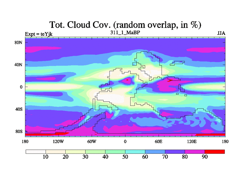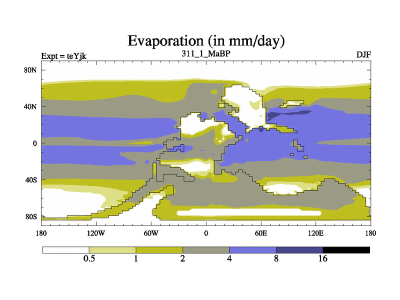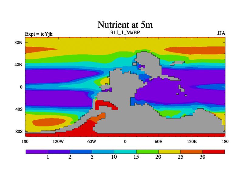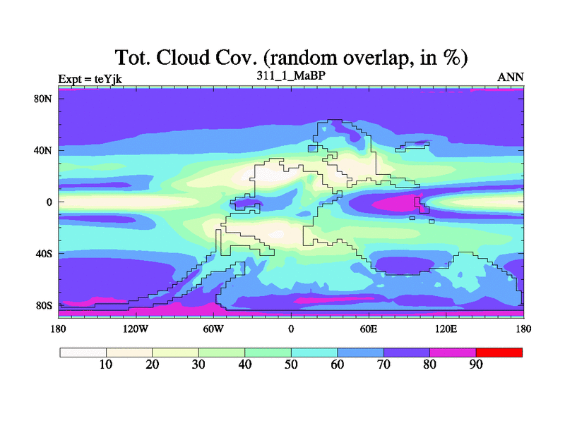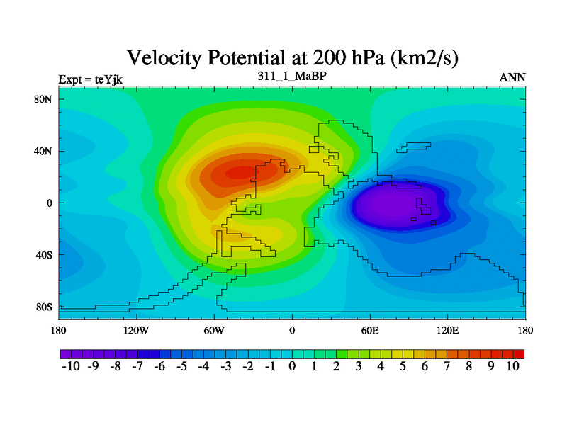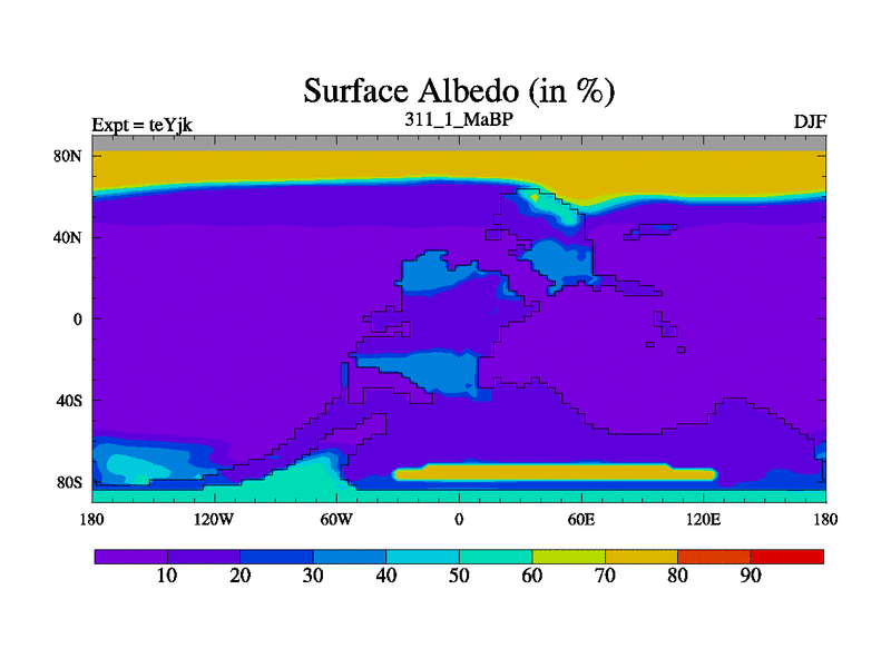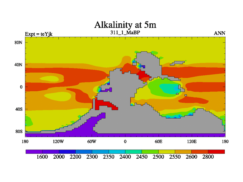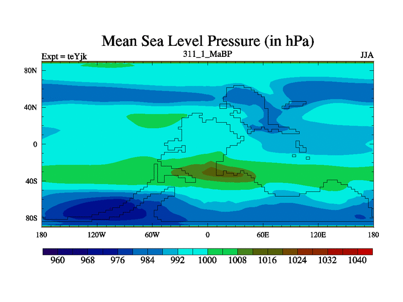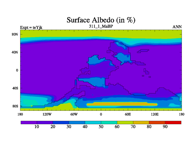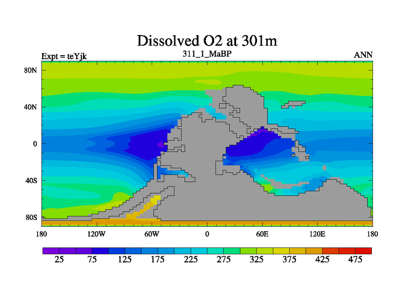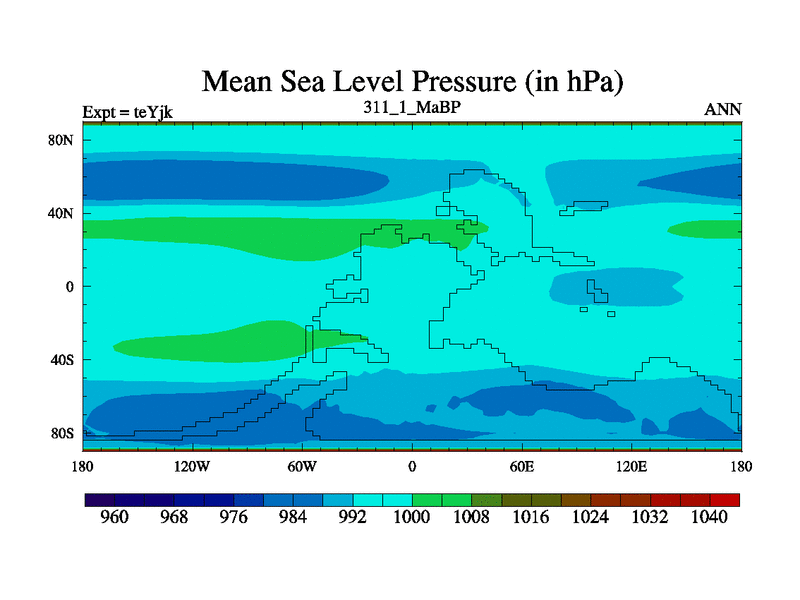 This is the 311.1 Ma simulation using the Scotese palaeogeographies and revised CCN etc. As teyfa3 but corrected orography problem over Antartartica. Now includes ocean biogeochemistry