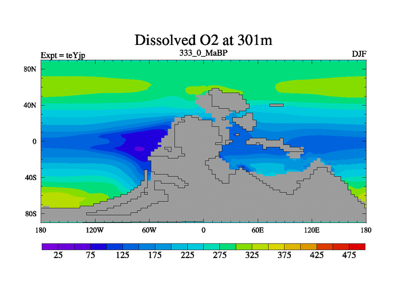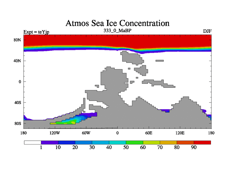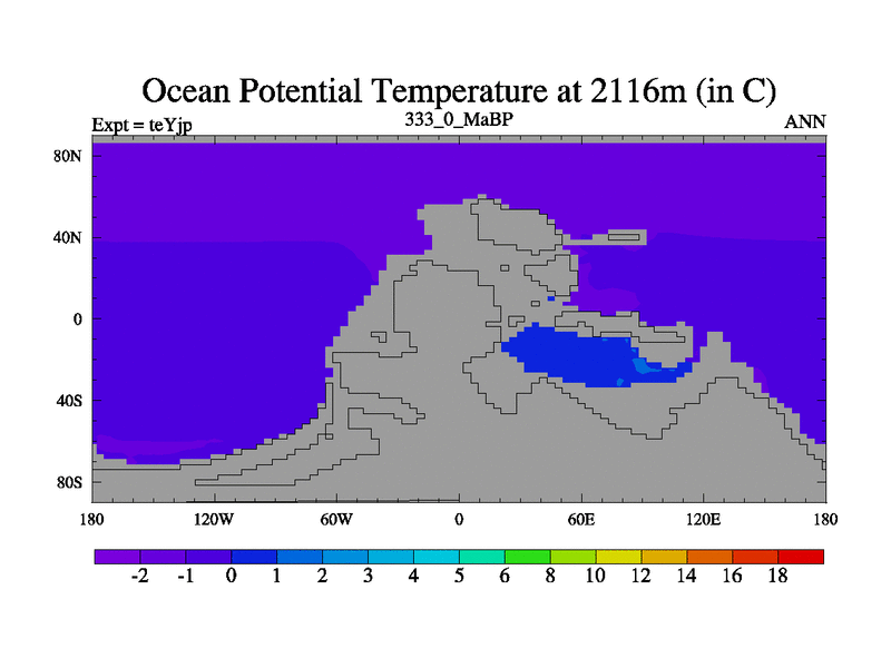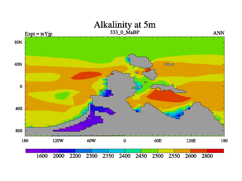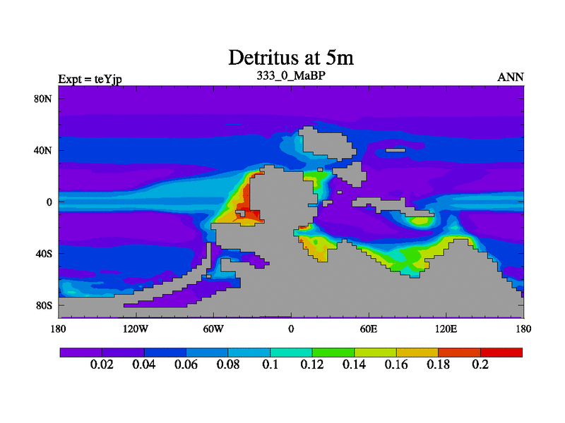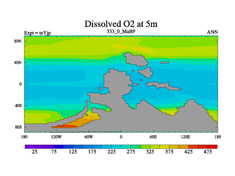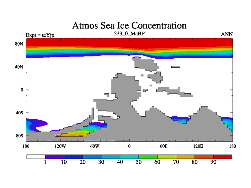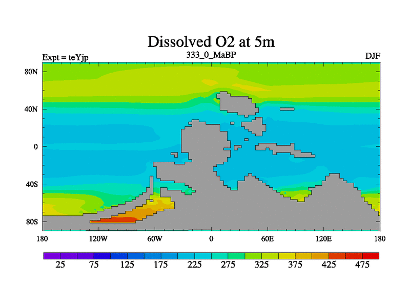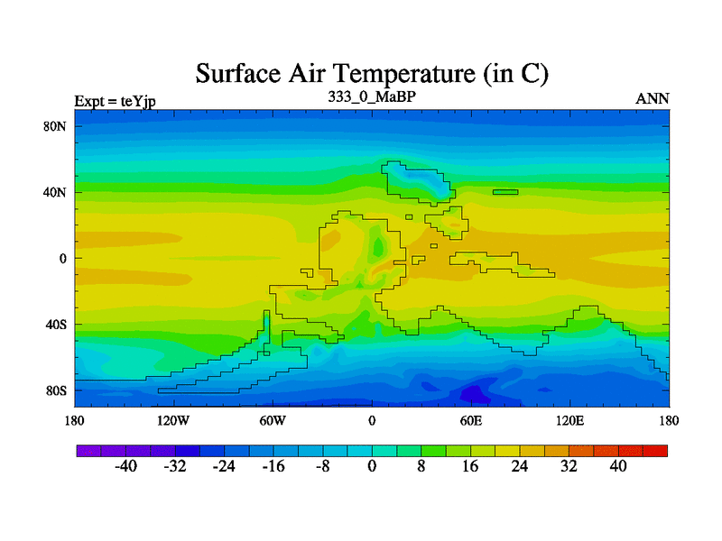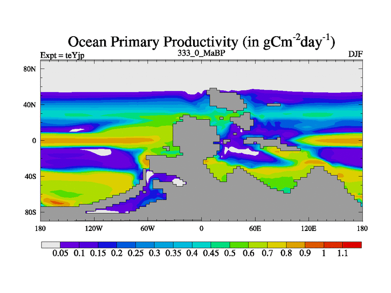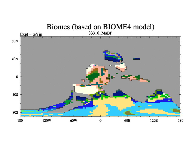 This is the 333.0 Ma simulation using the Scotese palaeogeographies and revised CCN etc. As teyfa3 but corrected orography problem over Antartartica. Now includes ocean biogeochemistry