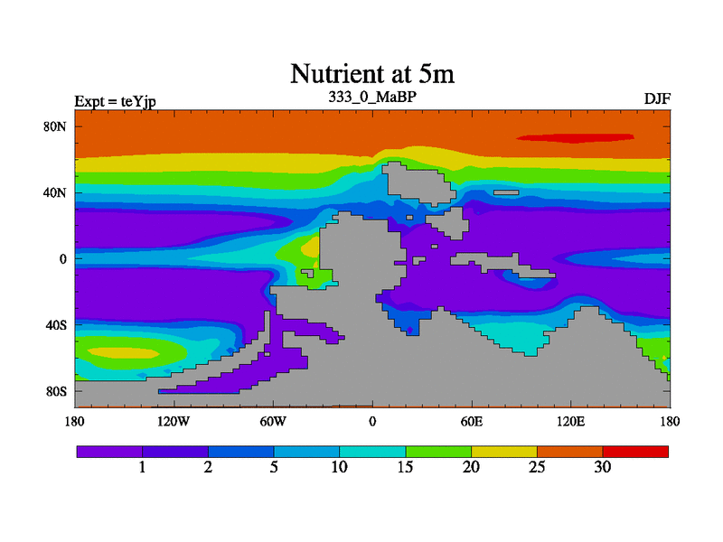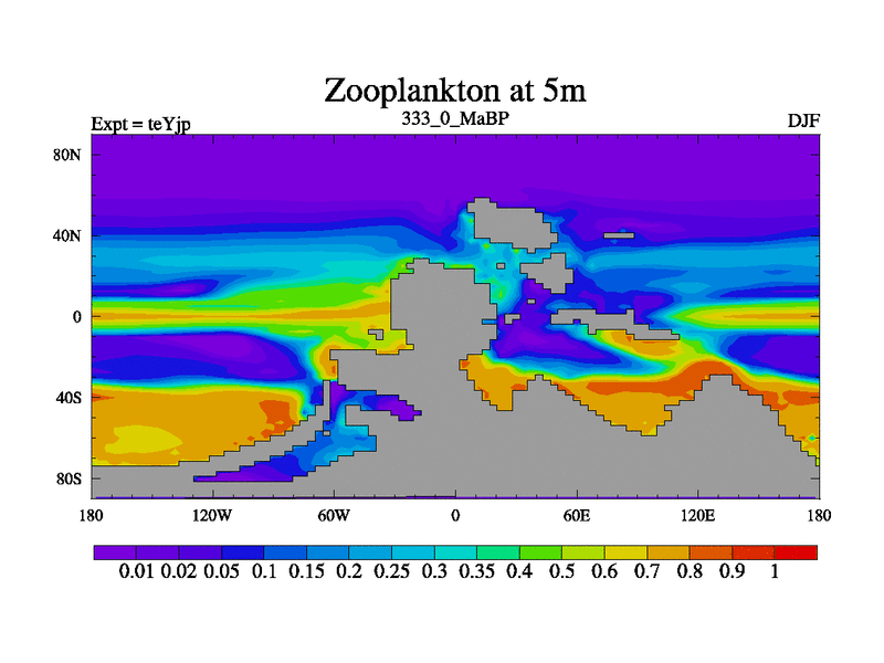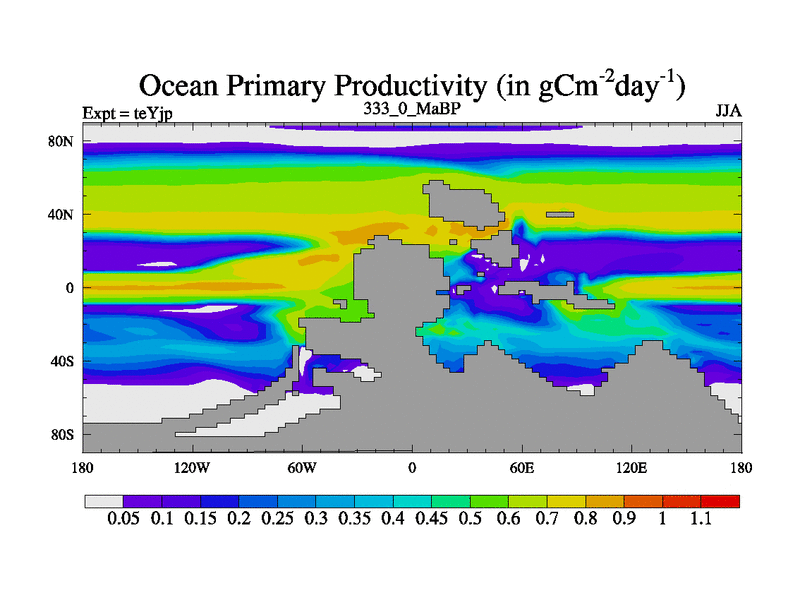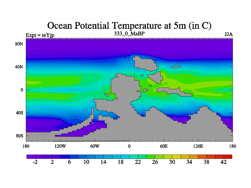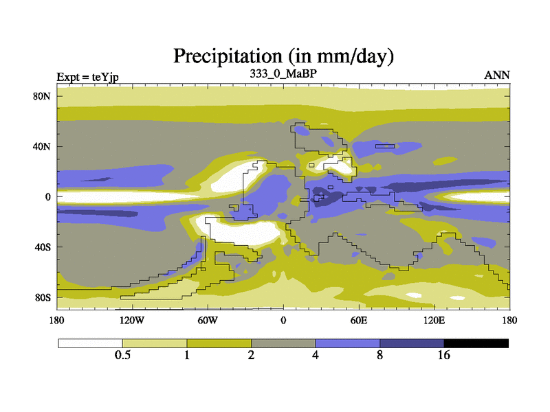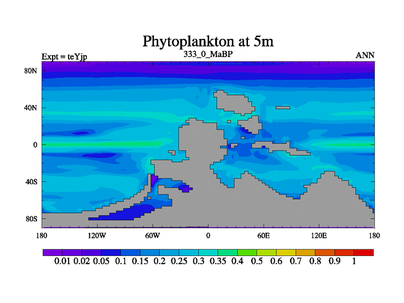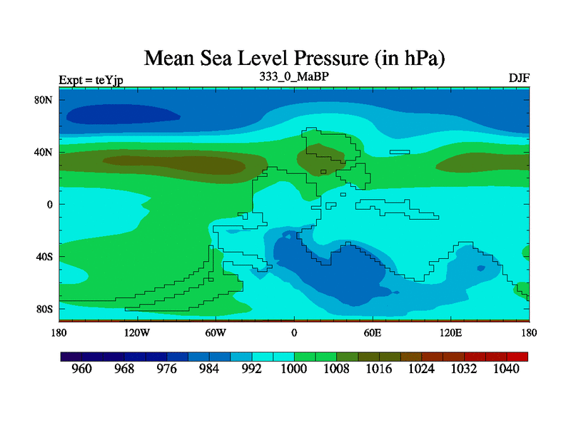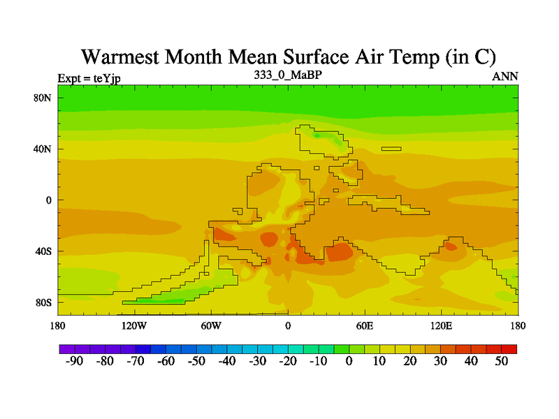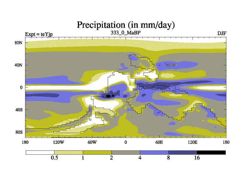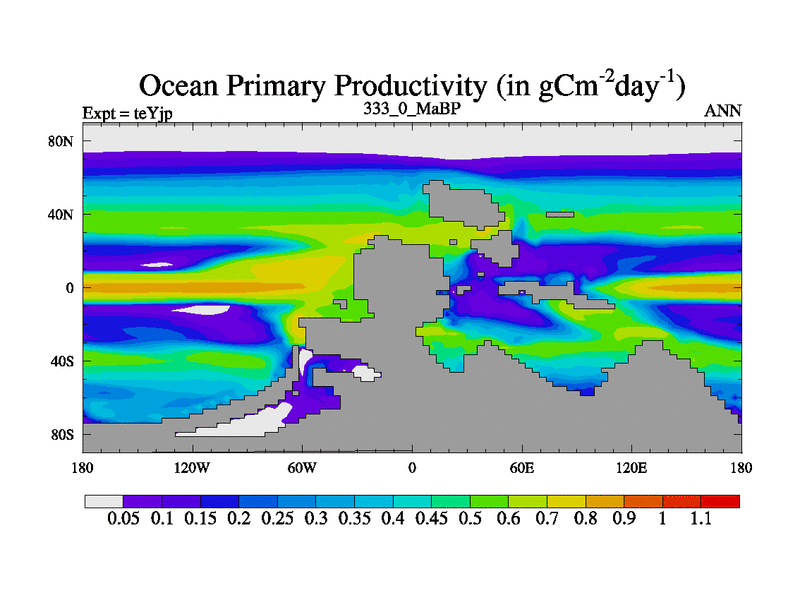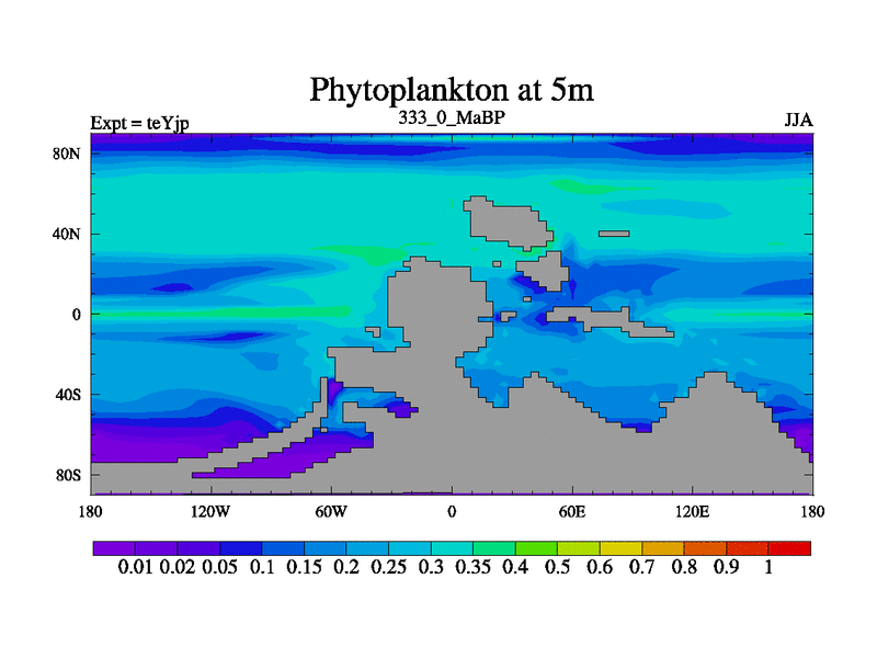 This is the 333.0 Ma simulation using the Scotese palaeogeographies and revised CCN etc. As teyfa3 but corrected orography problem over Antartartica. Now includes ocean biogeochemistry