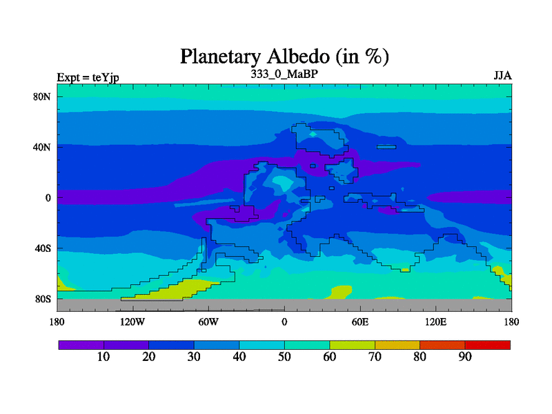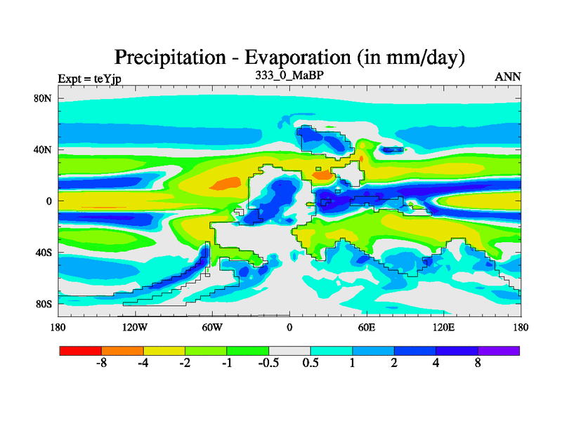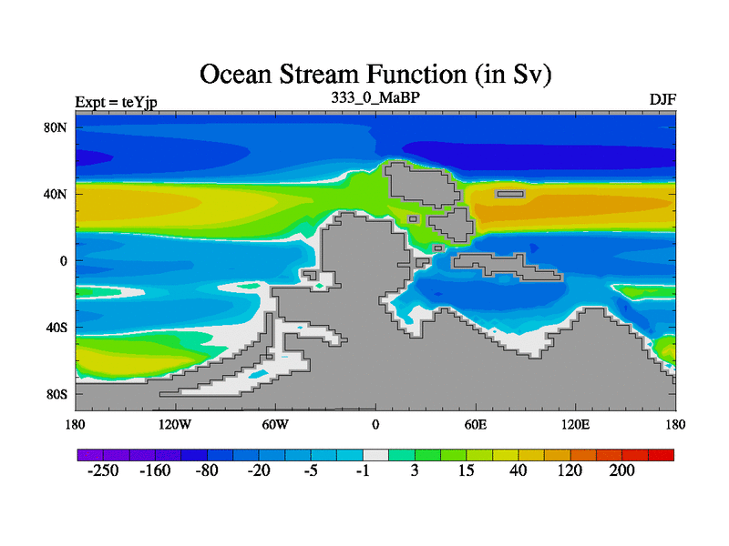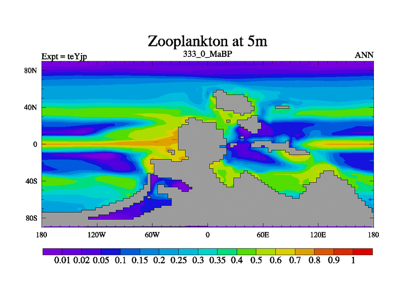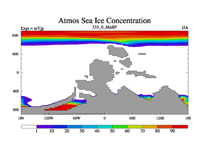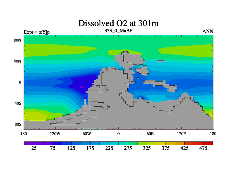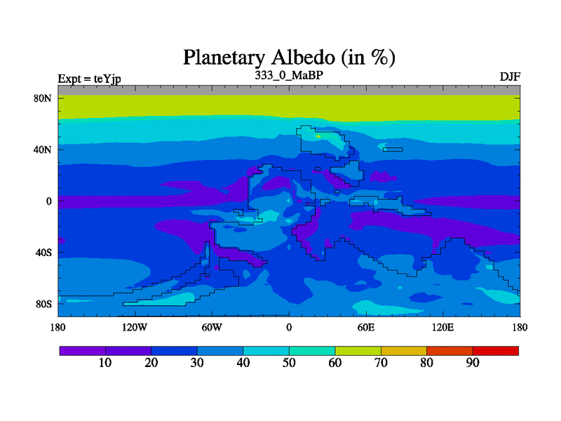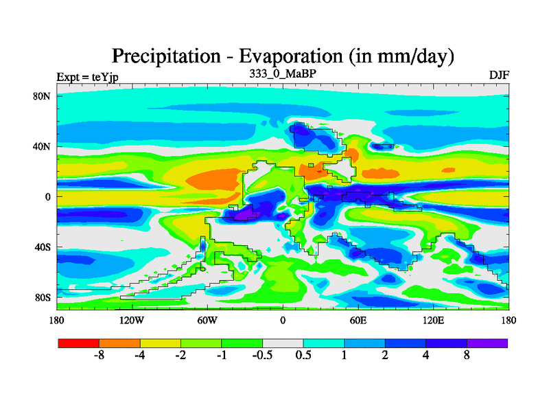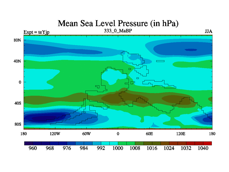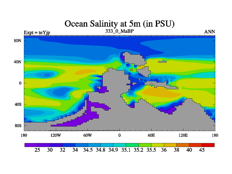 This is the 333.0 Ma simulation using the Scotese palaeogeographies and revised CCN etc. As teyfa3 but corrected orography problem over Antartartica. Now includes ocean biogeochemistry