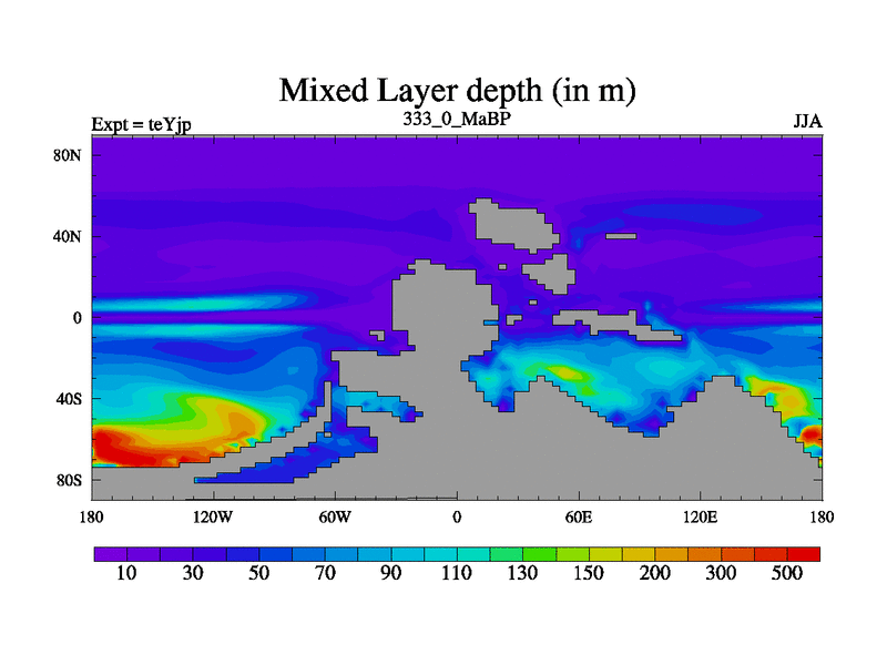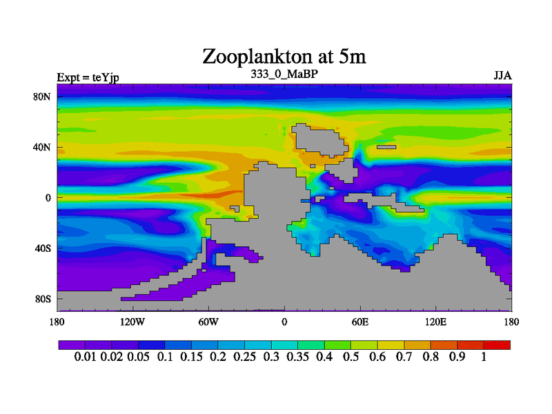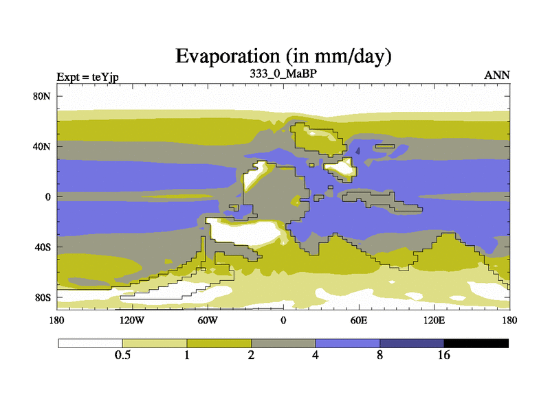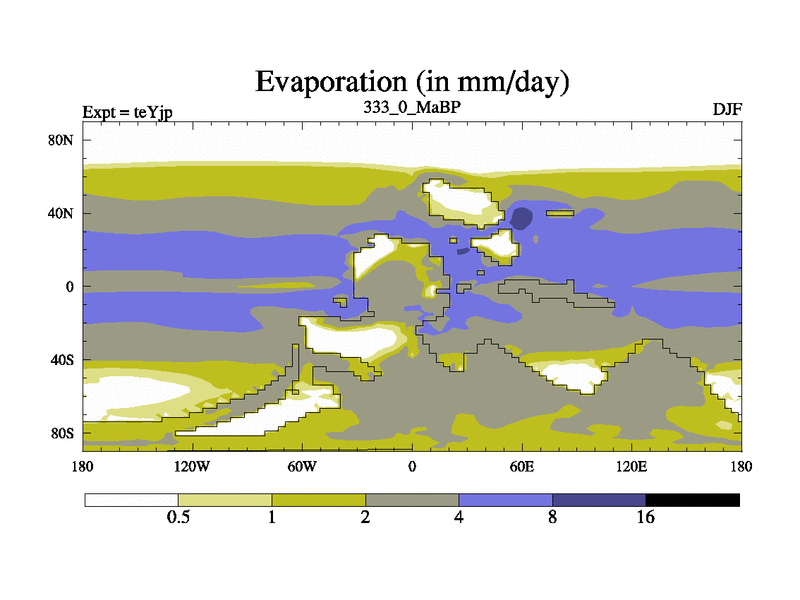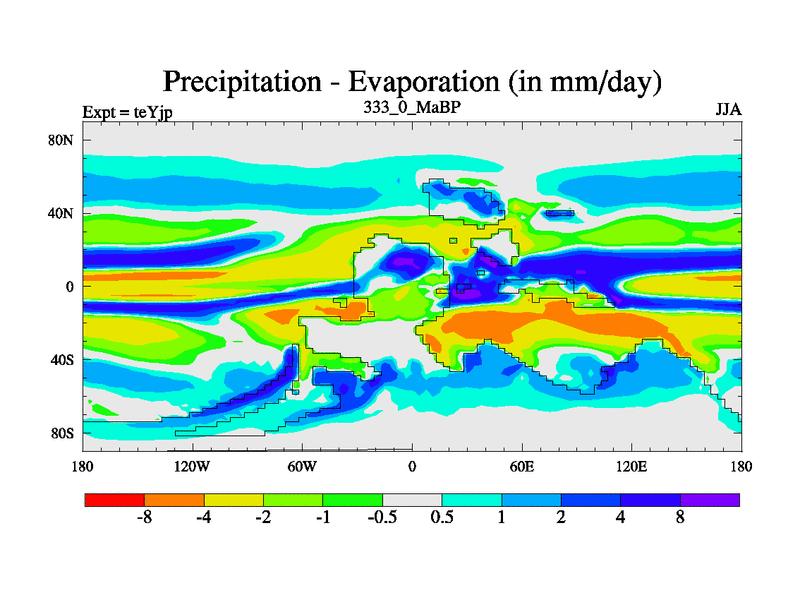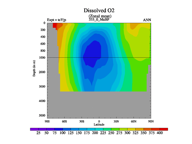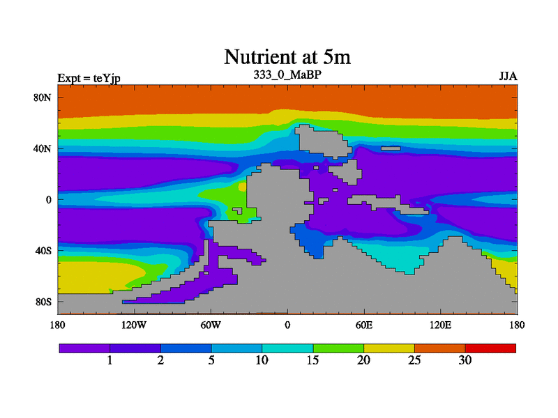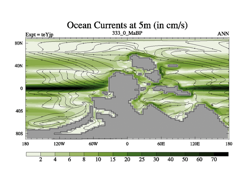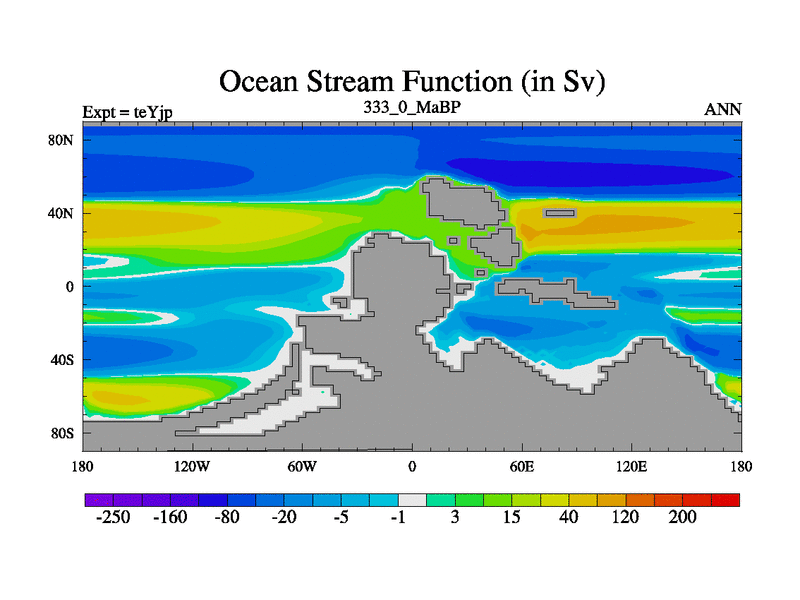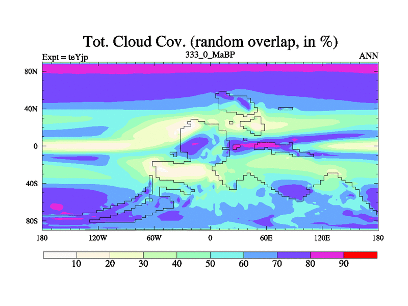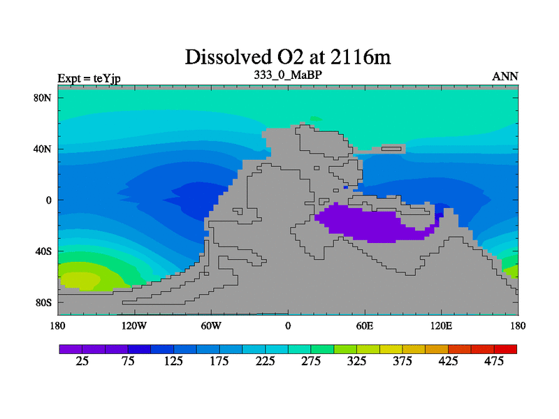 This is the 333.0 Ma simulation using the Scotese palaeogeographies and revised CCN etc. As teyfa3 but corrected orography problem over Antartartica. Now includes ocean biogeochemistry