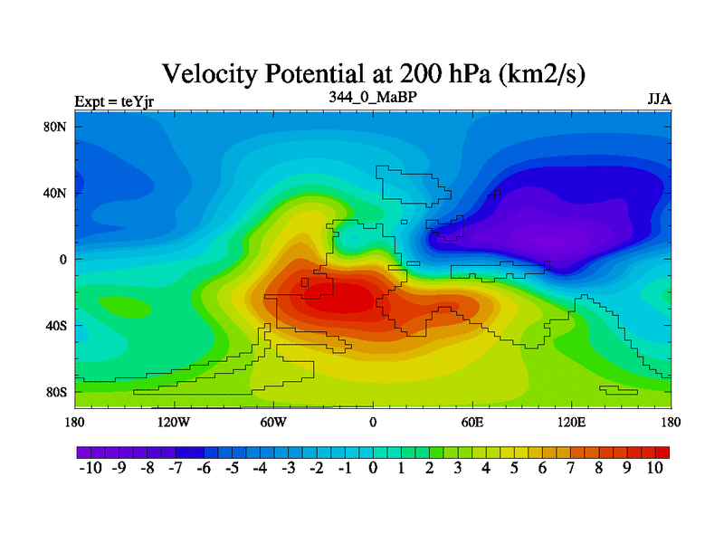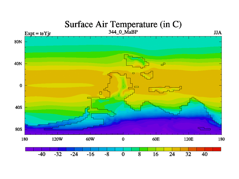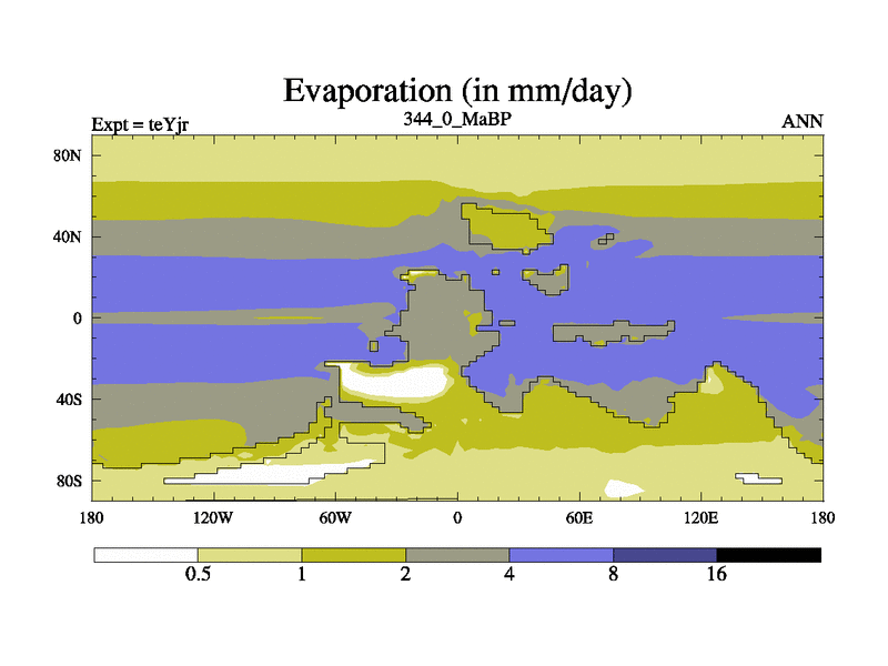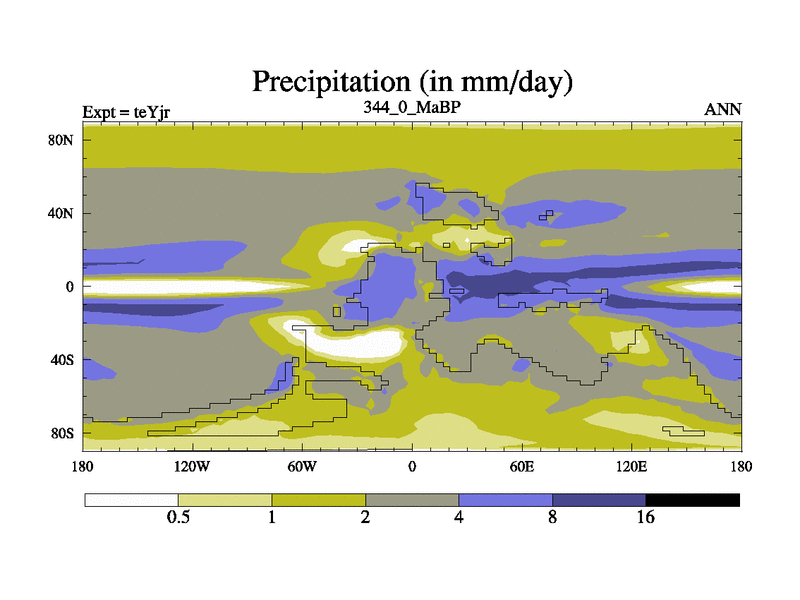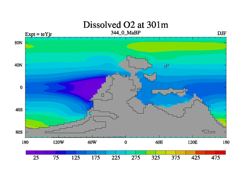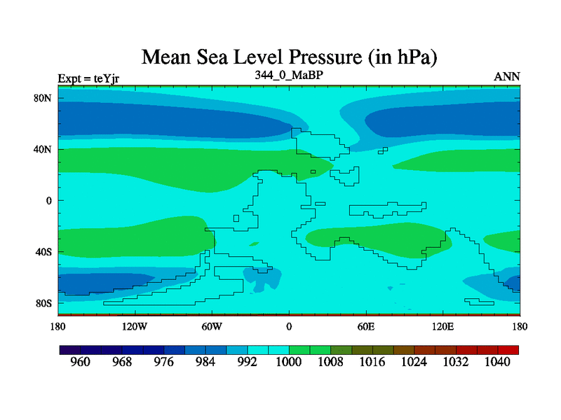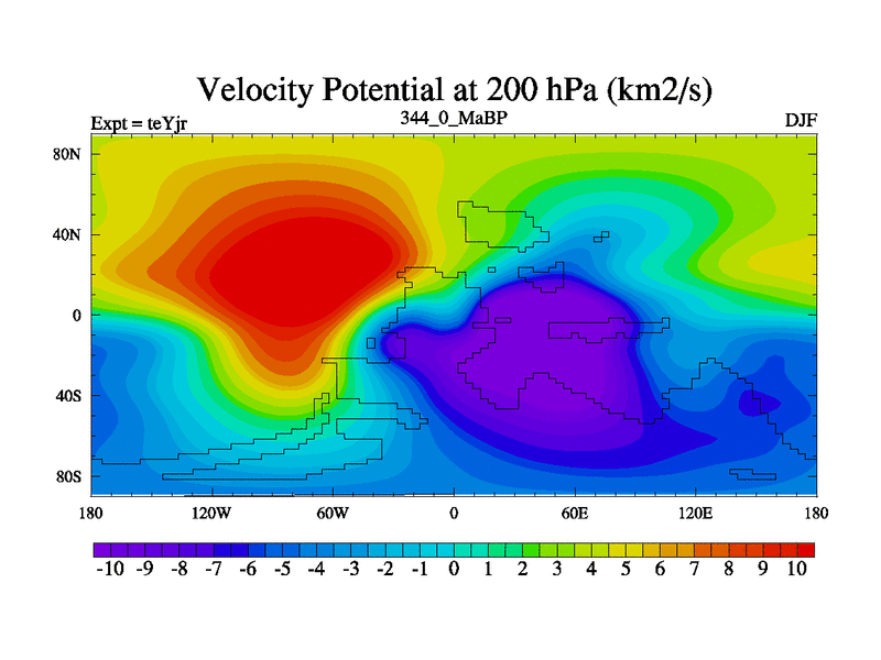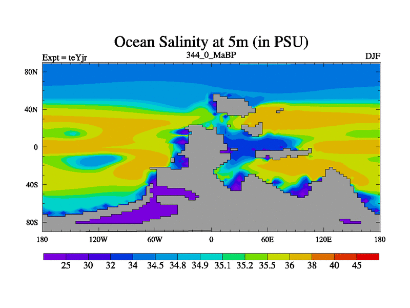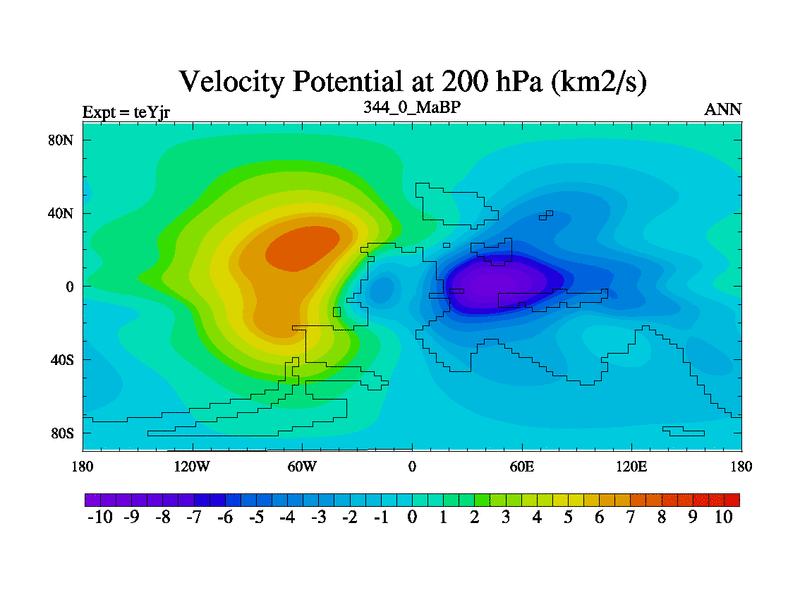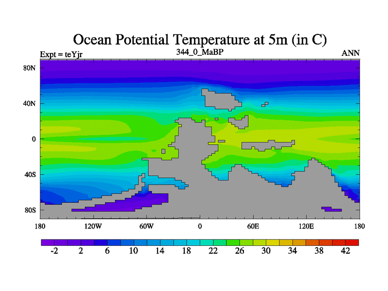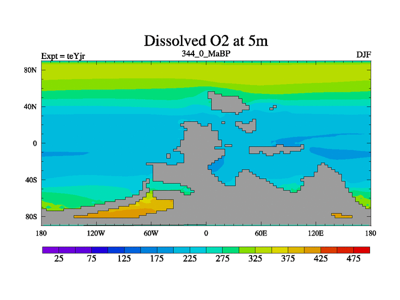 This is the 344.0 Ma simulation using the Scotese palaeogeographies and revised CCN etc. As teyfa3 but corrected orography problem over Antartartica. Now includes ocean biogeochemistry