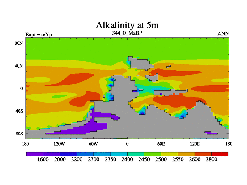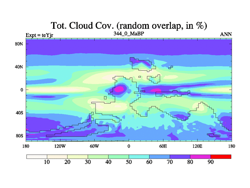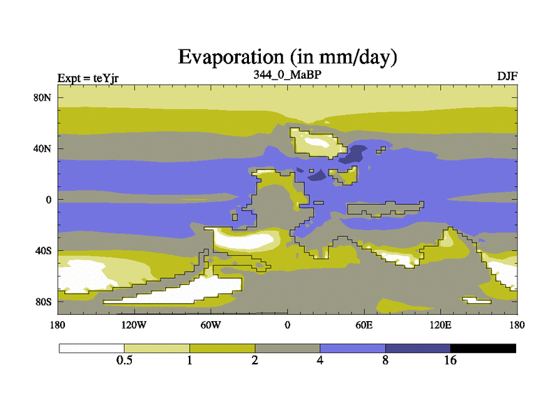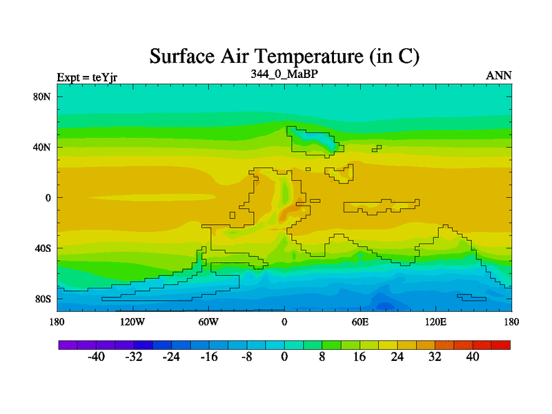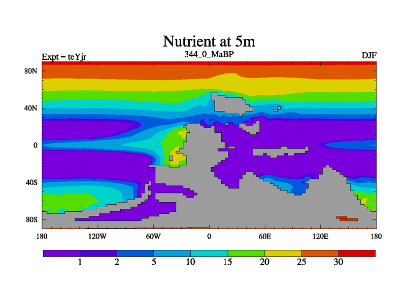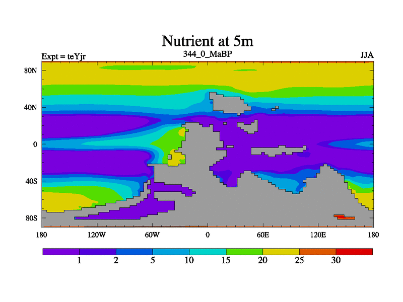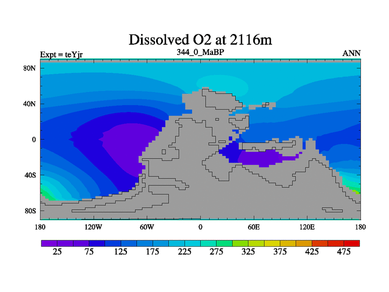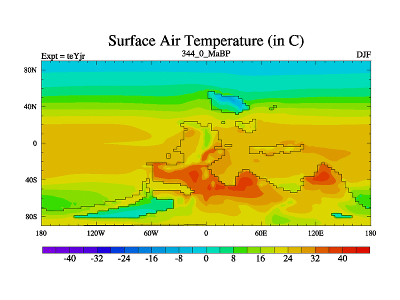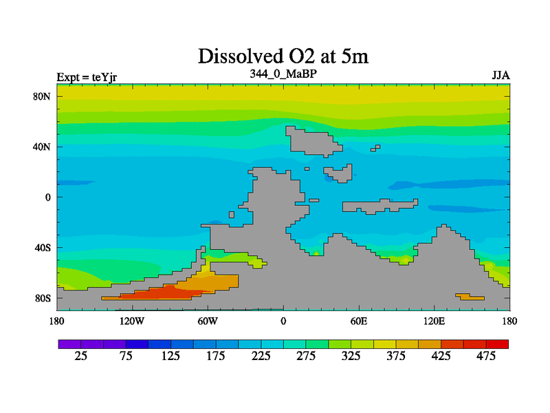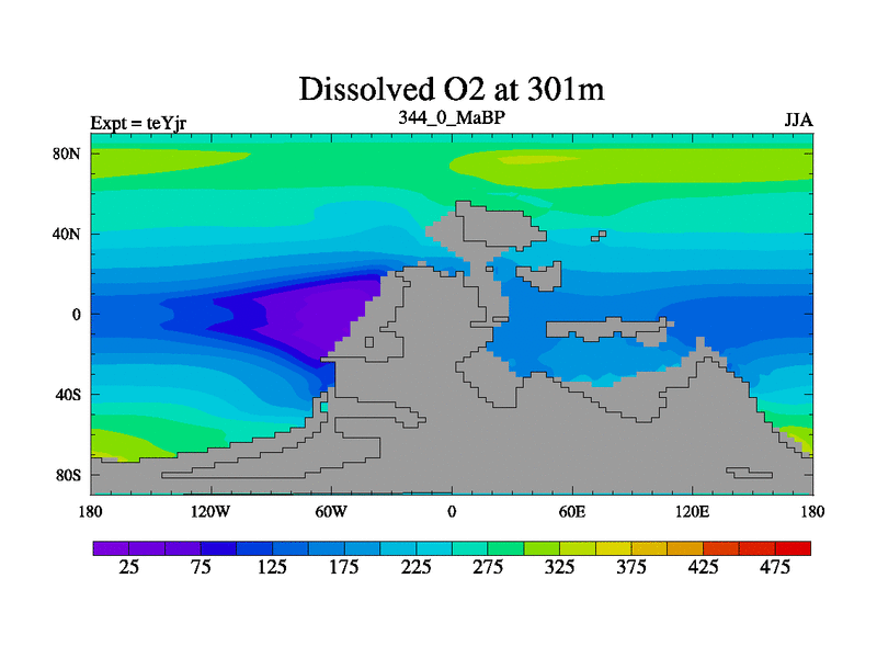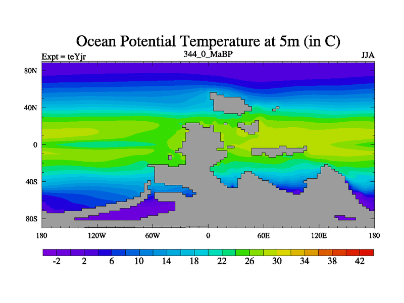 This is the 344.0 Ma simulation using the Scotese palaeogeographies and revised CCN etc. As teyfa3 but corrected orography problem over Antartartica. Now includes ocean biogeochemistry