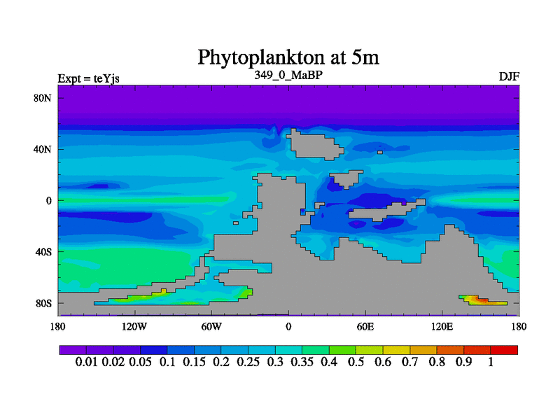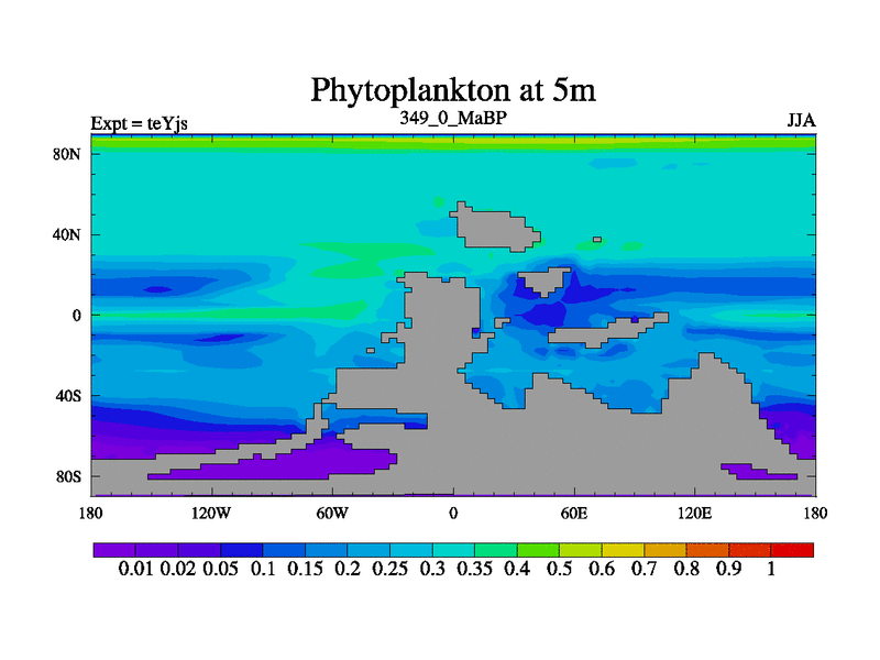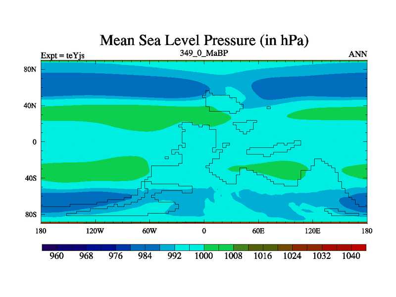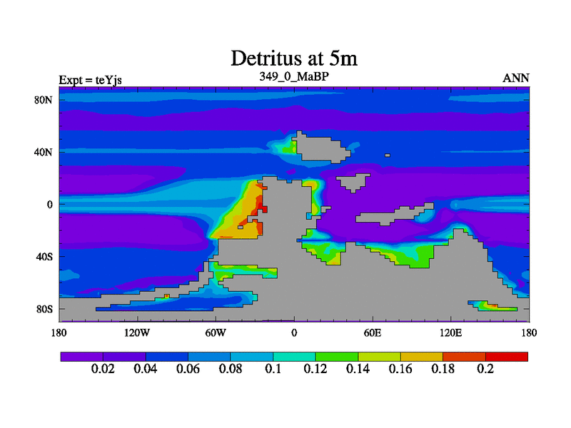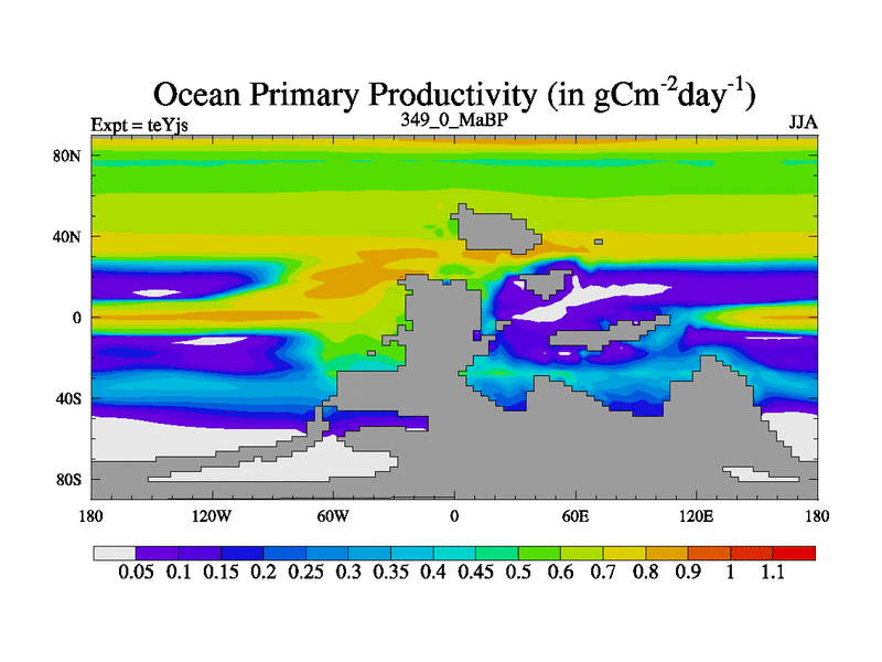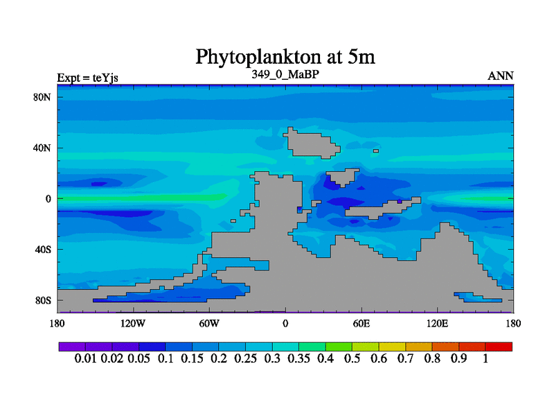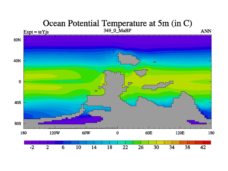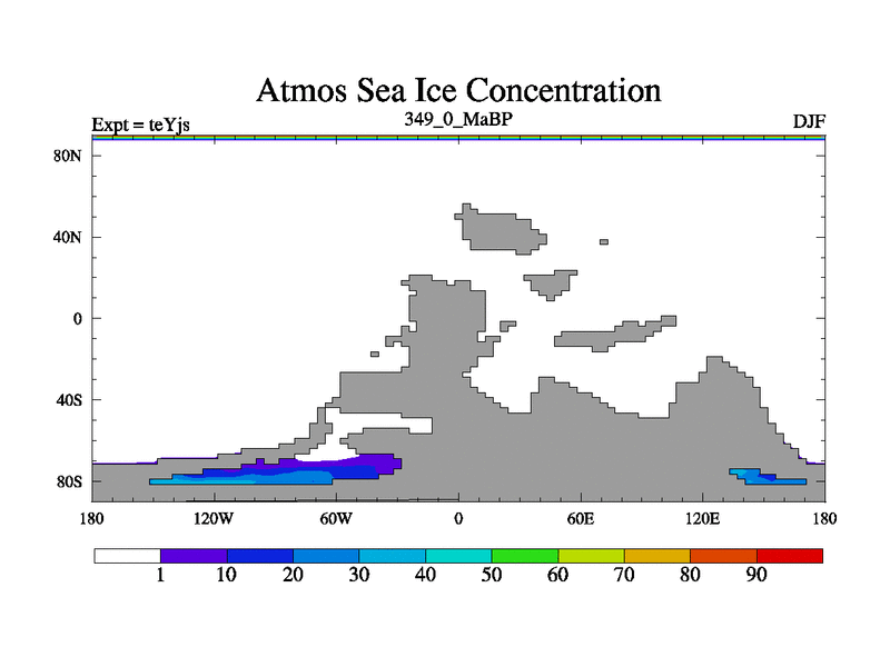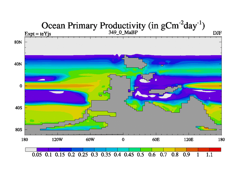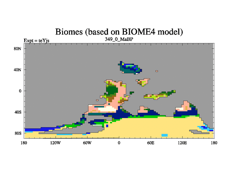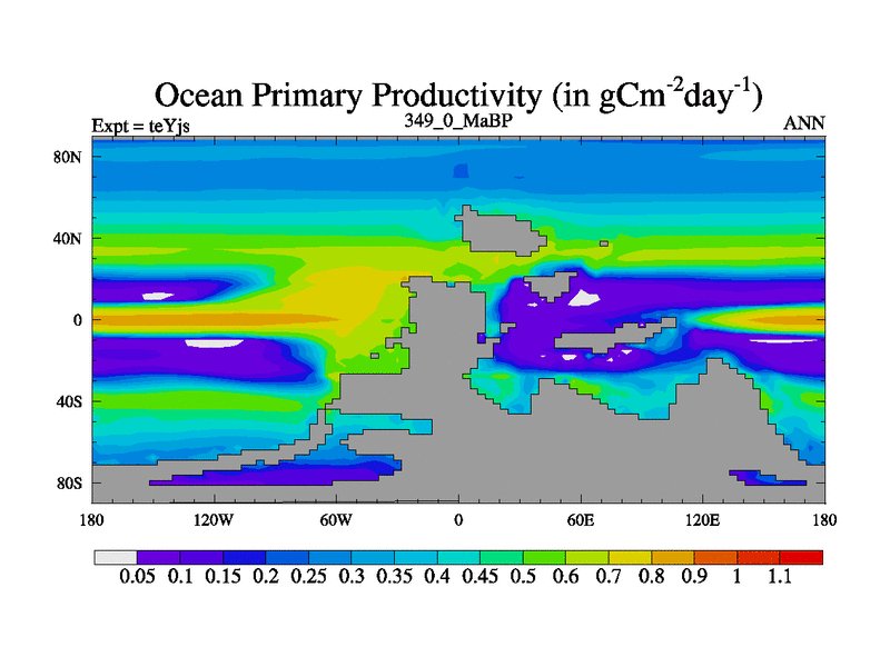 This is the 349.0 Ma simulation using the Scotese palaeogeographies and revised CCN etc. As teyfa3 but corrected orography problem over Antartartica. Now includes ocean biogeochemistry