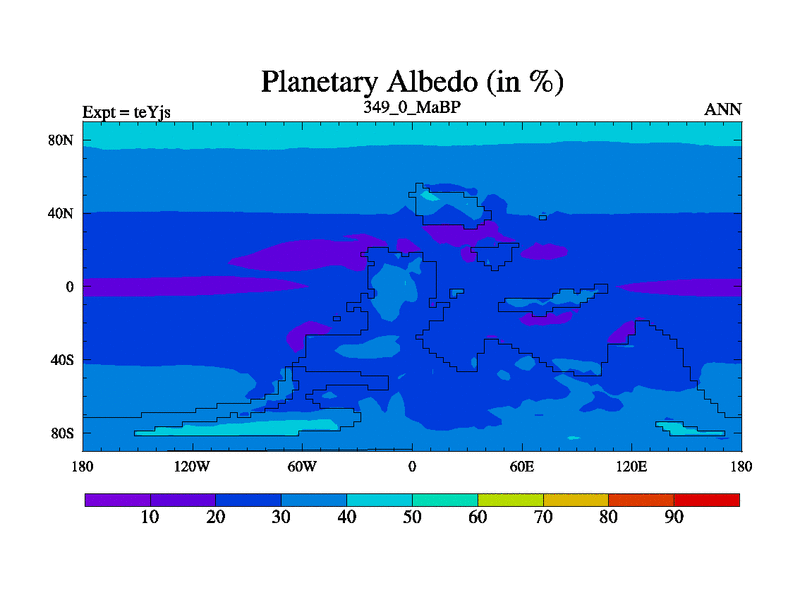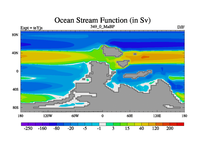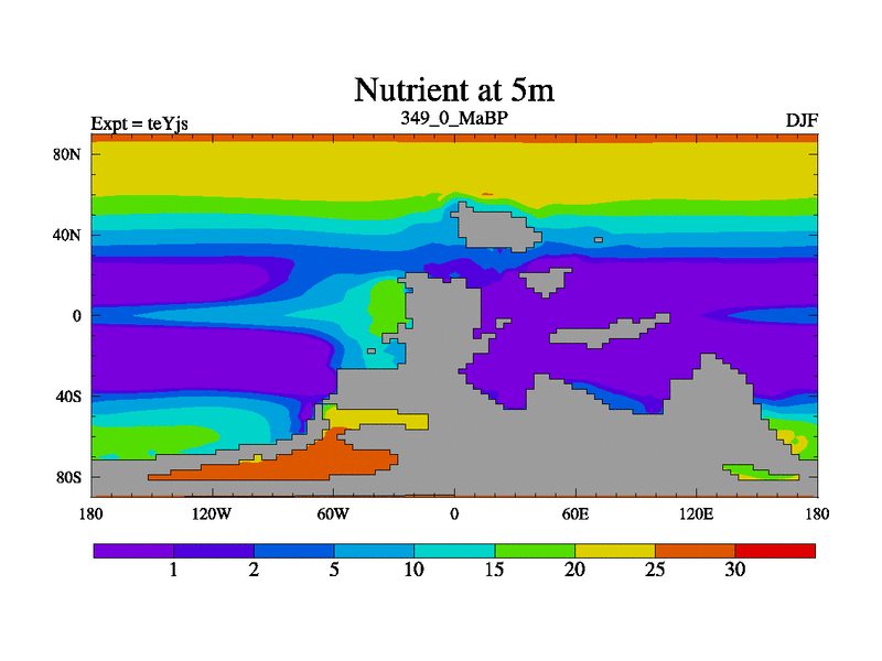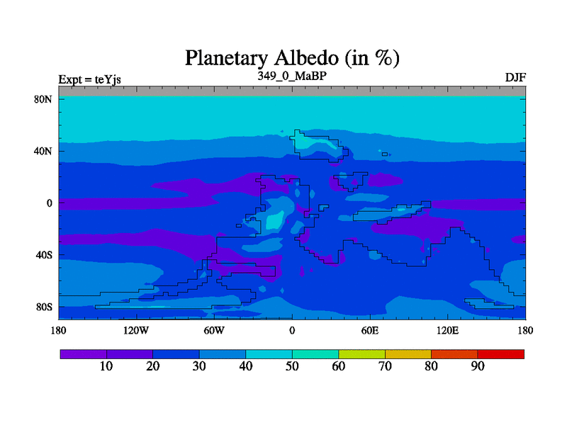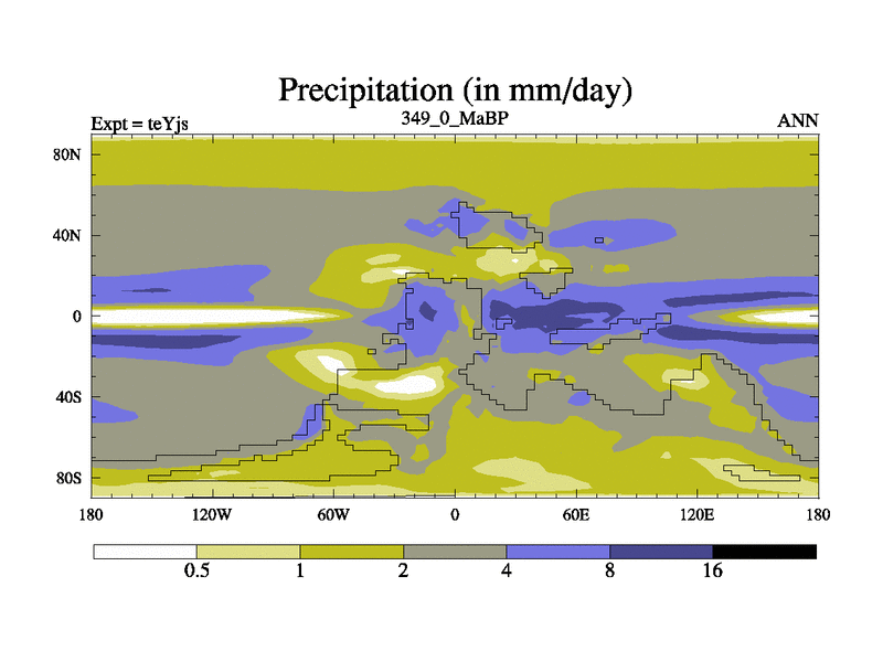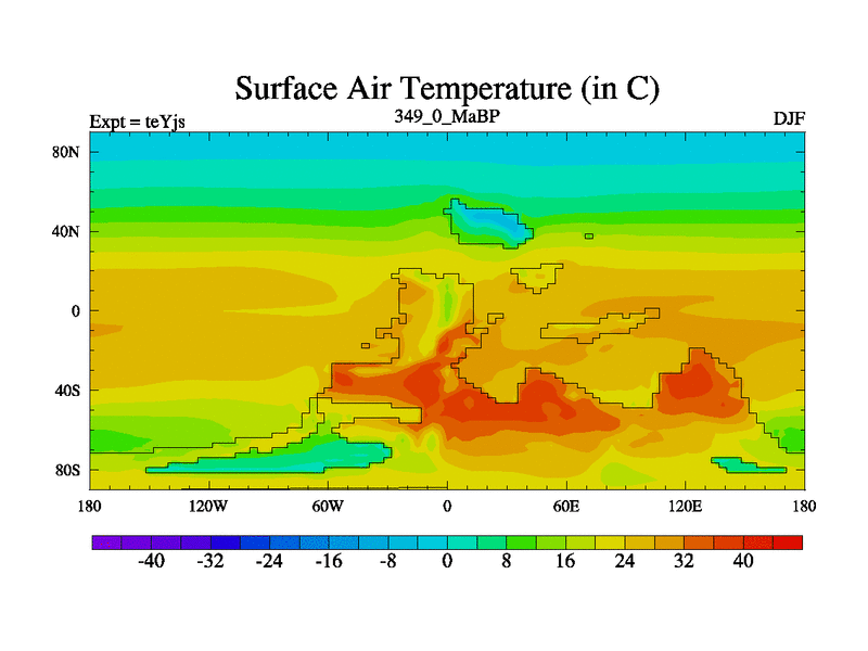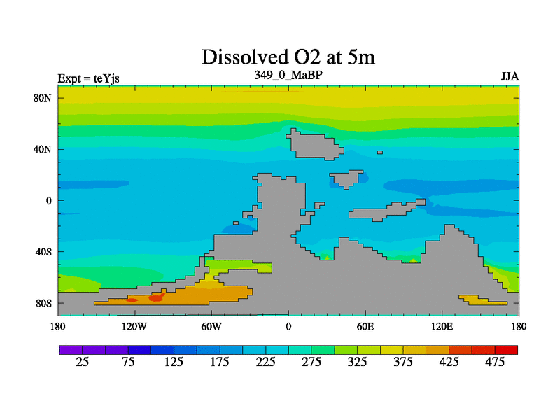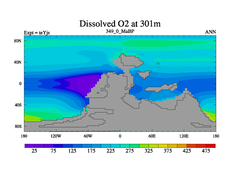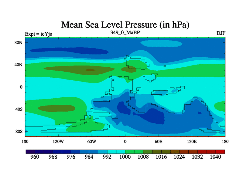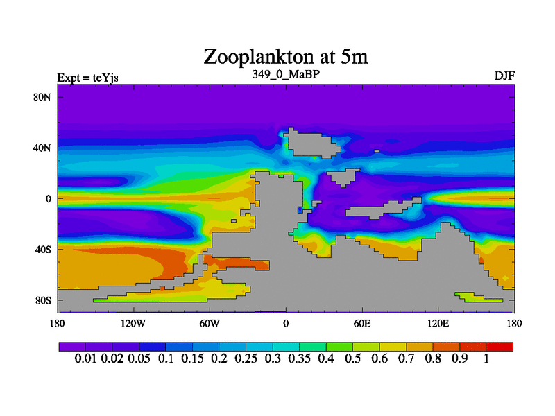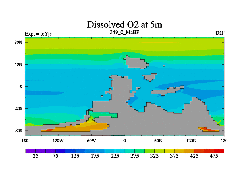 This is the 349.0 Ma simulation using the Scotese palaeogeographies and revised CCN etc. As teyfa3 but corrected orography problem over Antartartica. Now includes ocean biogeochemistry