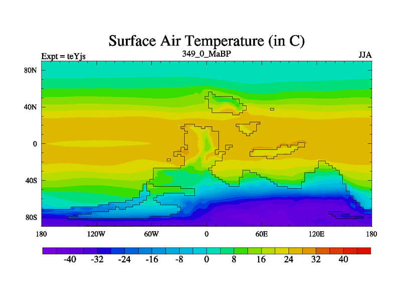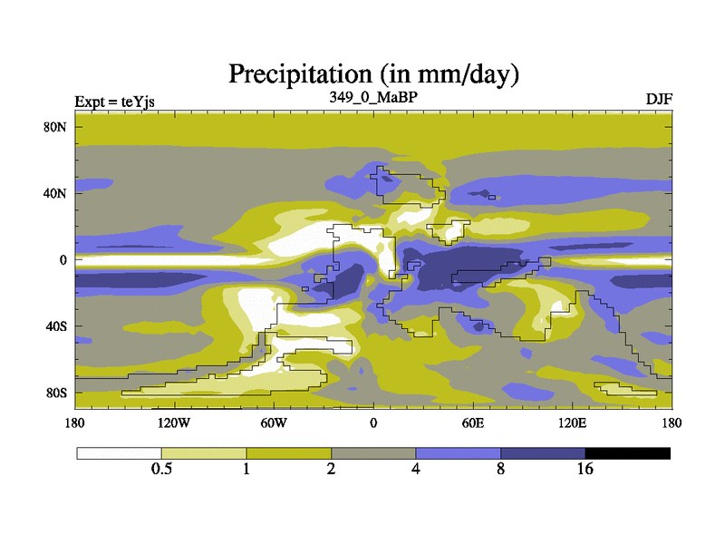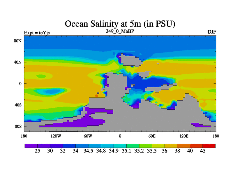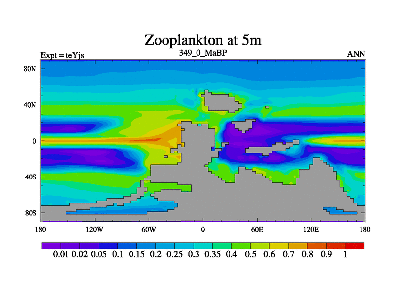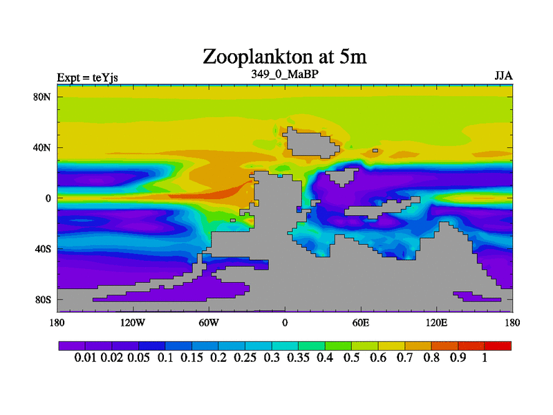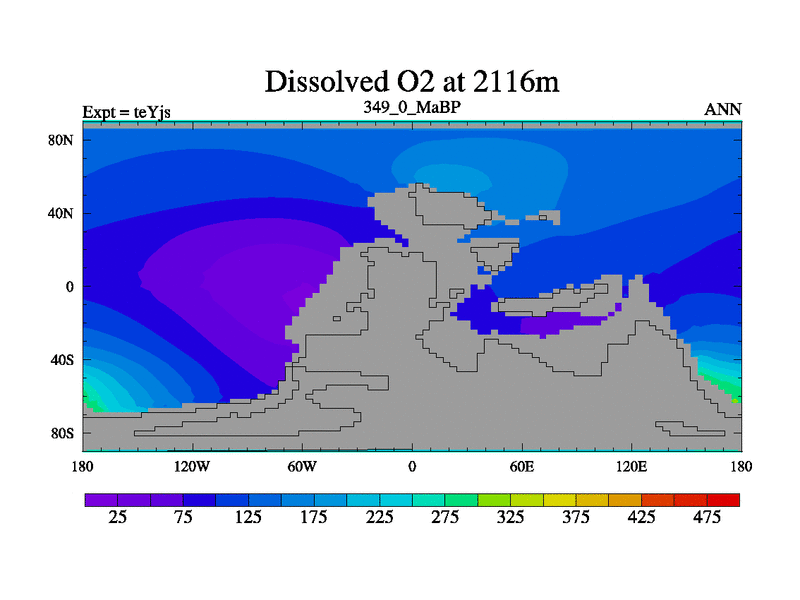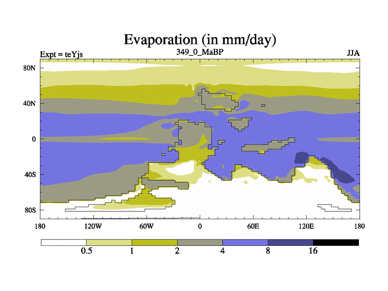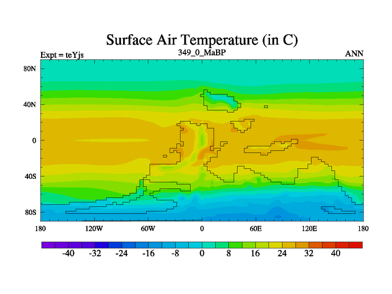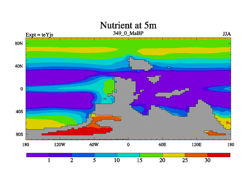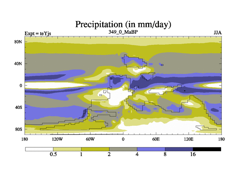 This is the 349.0 Ma simulation using the Scotese palaeogeographies and revised CCN etc. As teyfa3 but corrected orography problem over Antartartica. Now includes ocean biogeochemistry