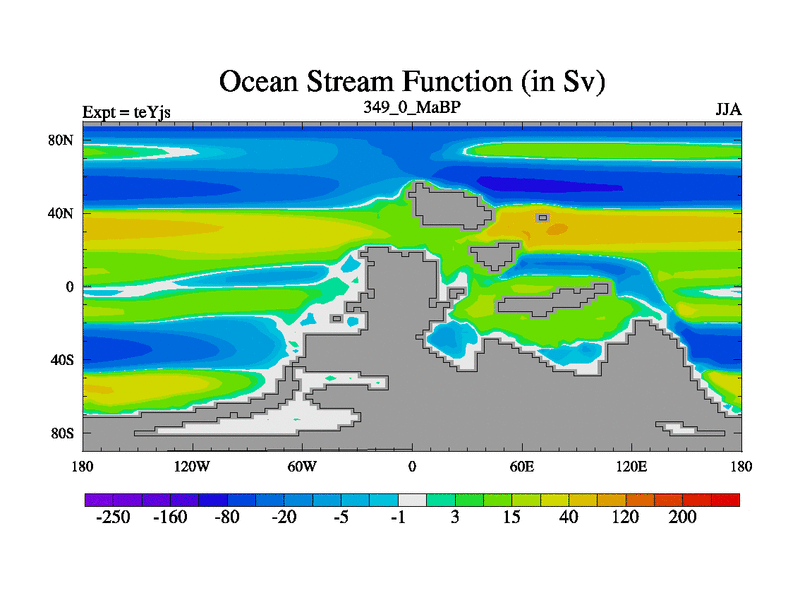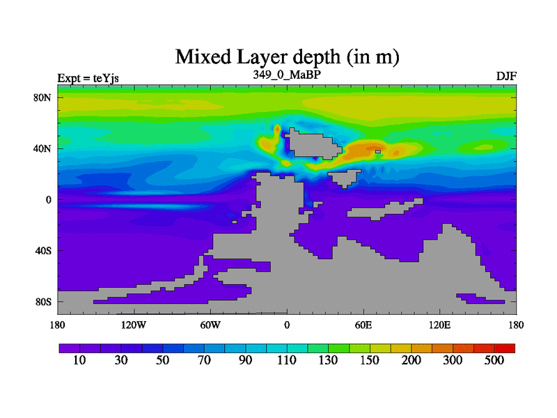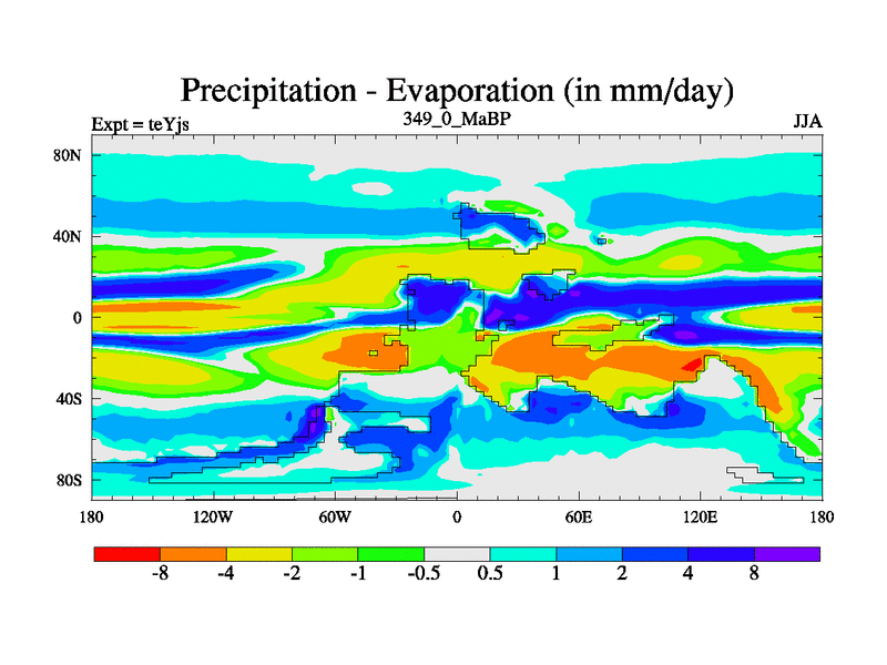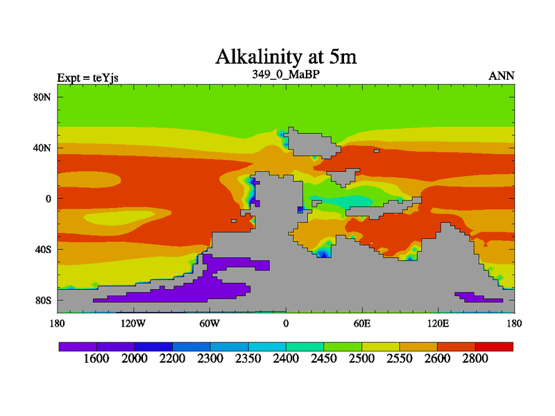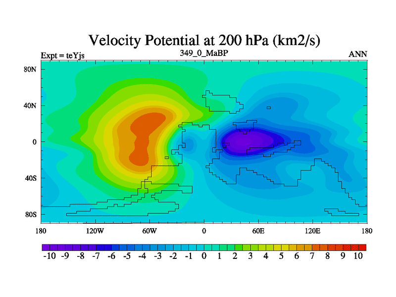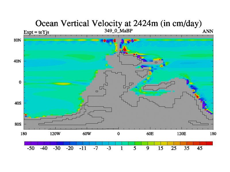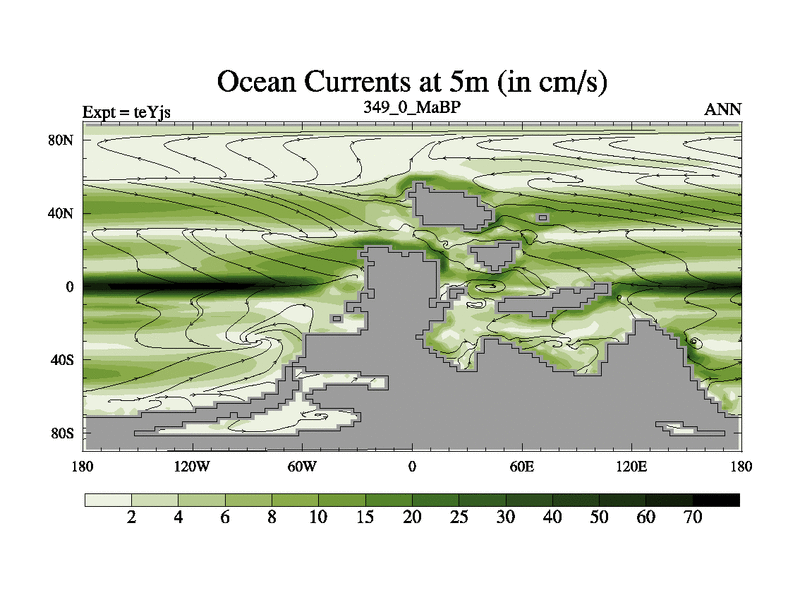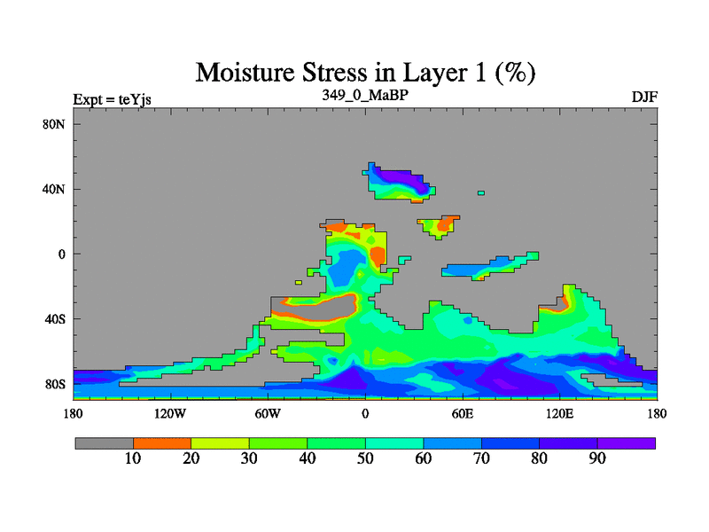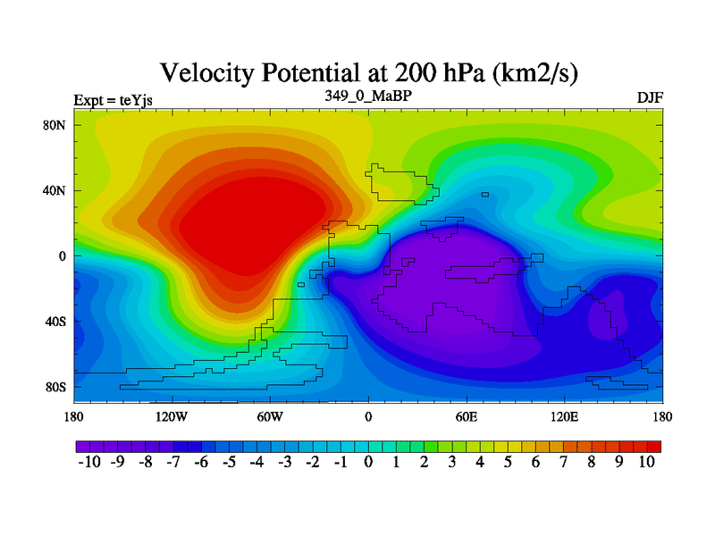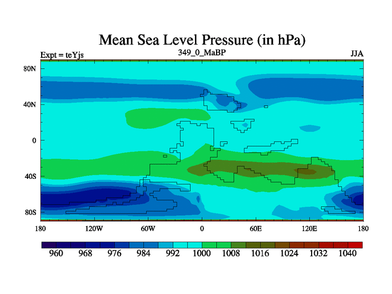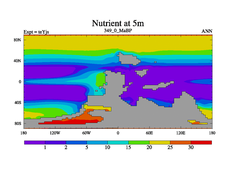 This is the 349.0 Ma simulation using the Scotese palaeogeographies and revised CCN etc. As teyfa3 but corrected orography problem over Antartartica. Now includes ocean biogeochemistry