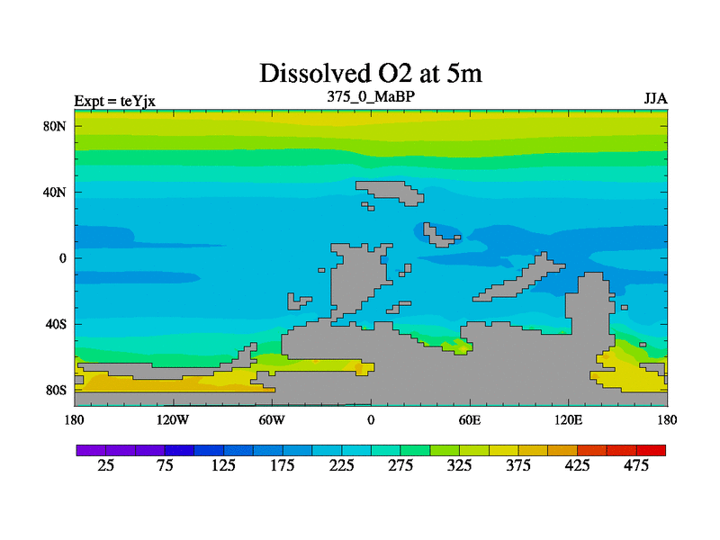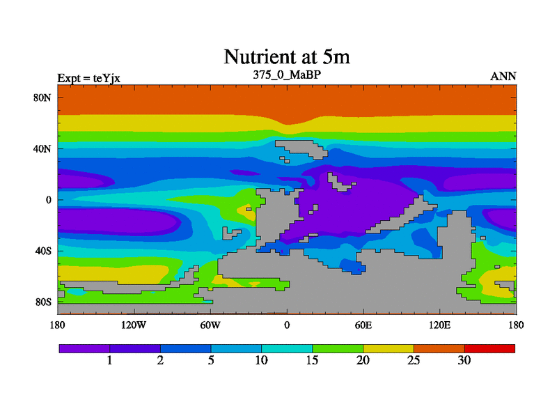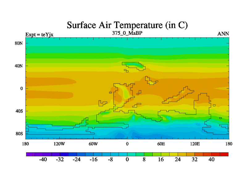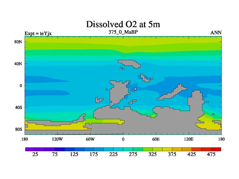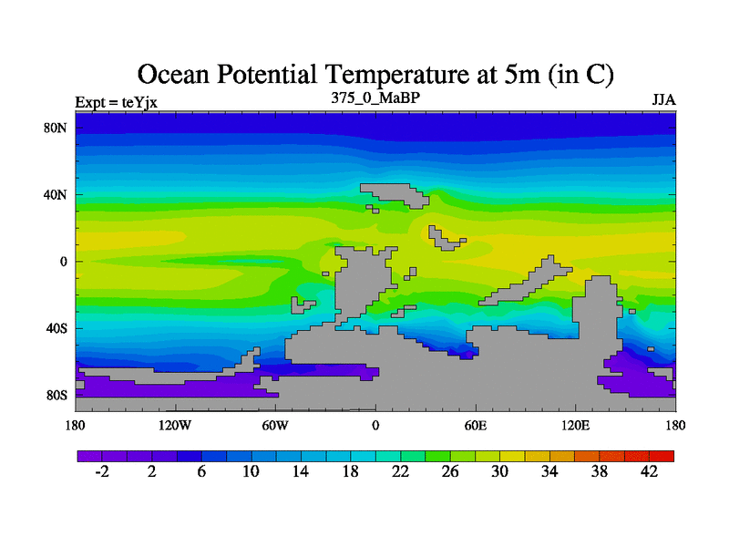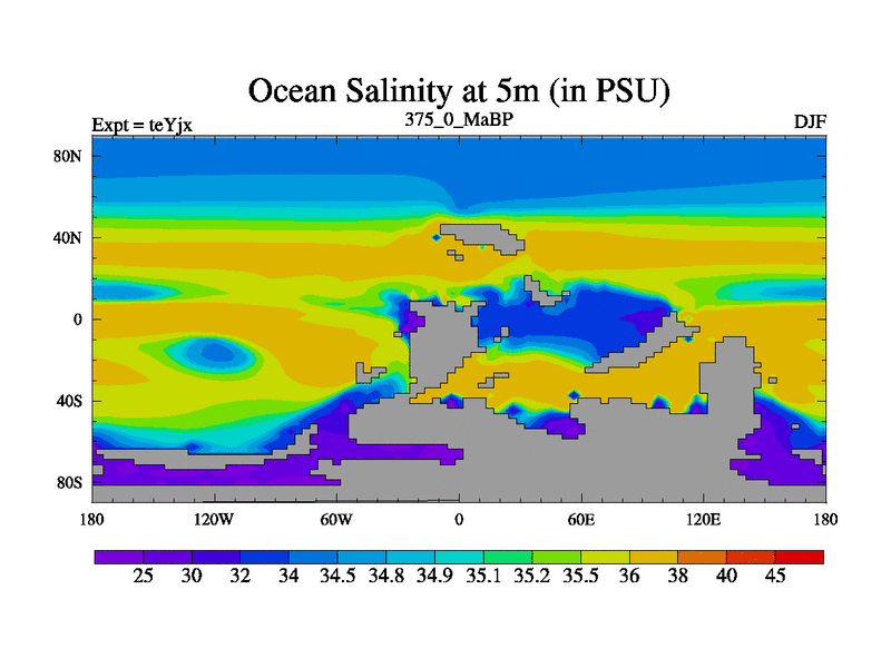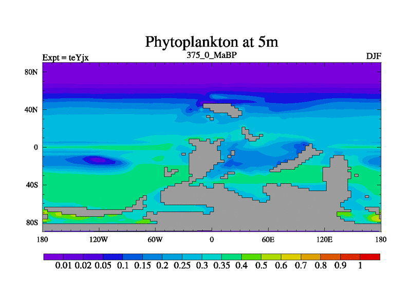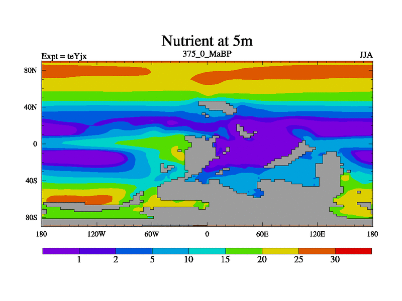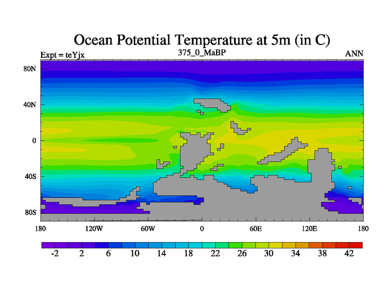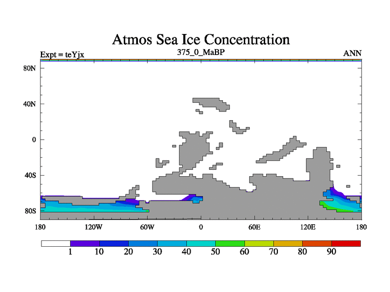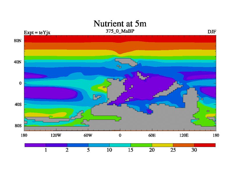 This is the 375.0 Ma simulation using the Scotese palaeogeographies and revised CCN etc. As teyfa3 but corrected orography problem over Antartartica. Now includes ocean biogeochemistry