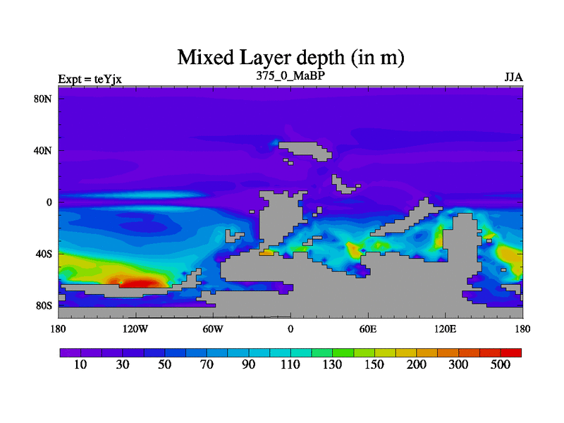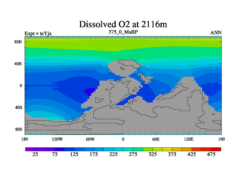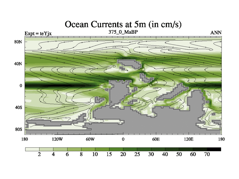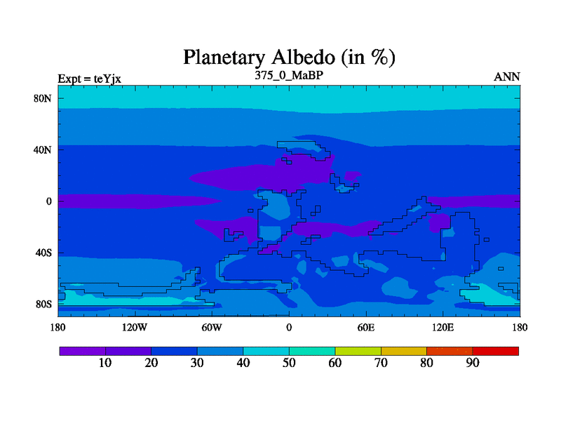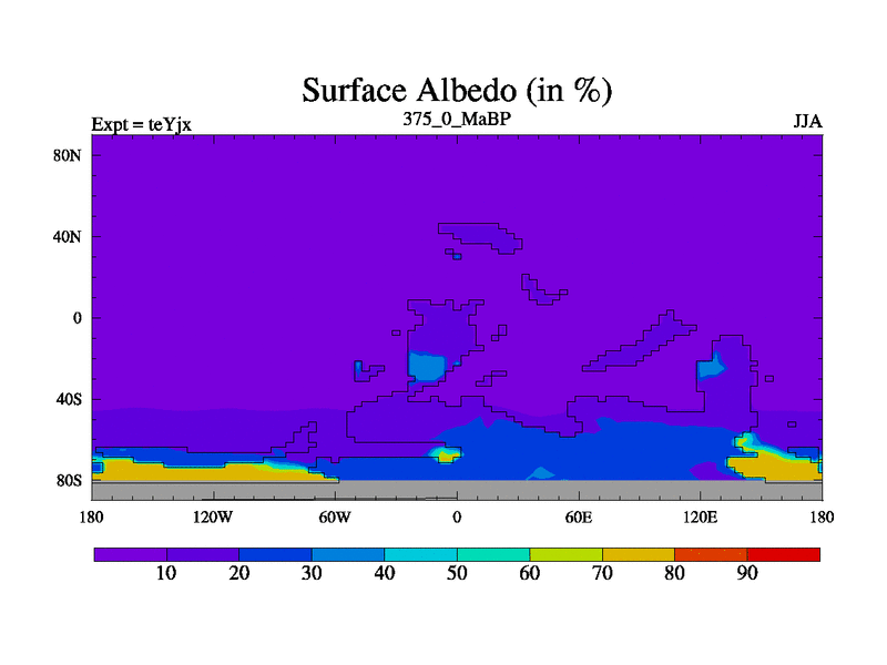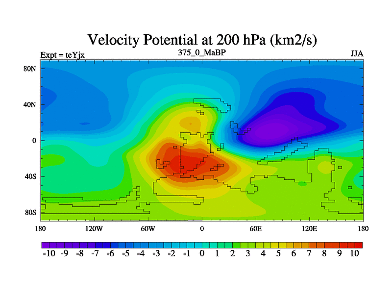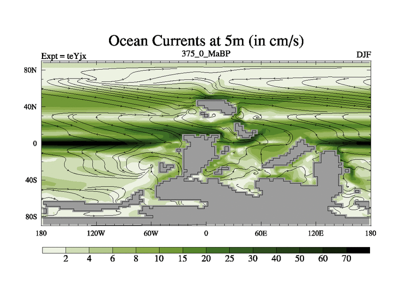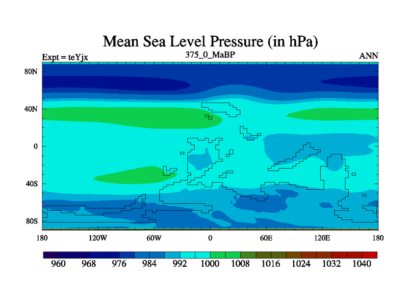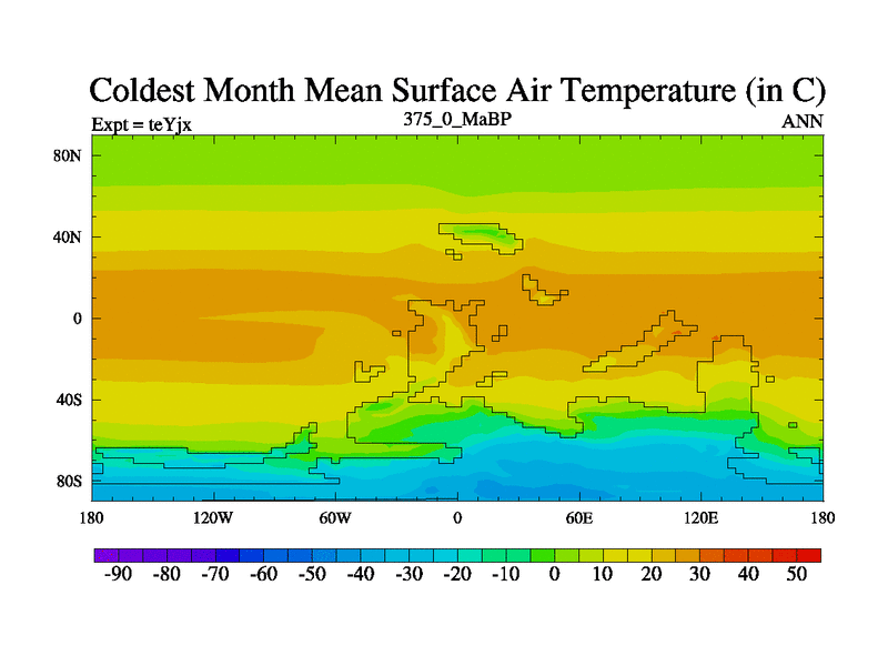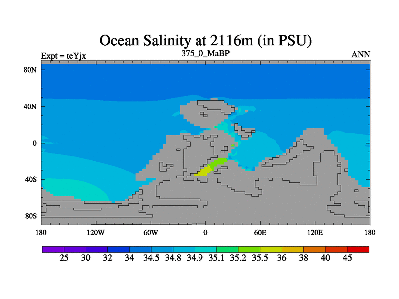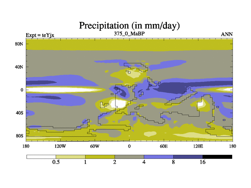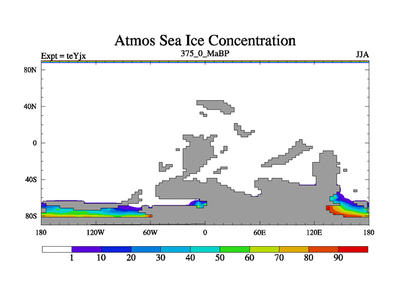 This is the 375.0 Ma simulation using the Scotese palaeogeographies and revised CCN etc. As teyfa3 but corrected orography problem over Antartartica. Now includes ocean biogeochemistry