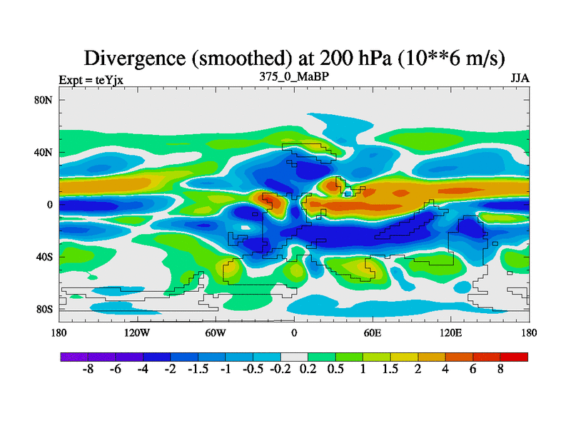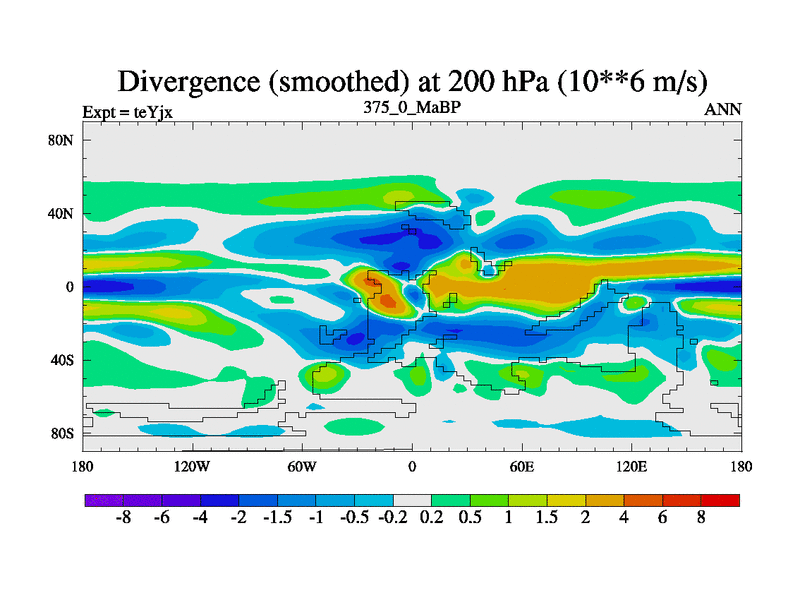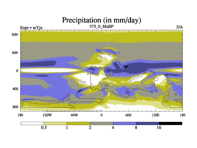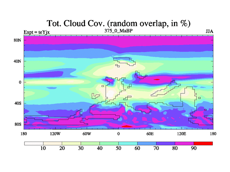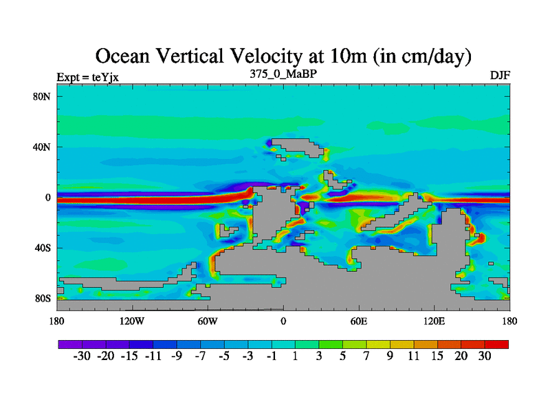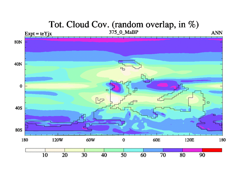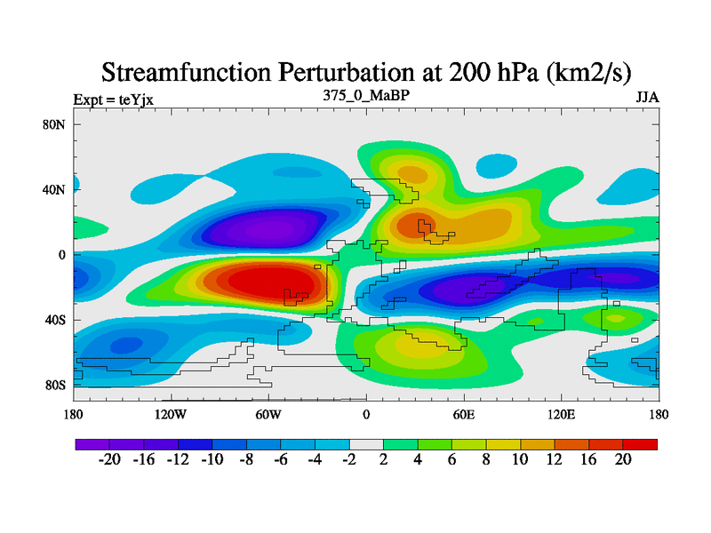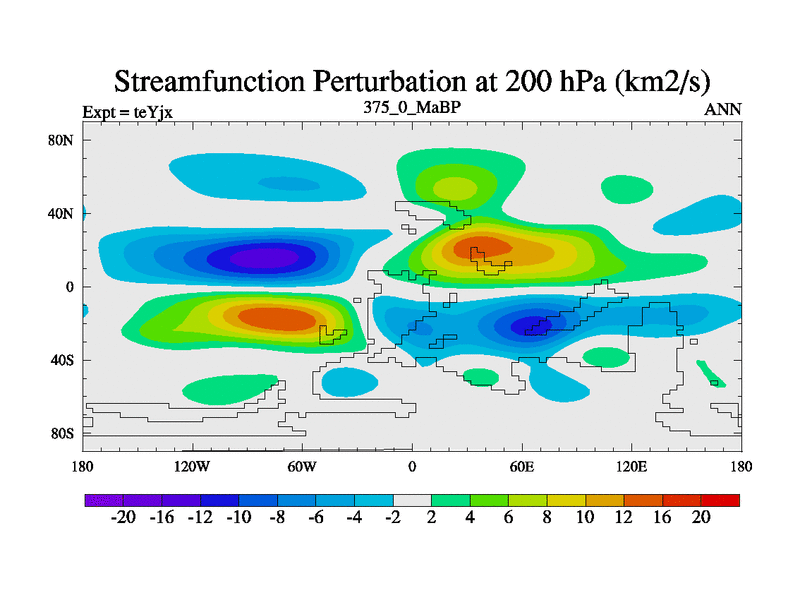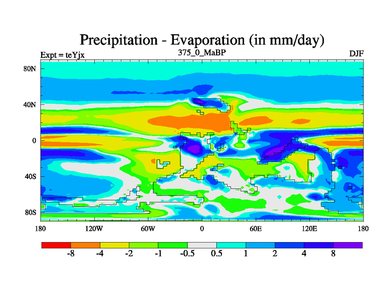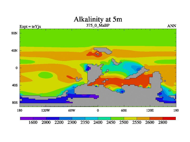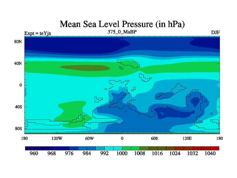 This is the 375.0 Ma simulation using the Scotese palaeogeographies and revised CCN etc. As teyfa3 but corrected orography problem over Antartartica. Now includes ocean biogeochemistry