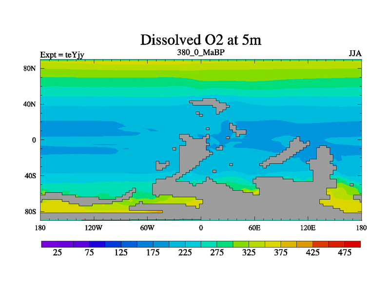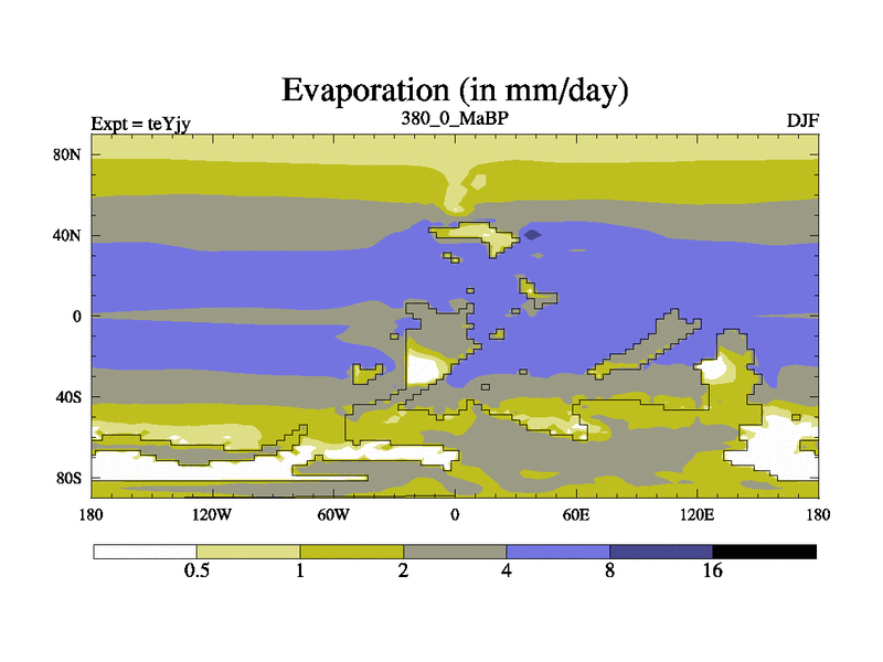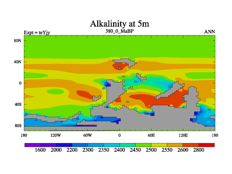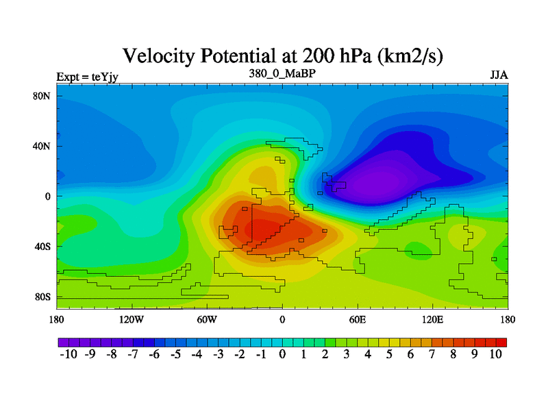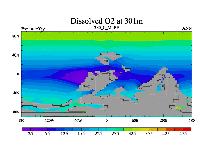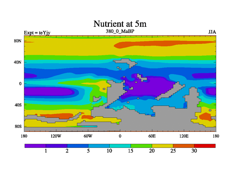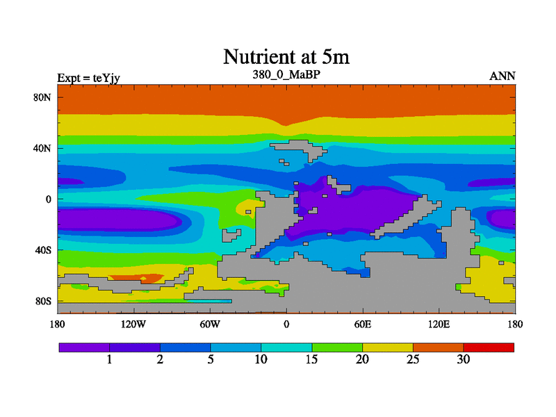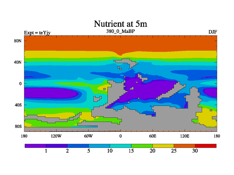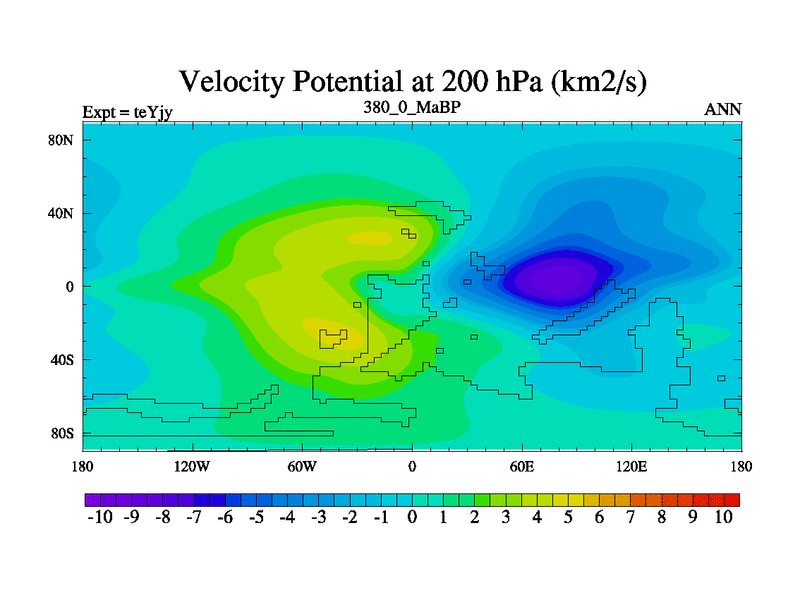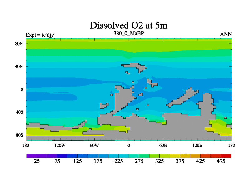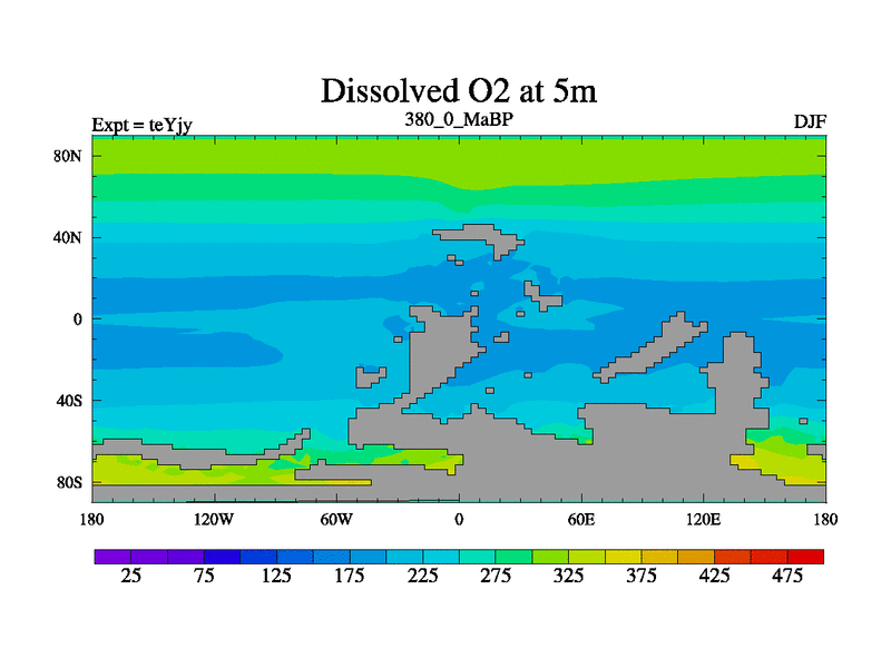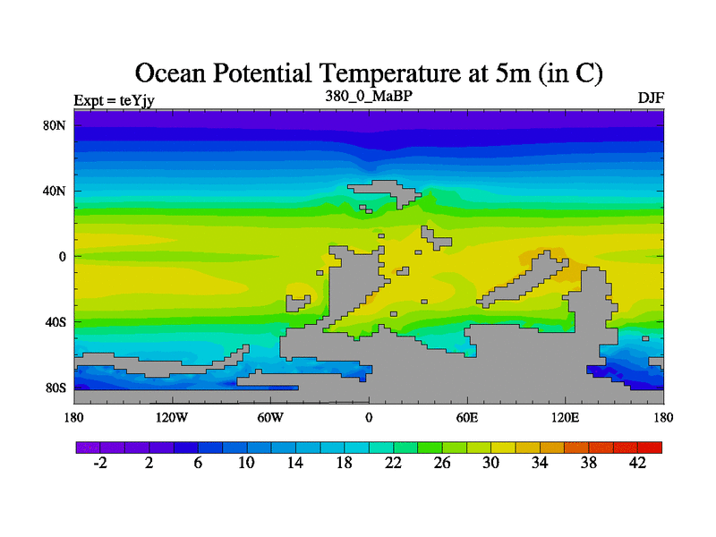 This is the 380.0 Ma simulation using the Scotese palaeogeographies and revised CCN etc. As teyfa3 but corrected orography problem over Antartartica. Now includes ocean biogeochemistry