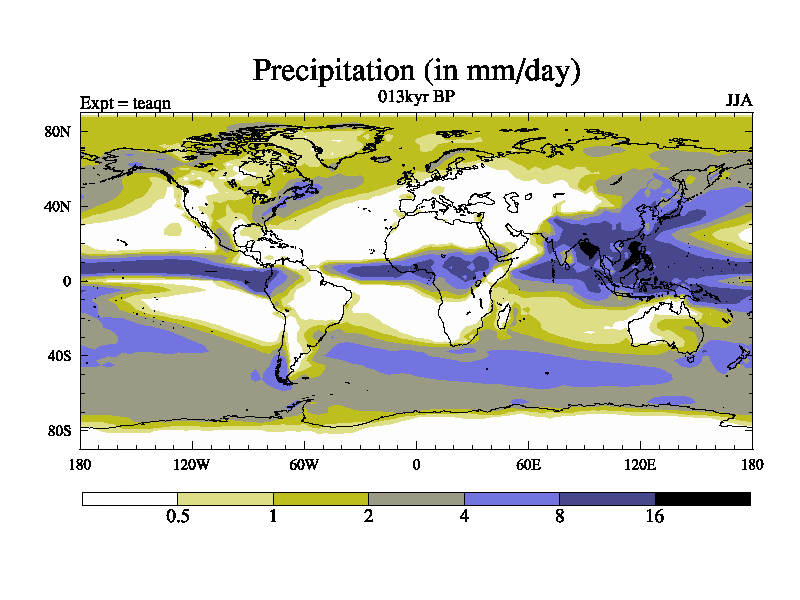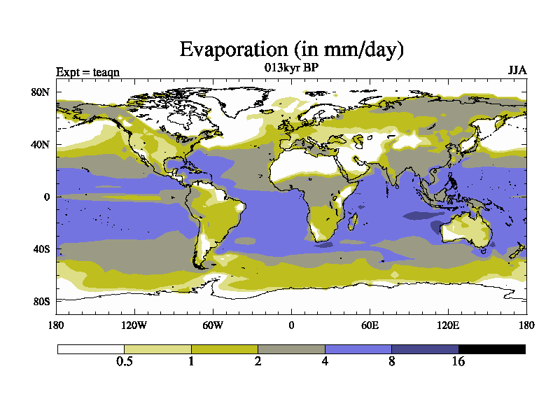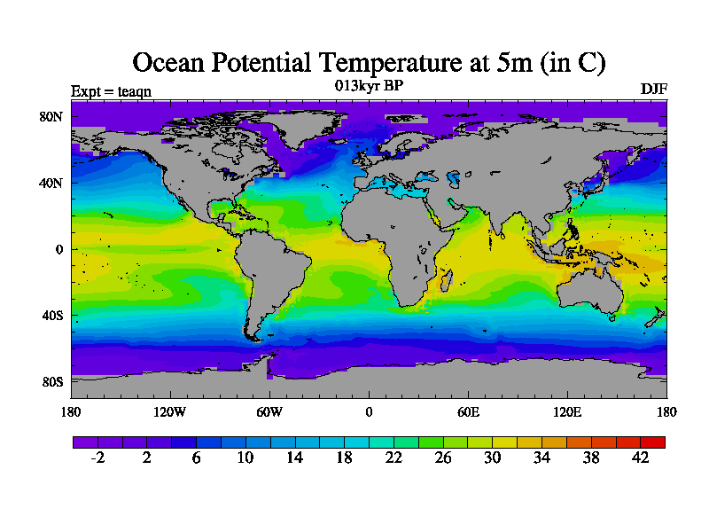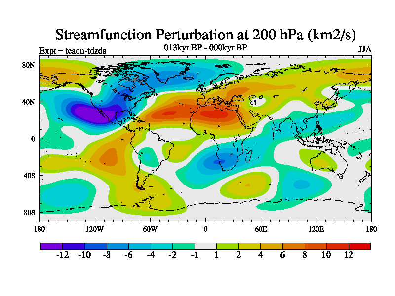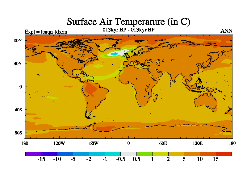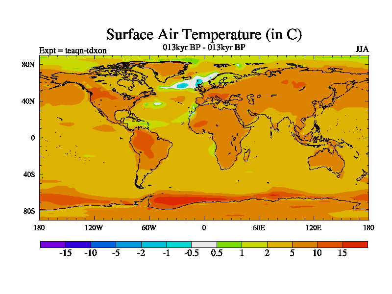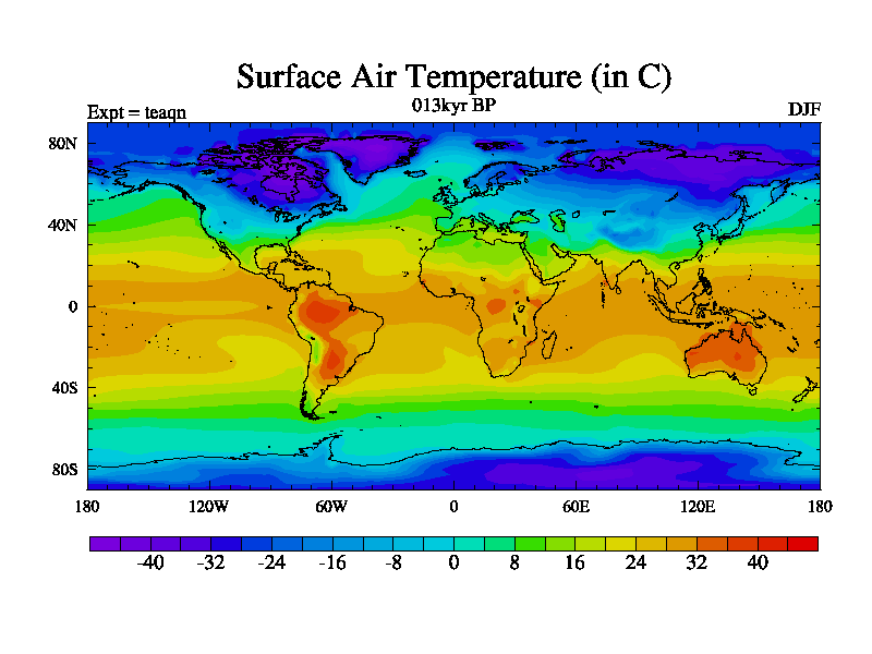 This is the 013kyr BP simulation for a new set of BBC runs using TRIFFID. Static mode, started from half way through tdxo set of simulations (new BBC static TRIFFID runs). This version includes the dark_respiration update. Vegetation is from the pre-industrial run tdwza, and CO2 is quadrupled over tdxo version.