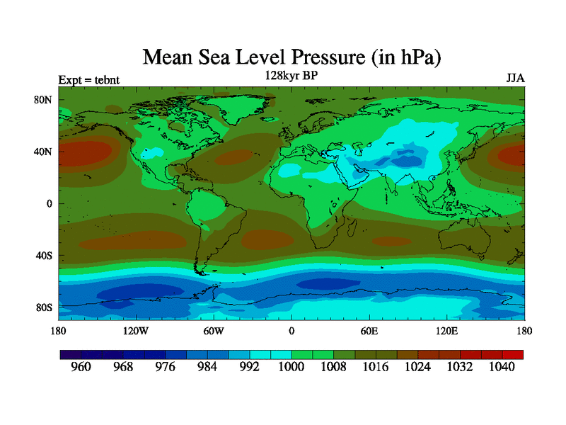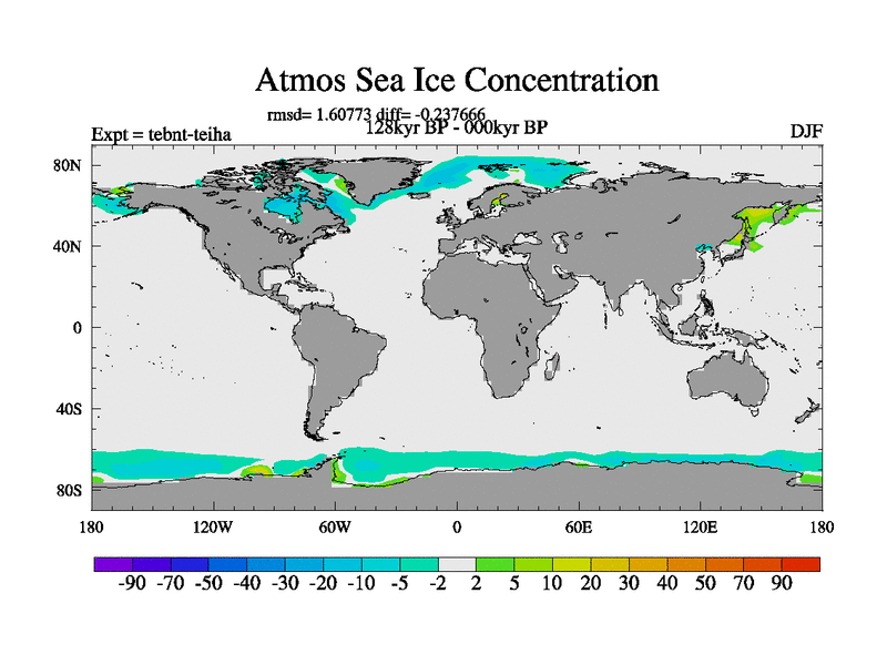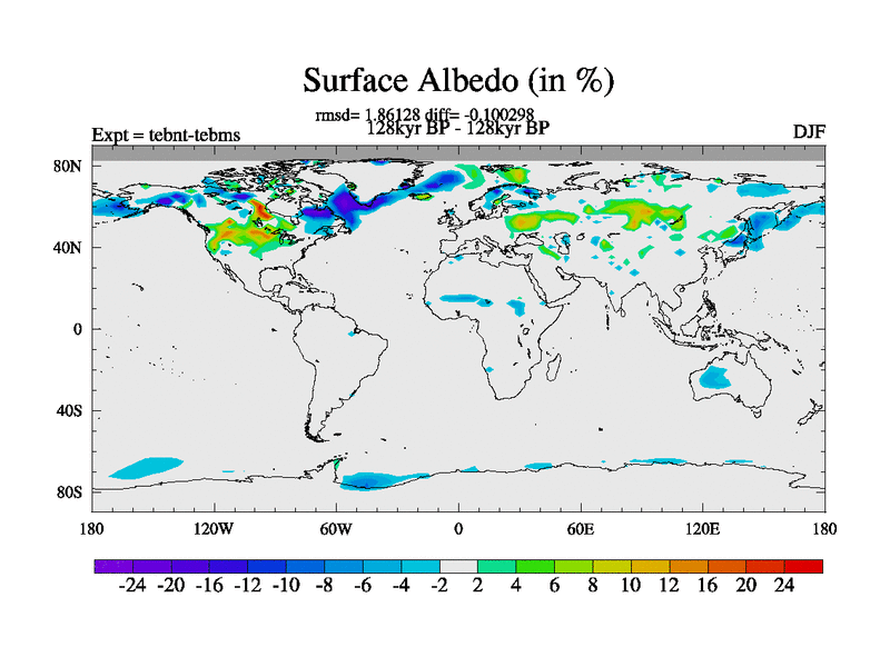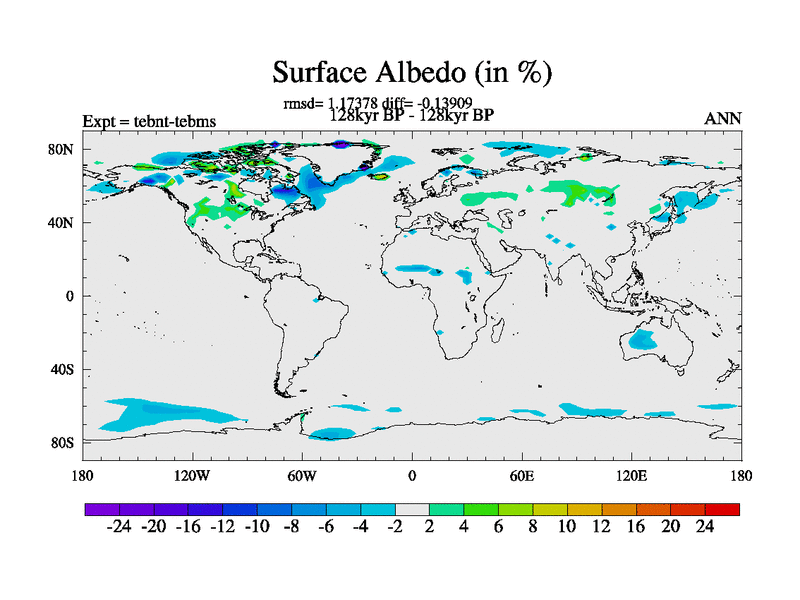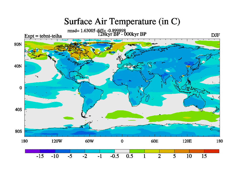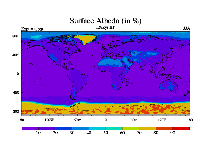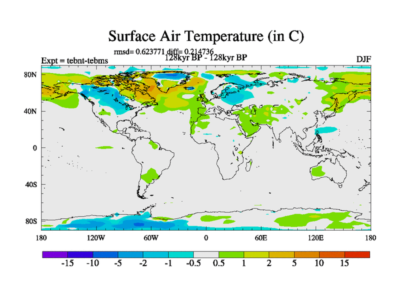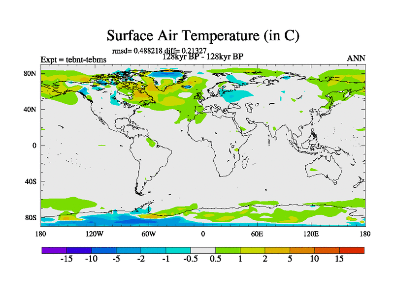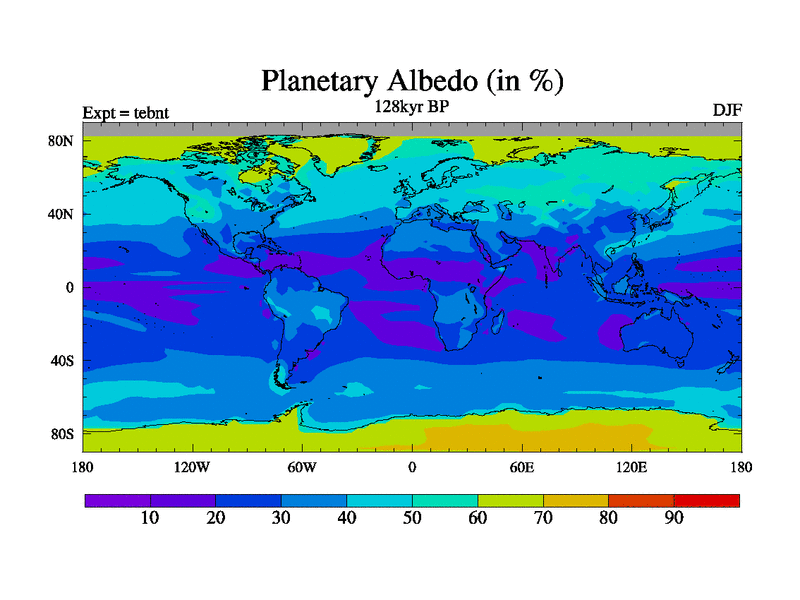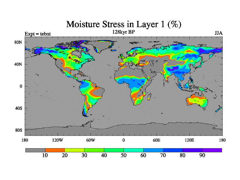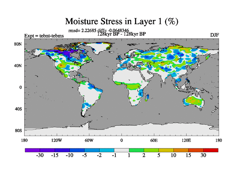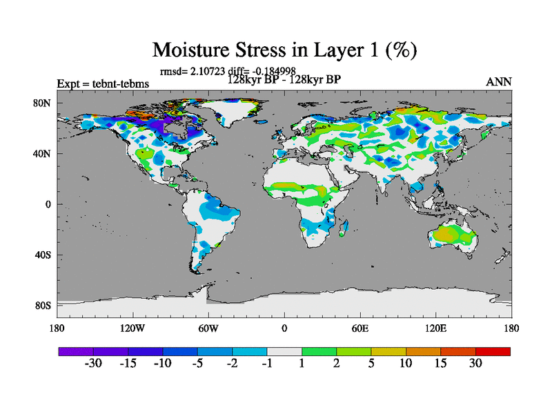 This is the 128kyr BP simulation for a new set of BBC runs using TRIFFID. Dynamic mode, started from tdwt set of simulations (new BBC dynamic TRIFFID runs). This version includes the dark_respiration update. There is change in ice based on DeBoer.
