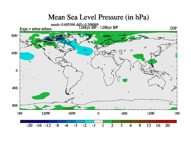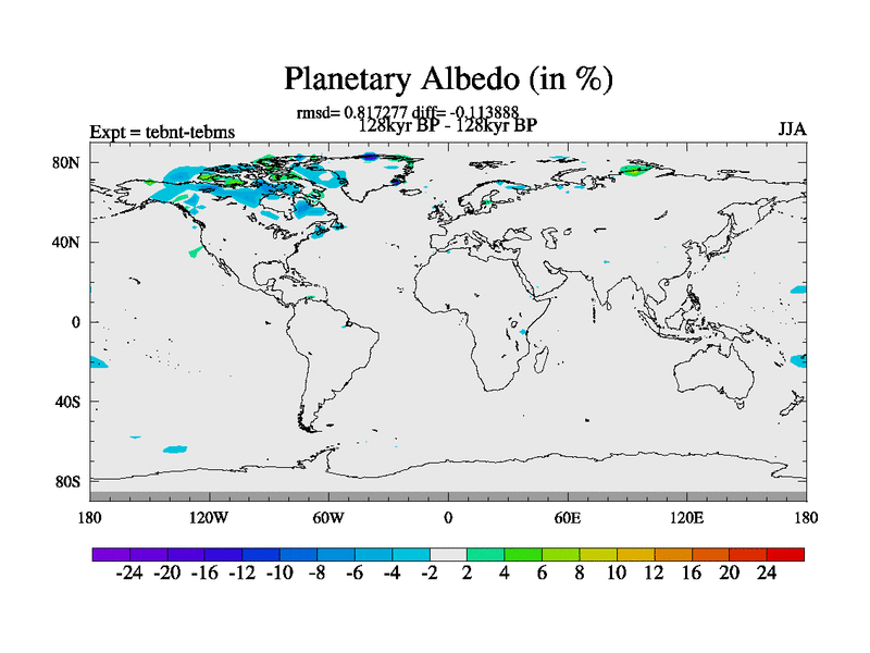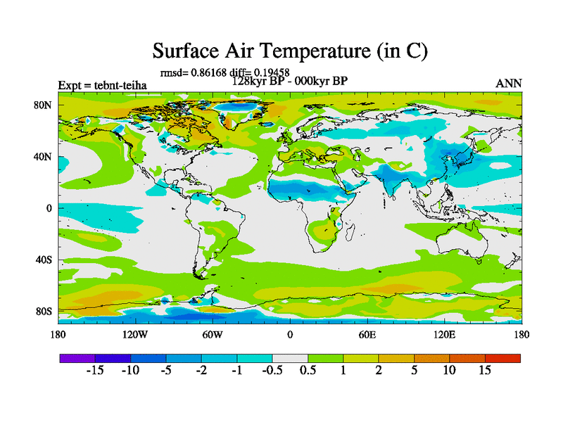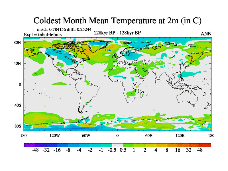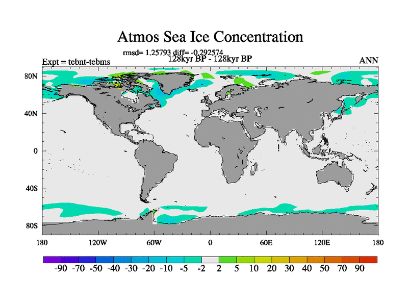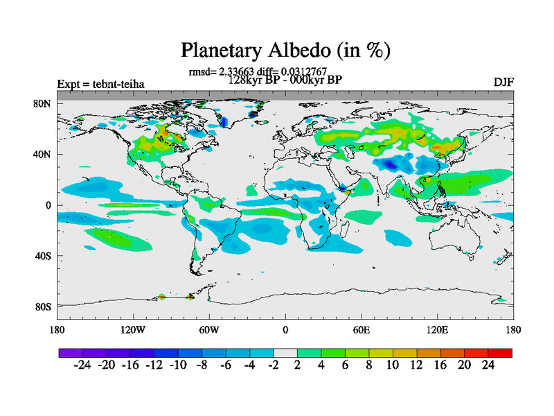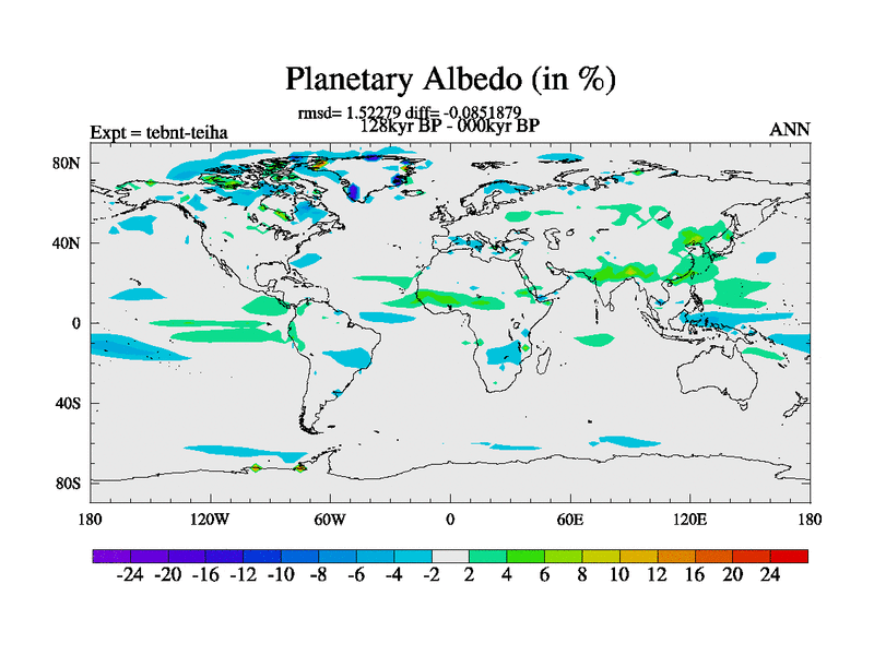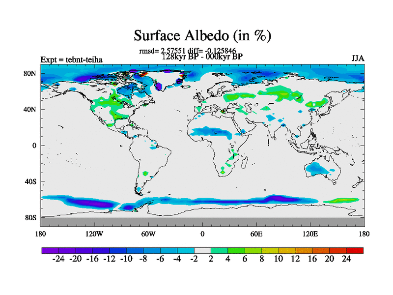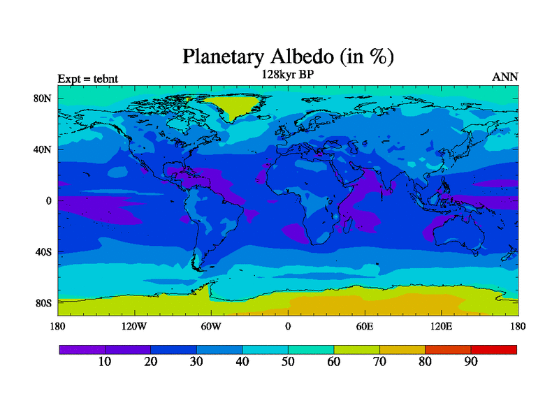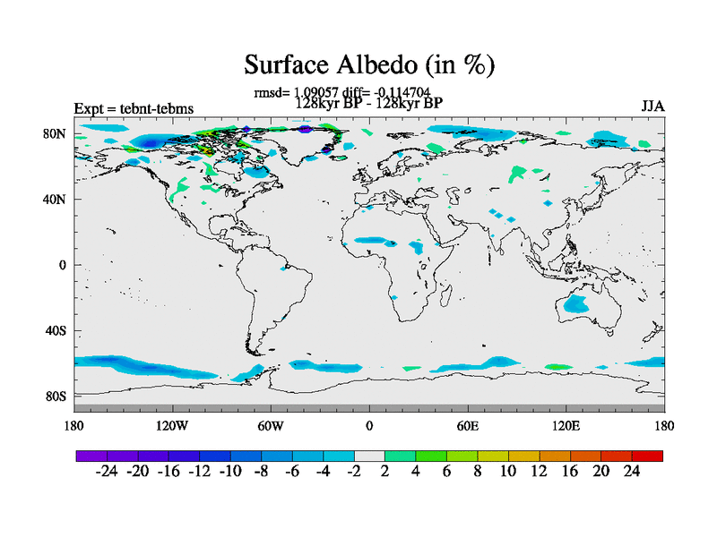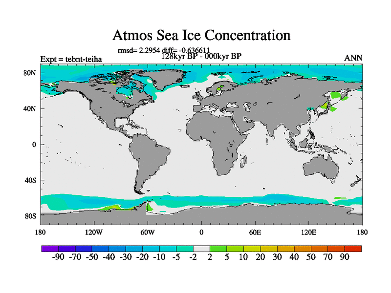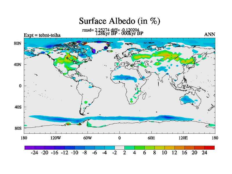 This is the 128kyr BP simulation for a new set of BBC runs using TRIFFID. Dynamic mode, started from tdwt set of simulations (new BBC dynamic TRIFFID runs). This version includes the dark_respiration update. There is change in ice based on DeBoer.