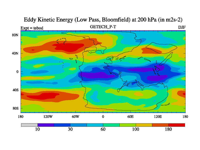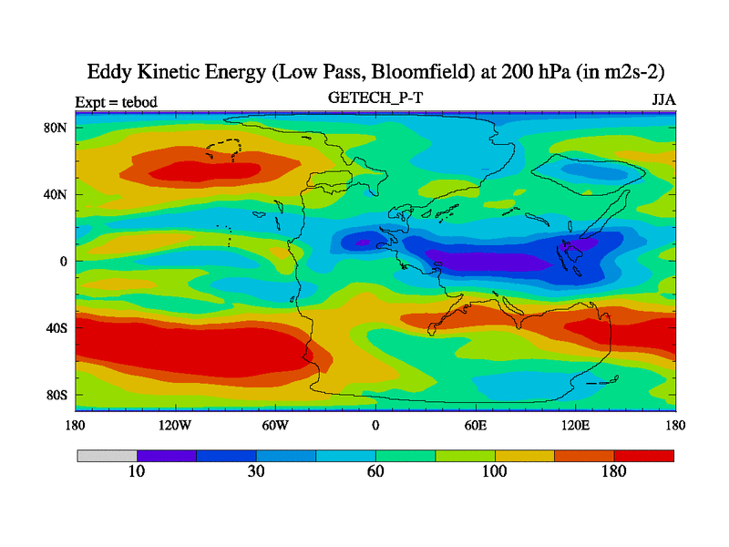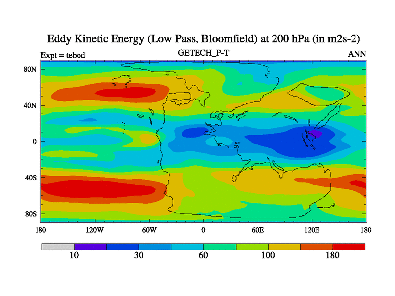 Low Pass Eddy Kinetic Energy at 200 hPa