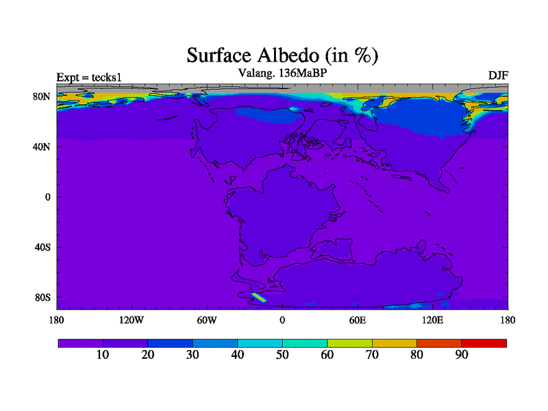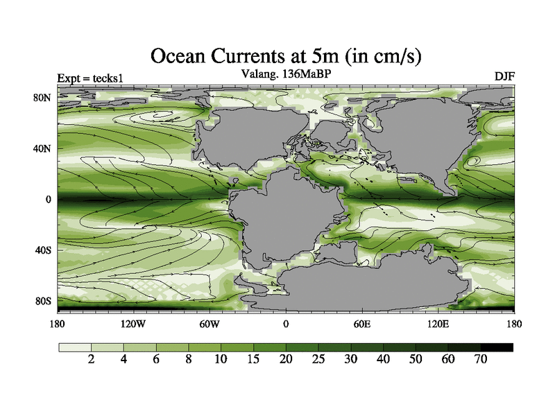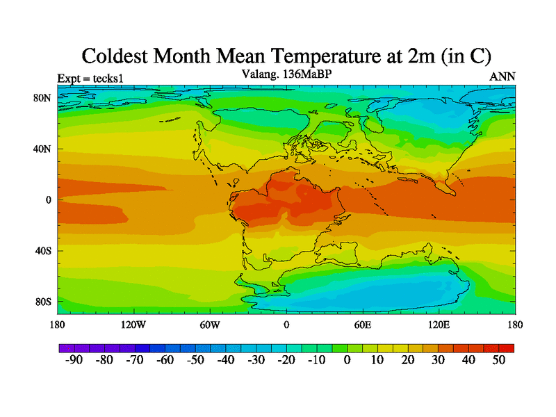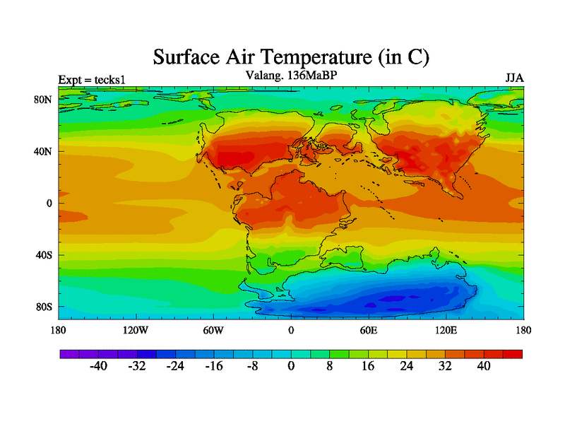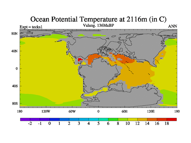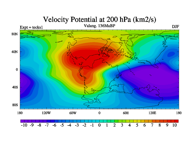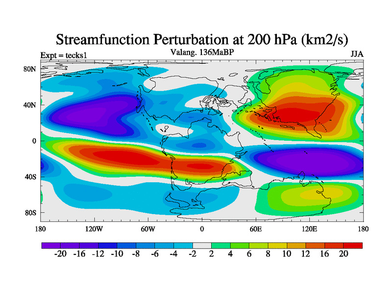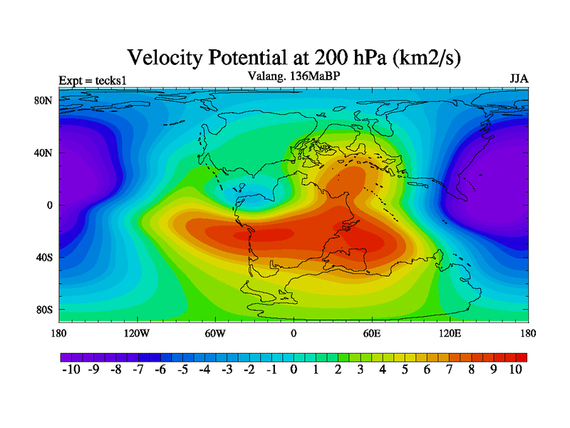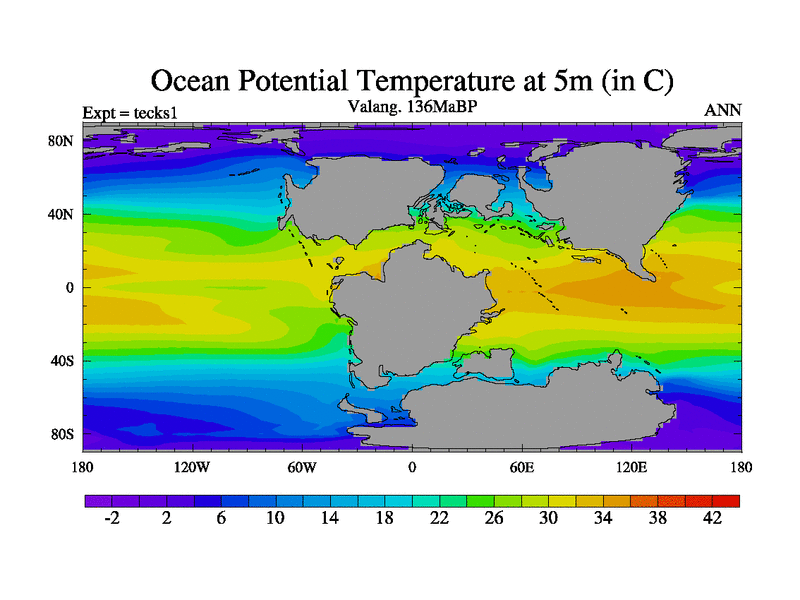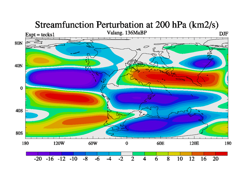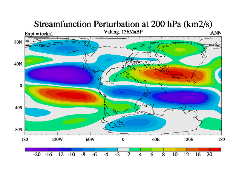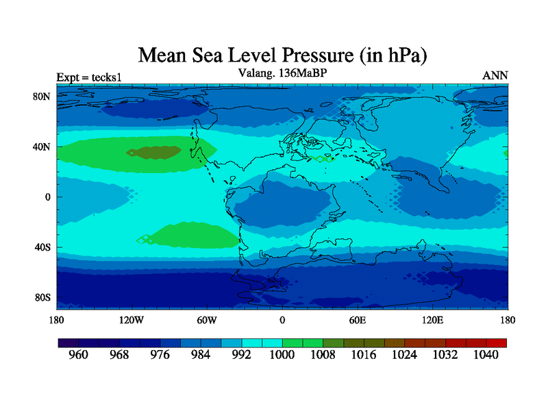 This is a Valanginian simulation with new control palaeogeog, 3xco2 and with appropriate reduction in solar constant. It is also using the newer ozone mod which better represents the effects of stratospheric ozone. It does include the ocean stream function.