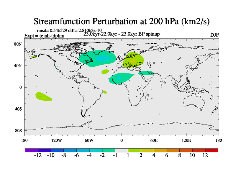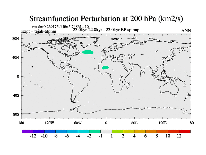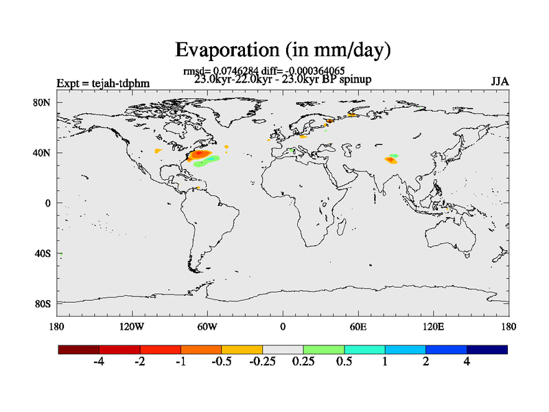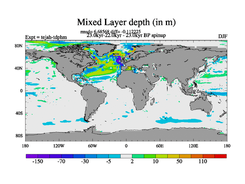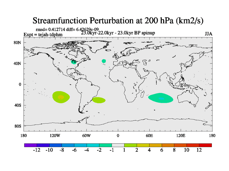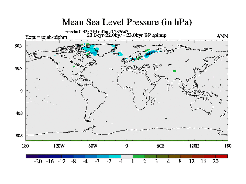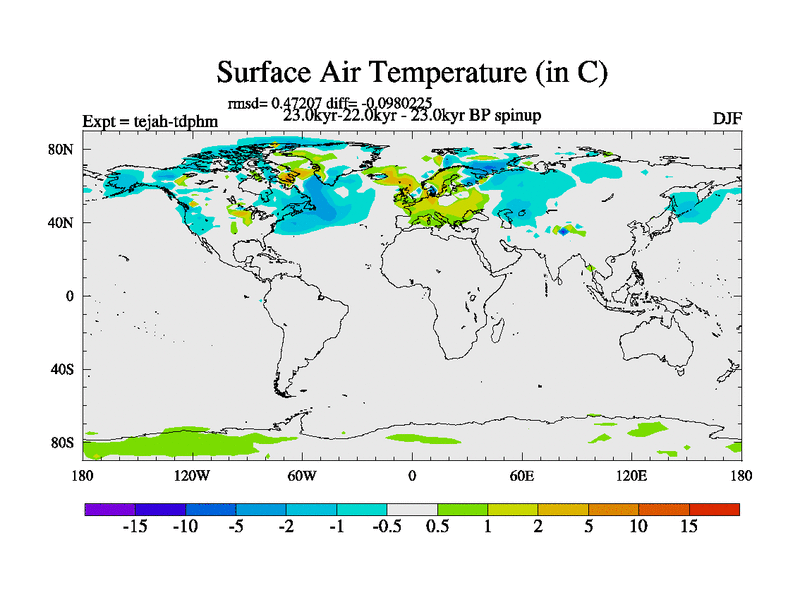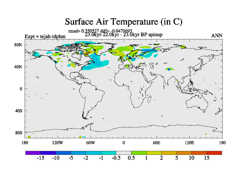 This is part of our deglaciation simulations. All forcings included except melt water fluxes. Started from the tdphm spinup. Revised runoff maps, Russian rivers to Med. This uses real meltwater fluxes. |