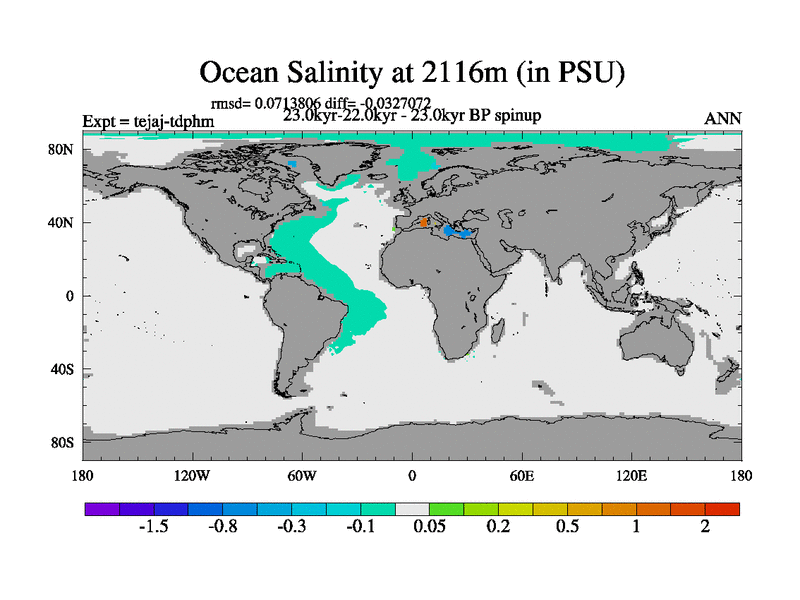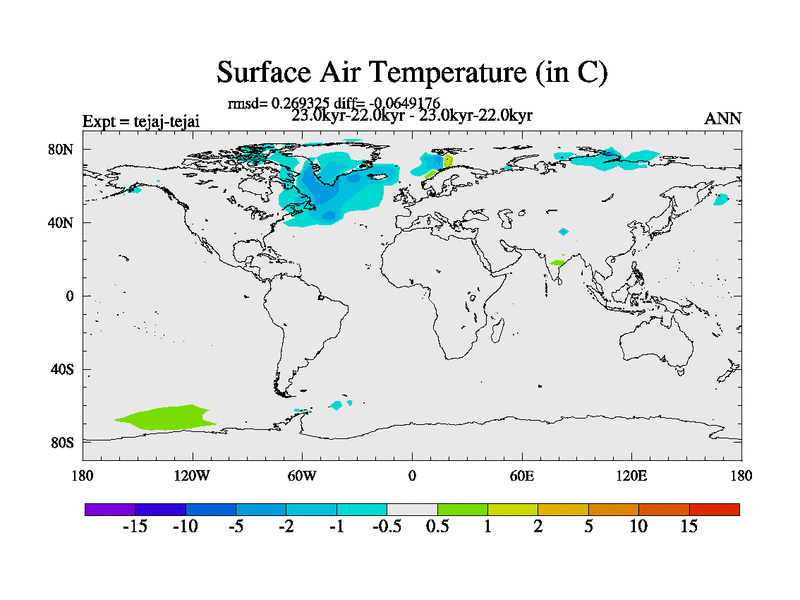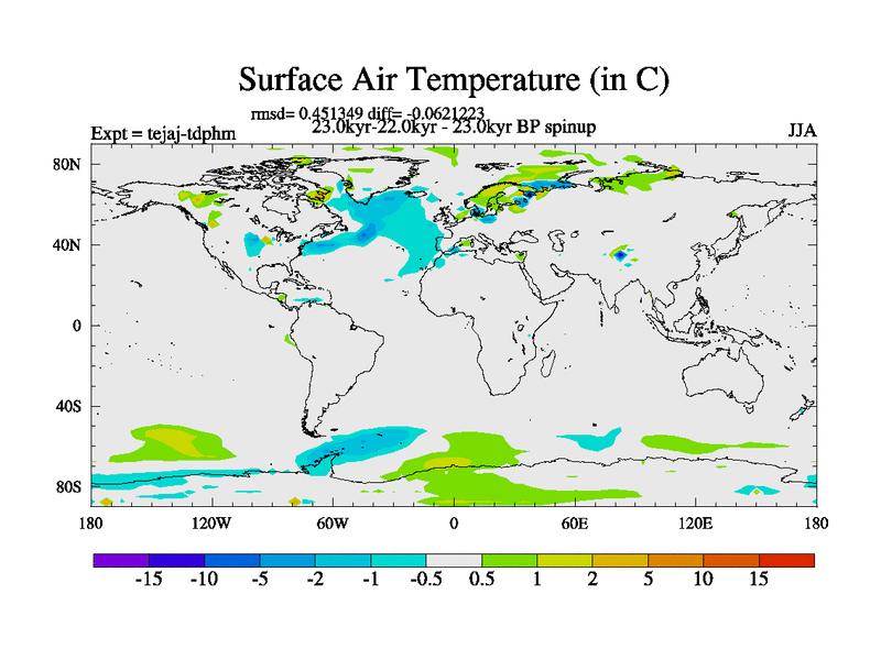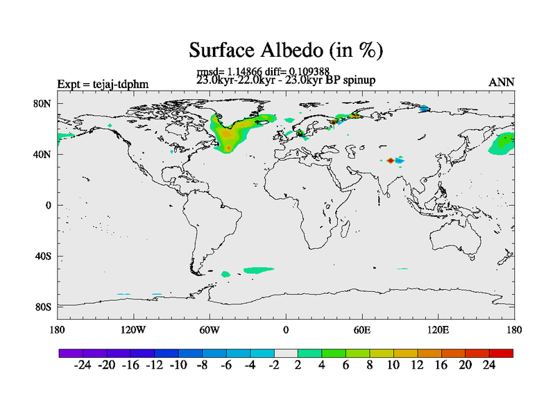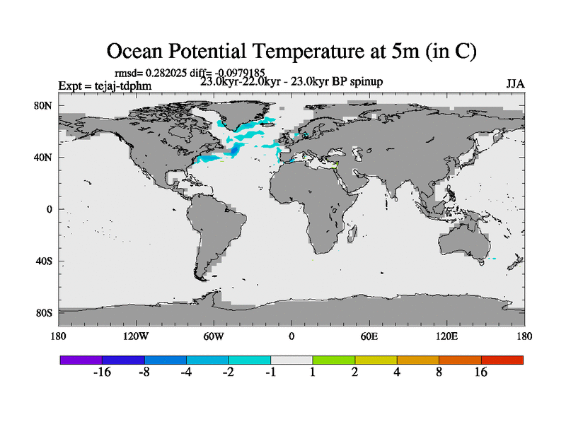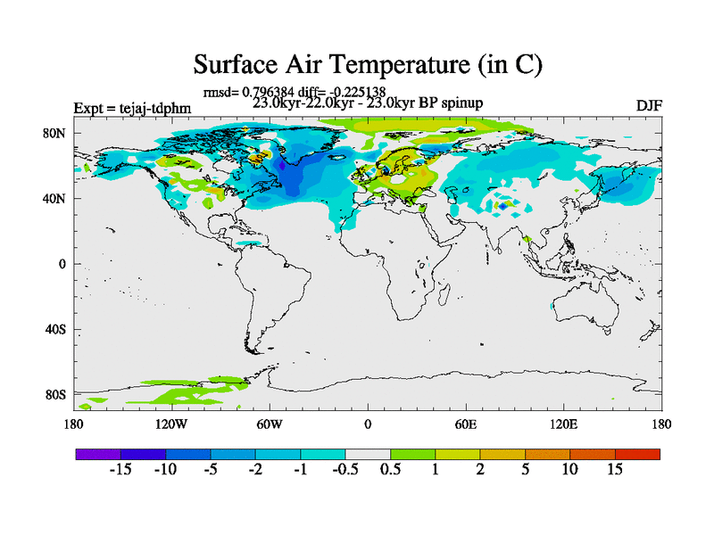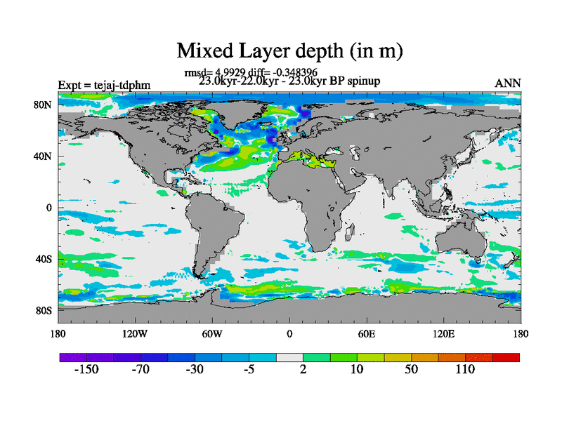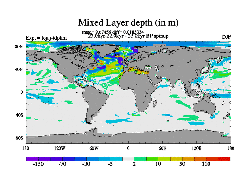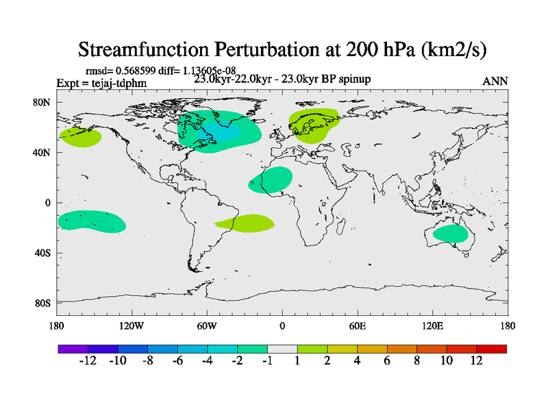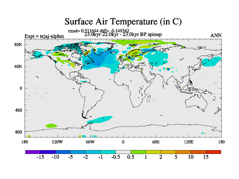 This is part of our deglaciation simulations. All forcings included except melt water fluxes. Started from the tdphm spinup. Revised runoff maps, Russian rivers to Arctic. This version with real meltwater. |