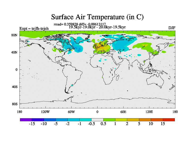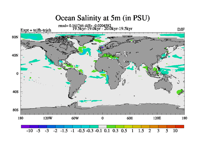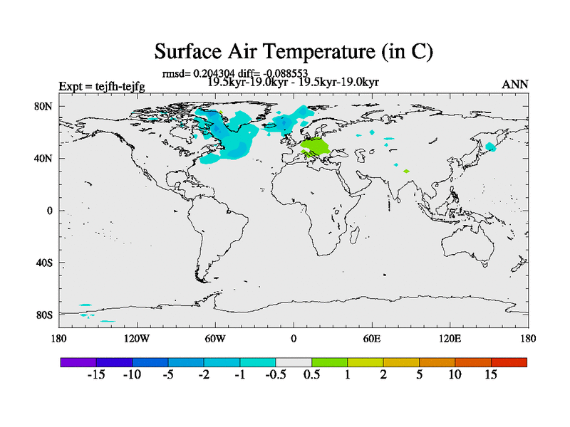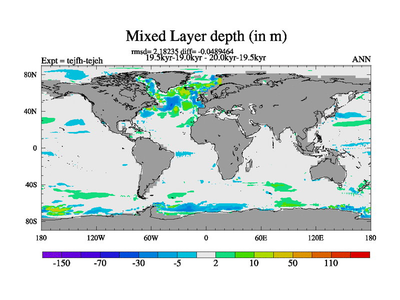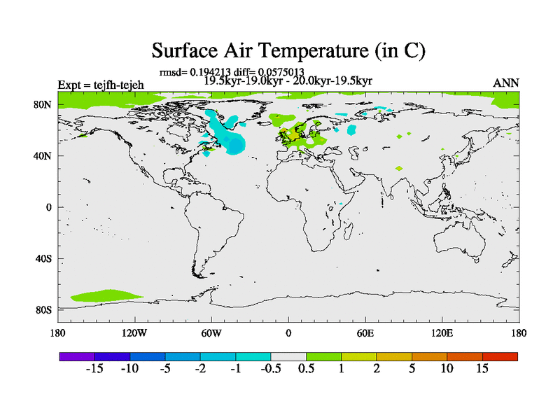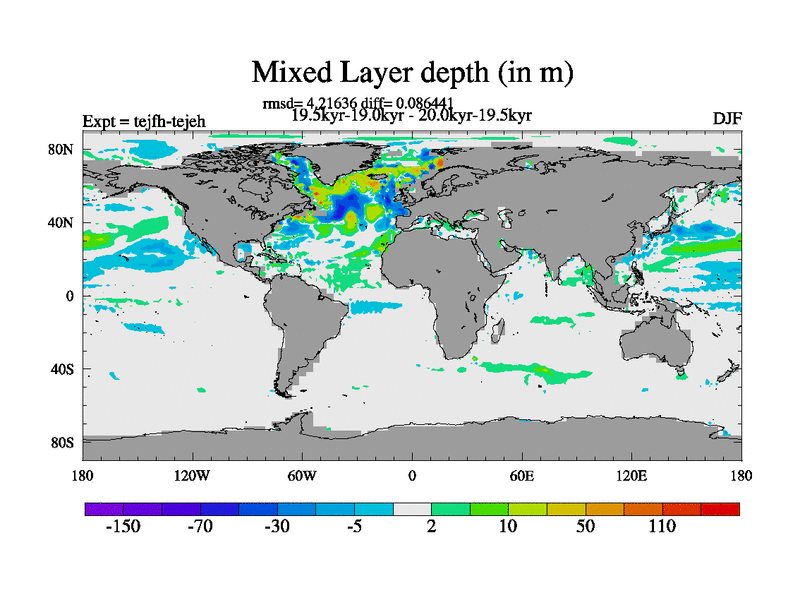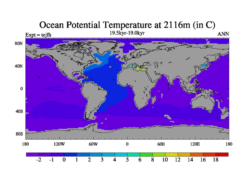 This is part of our deglaciation simulations. All forcings included except melt water fluxes. This series originally started from the tdphm spinup. Revised runoff maps, Russian rivers to Med. This vresion uses real meltwater fluxes. |