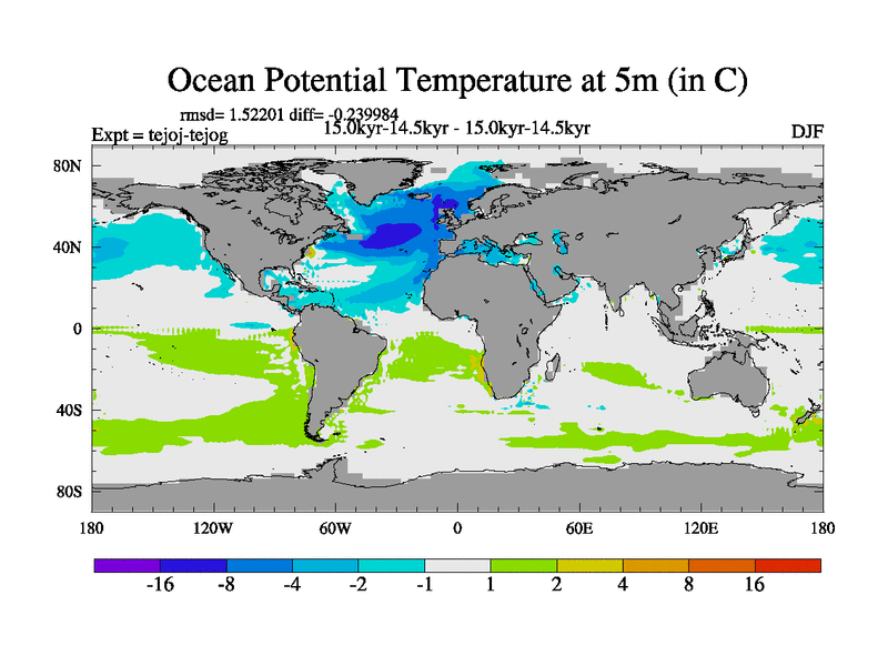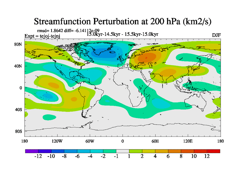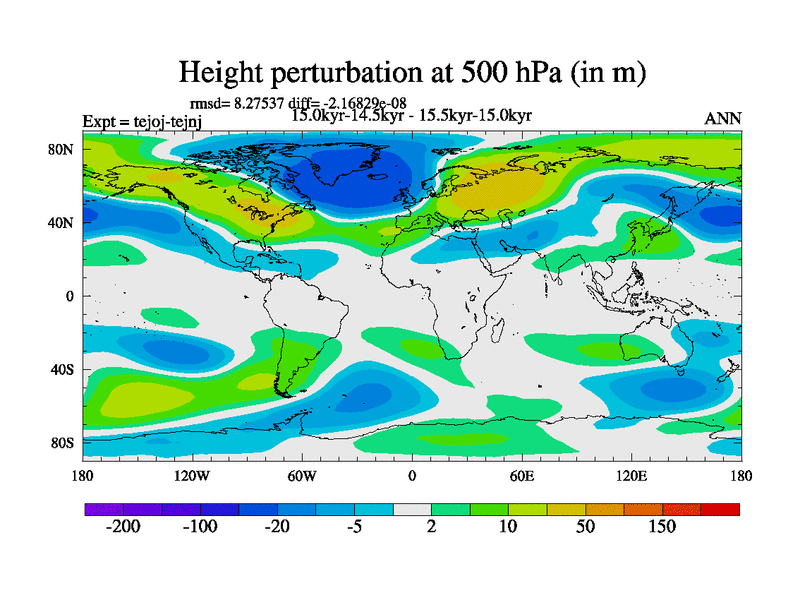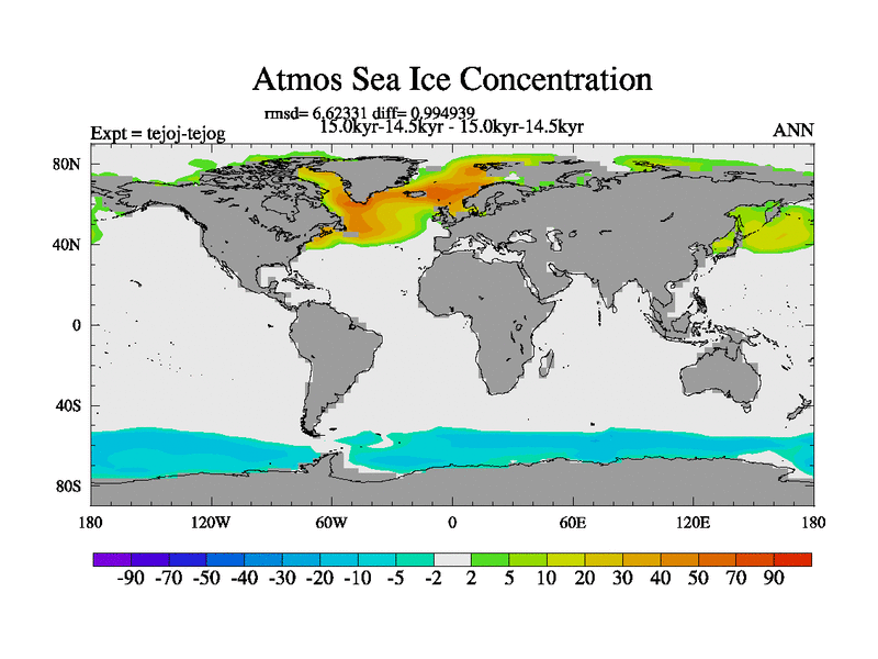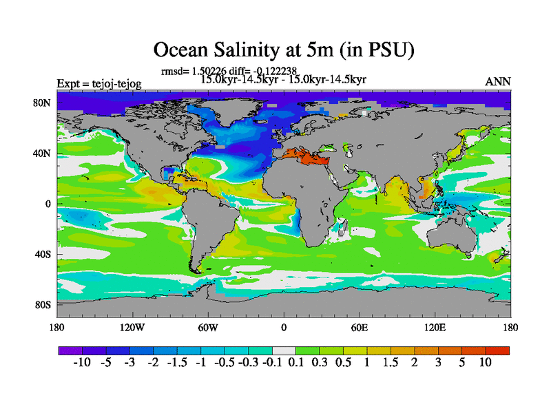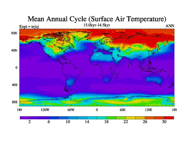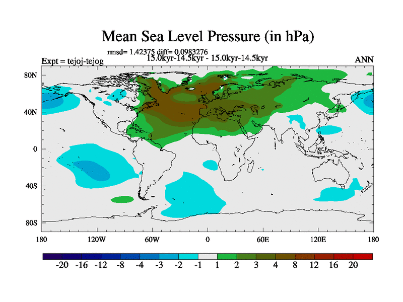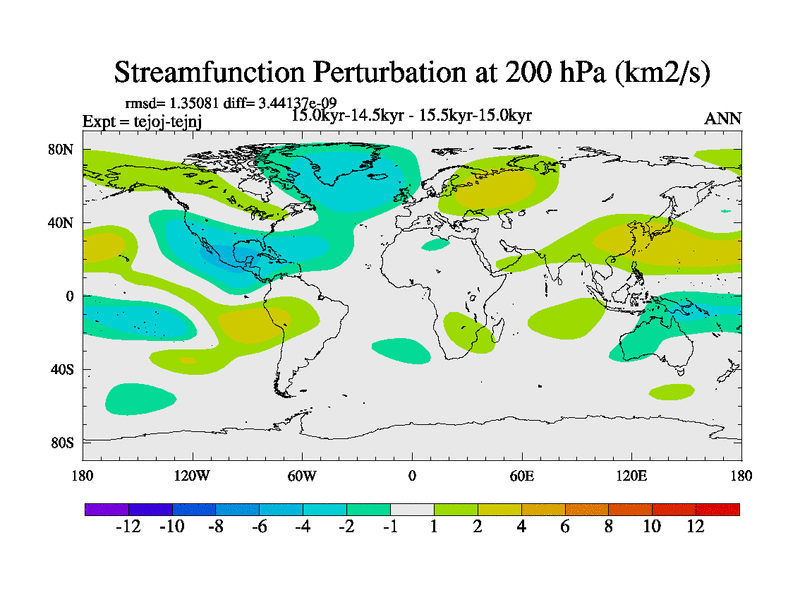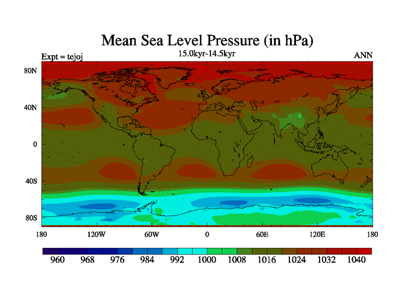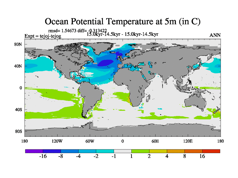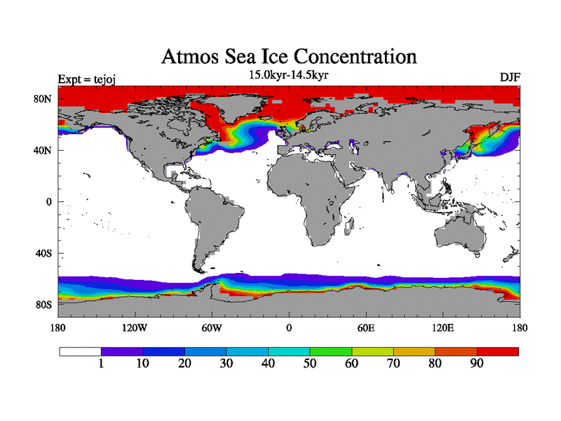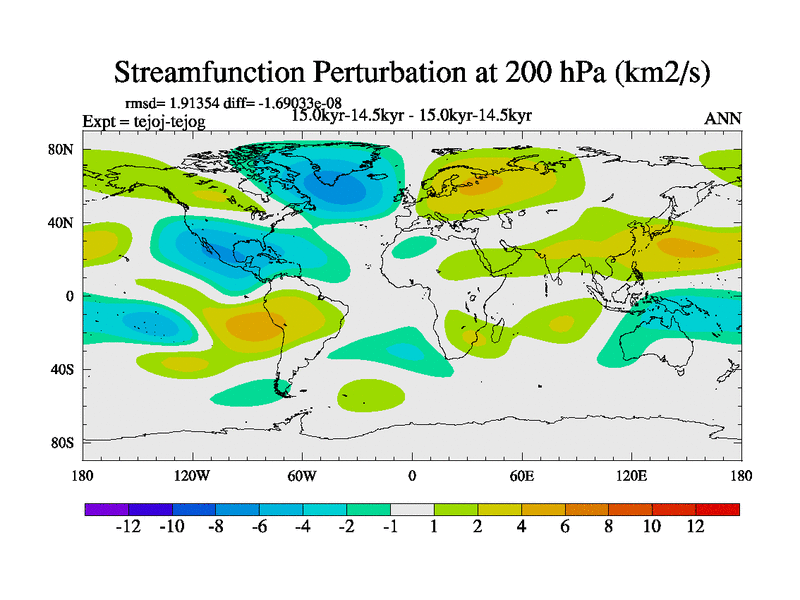 This is part of our deglaciation simulations. All forcings included except melt water fluxes. This series originally started from the tdphm spinup. Revised runoff maps, Russian rivers to Arctic. This vresion uses real meltwater fluxes. |