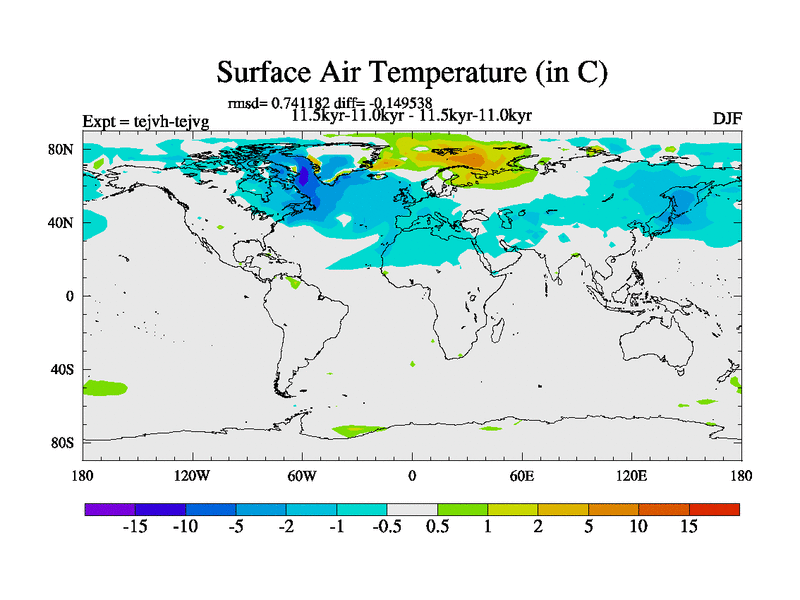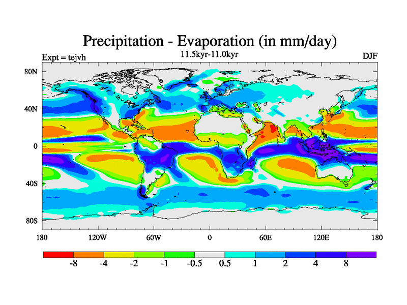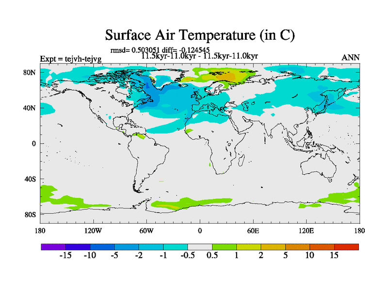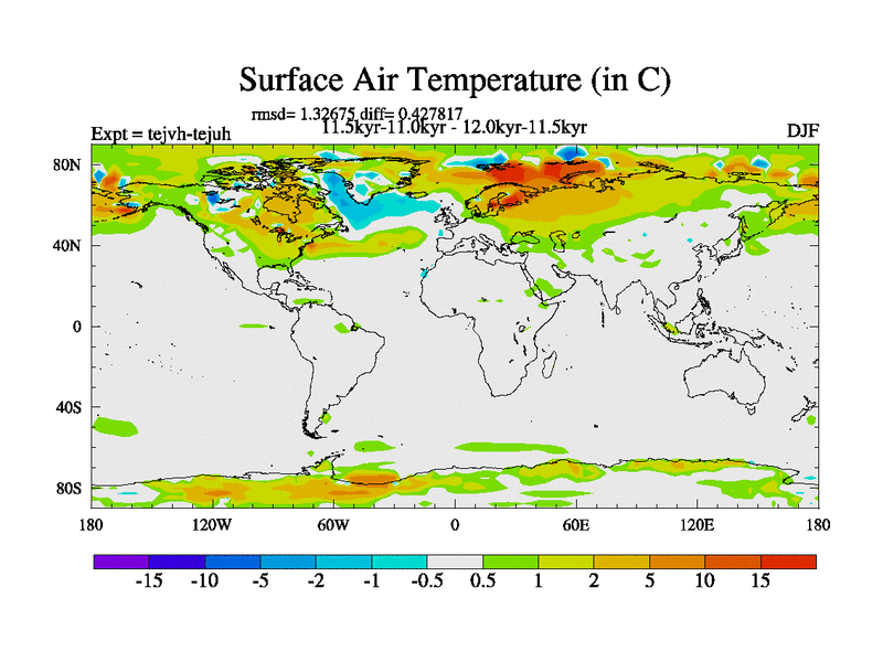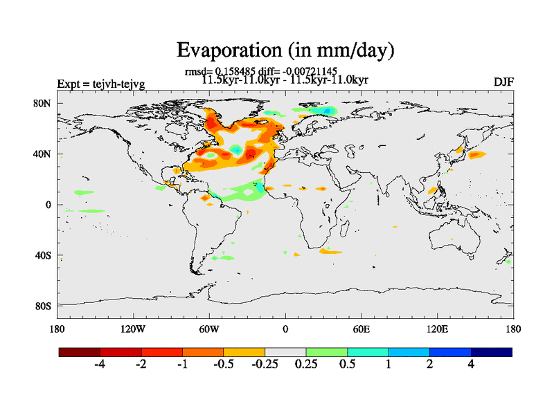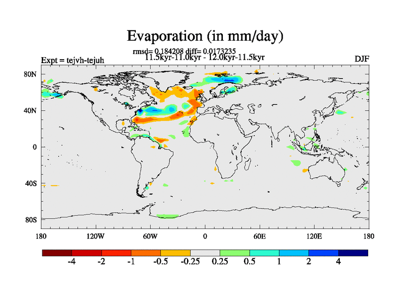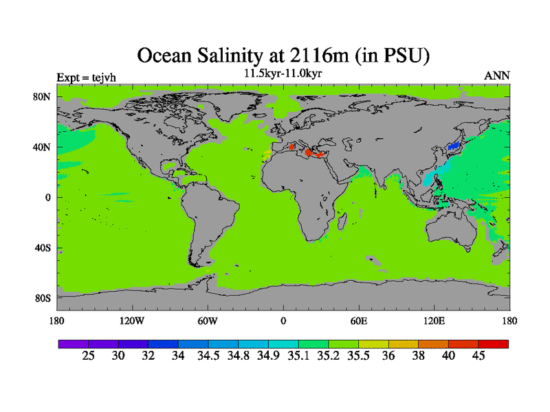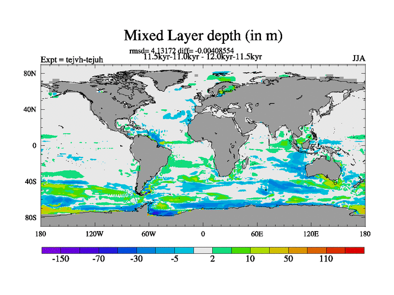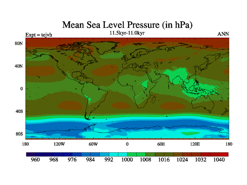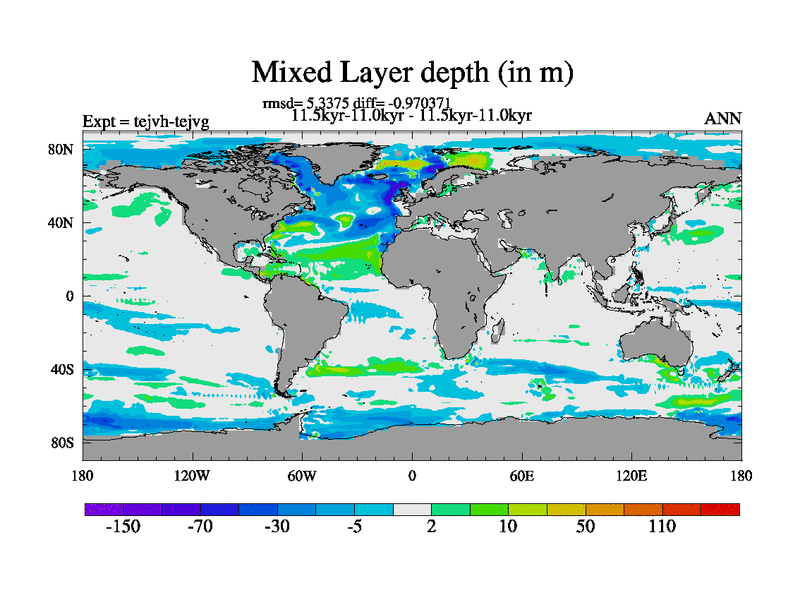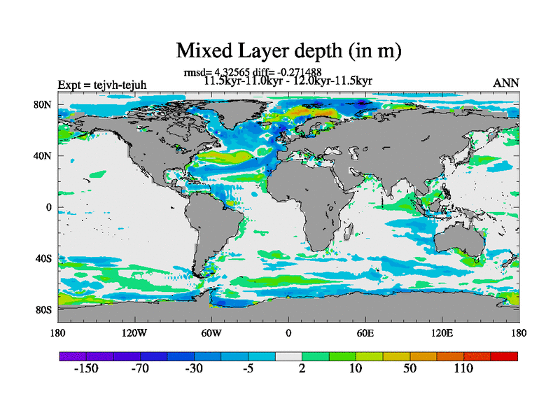 This is part of our deglaciation simulations. All forcings included except melt water fluxes. This series originally started from the tdphm spinup. Revised runoff maps, Russian rivers to Med. This vresion uses real meltwater fluxes. |