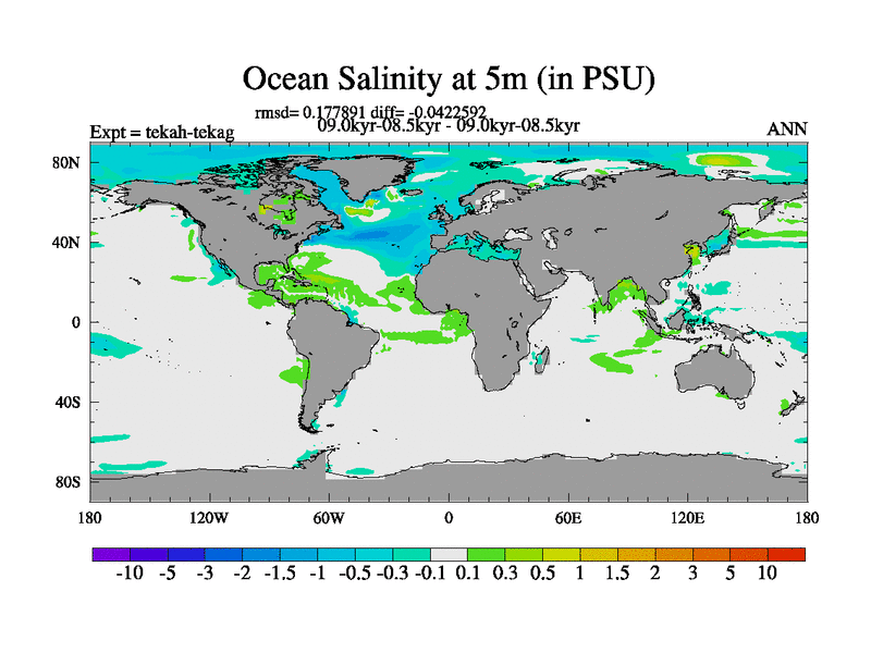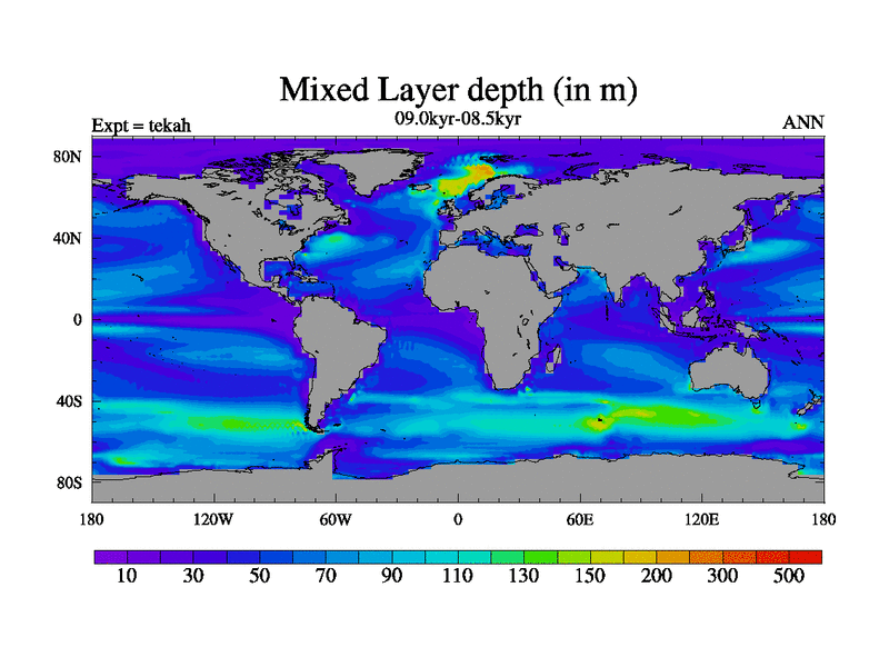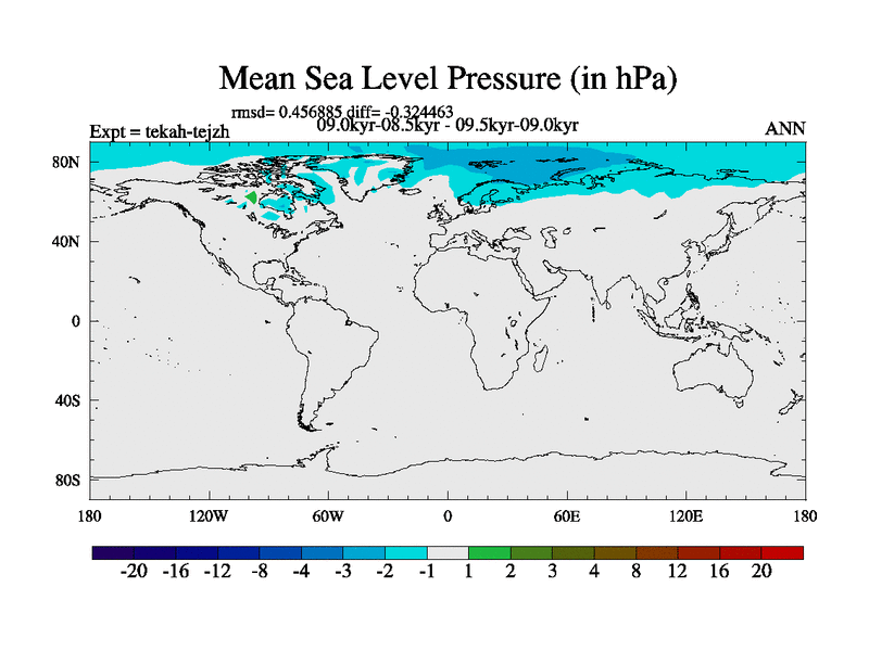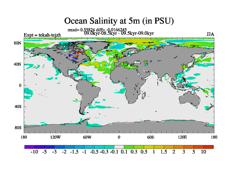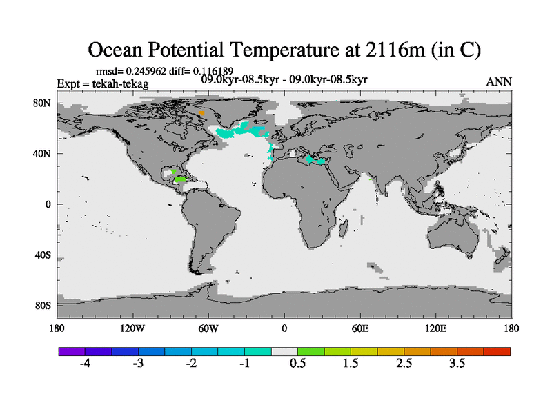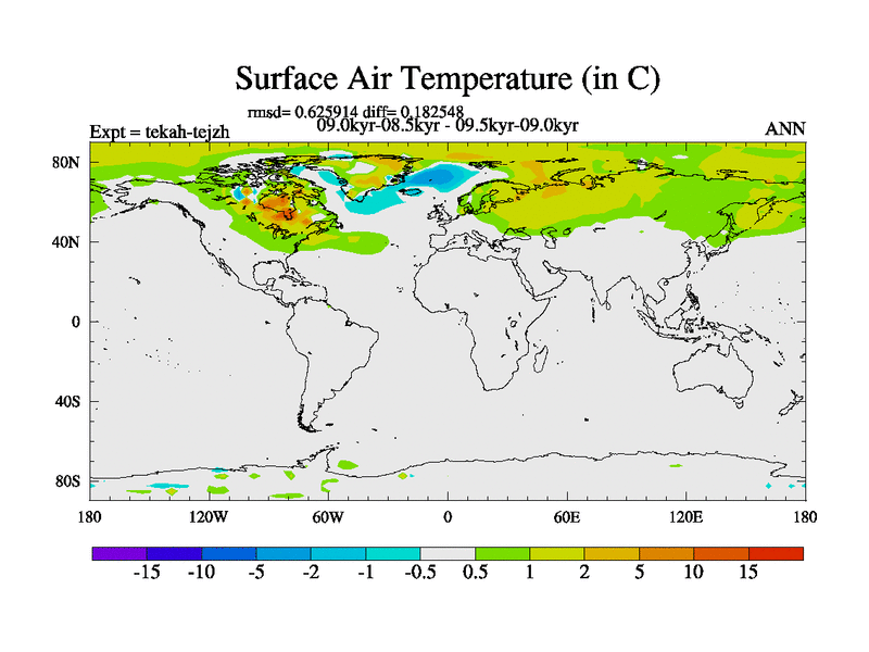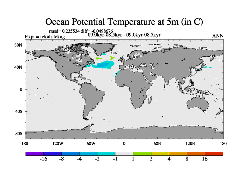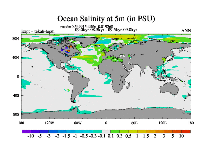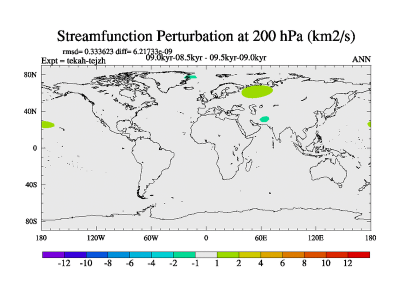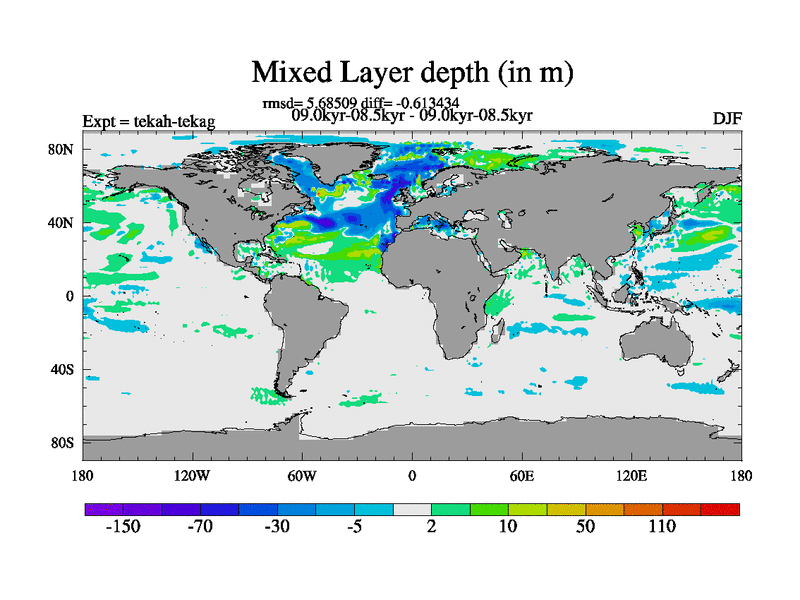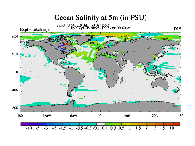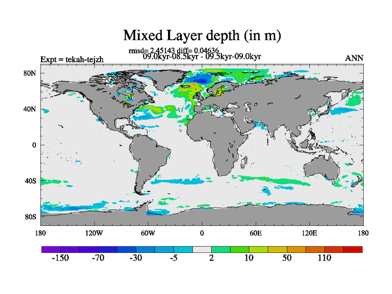 This is part of our deglaciation simulations. All forcings included except melt water fluxes. This series originally started from the tdphm spinup. Revised runoff maps, Russian rivers to Med. This vresion uses real meltwater fluxes. |