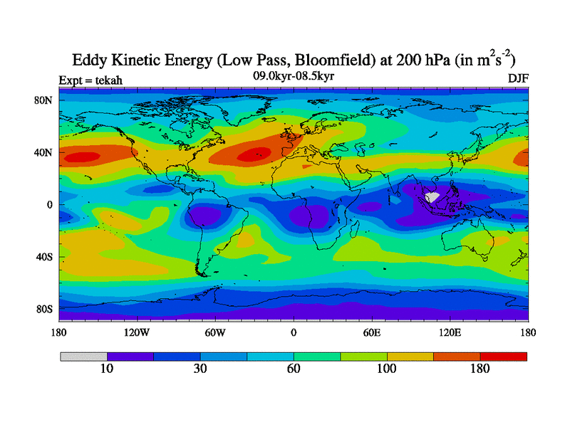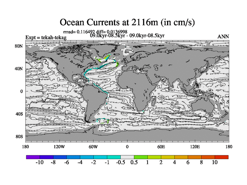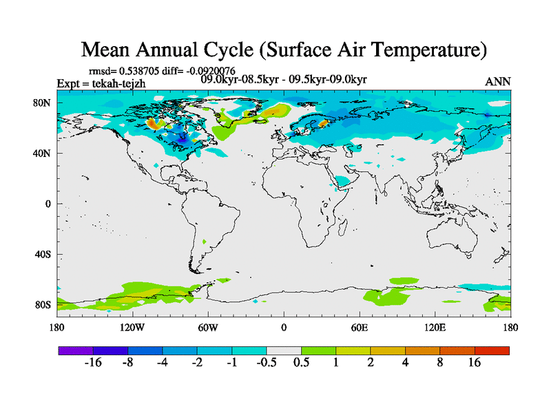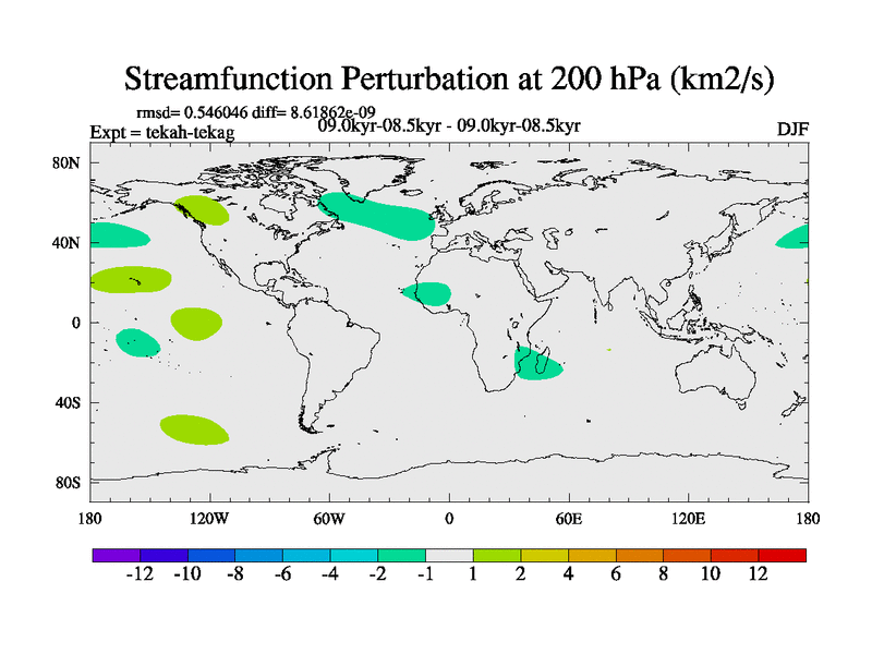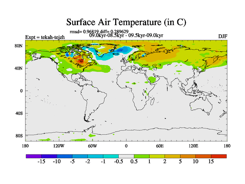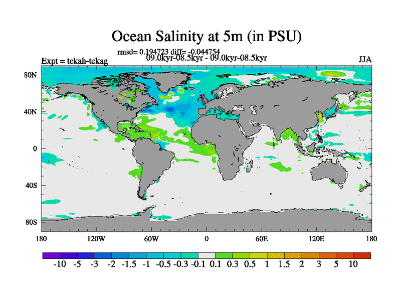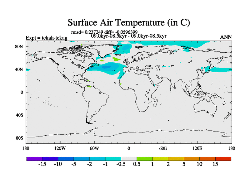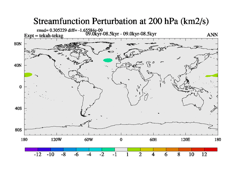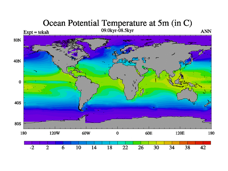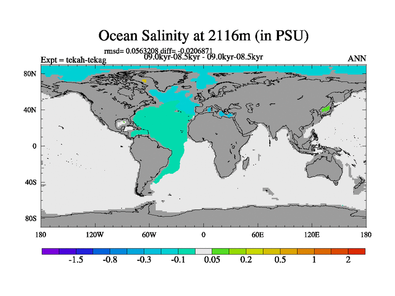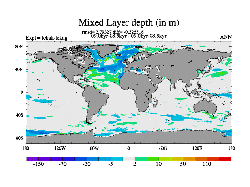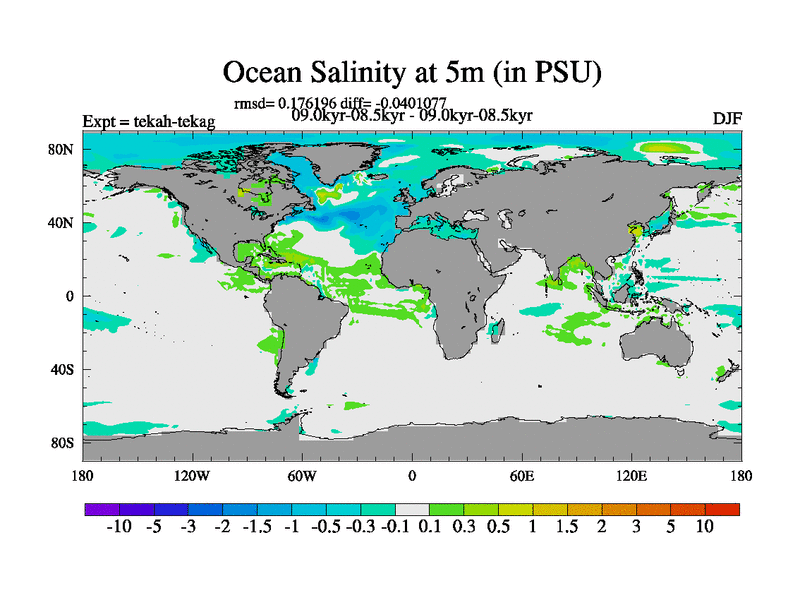 This is part of our deglaciation simulations. All forcings included except melt water fluxes. This series originally started from the tdphm spinup. Revised runoff maps, Russian rivers to Med. This vresion uses real meltwater fluxes. |