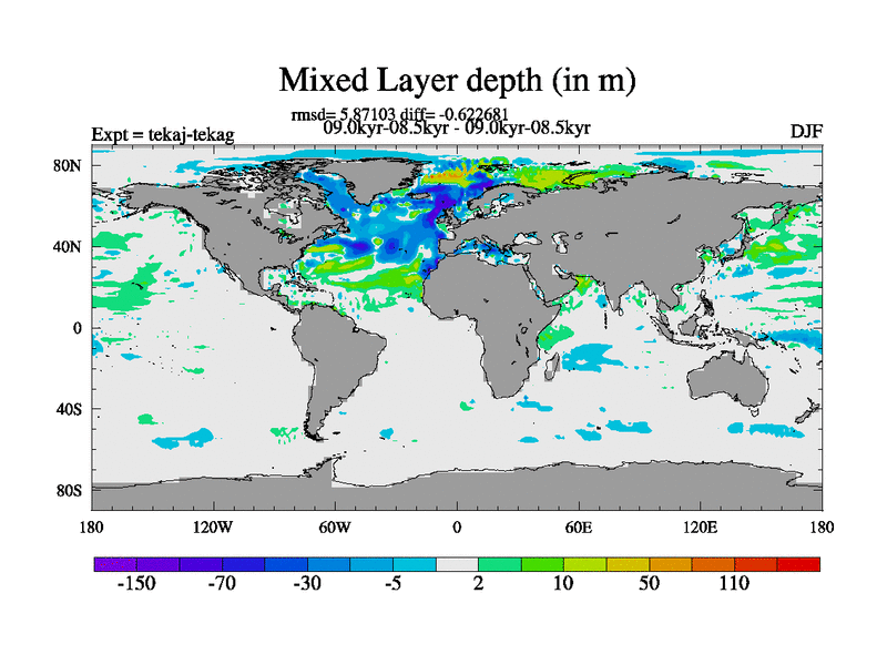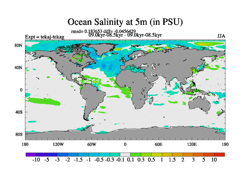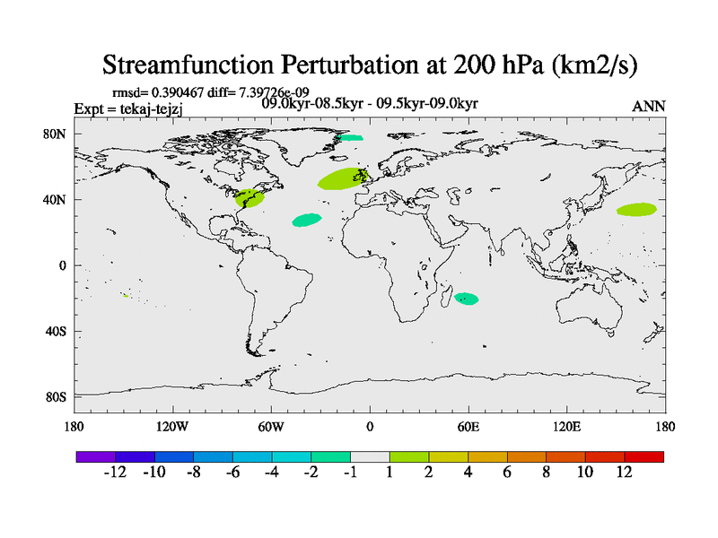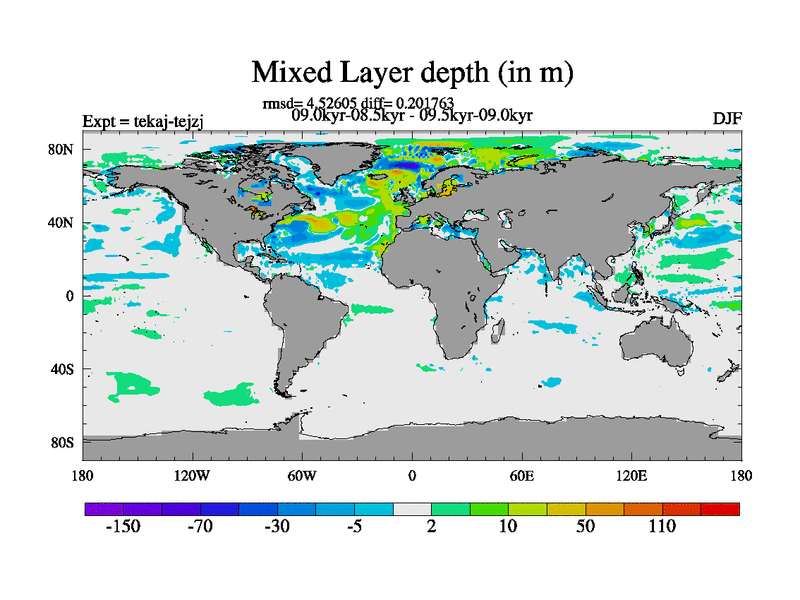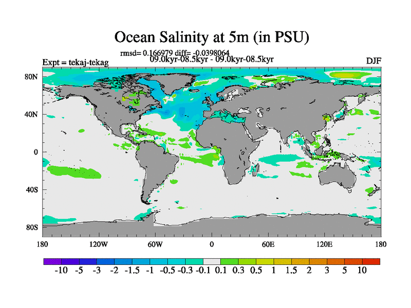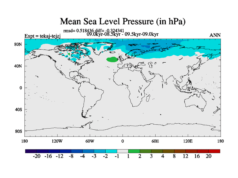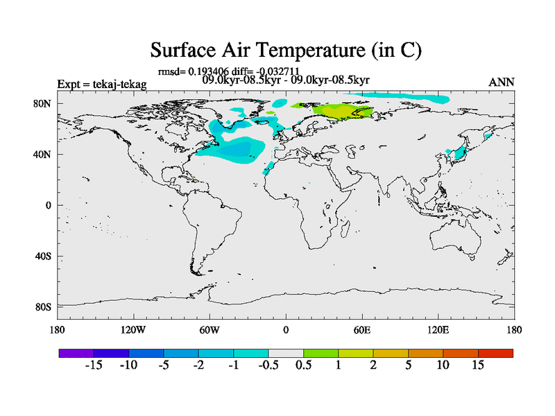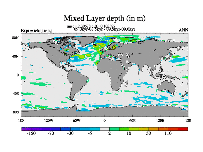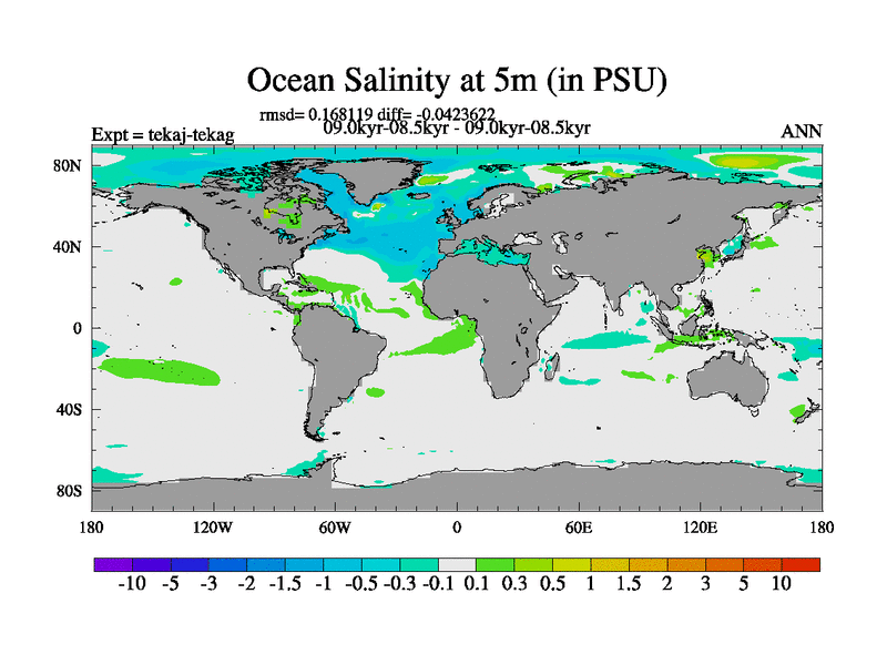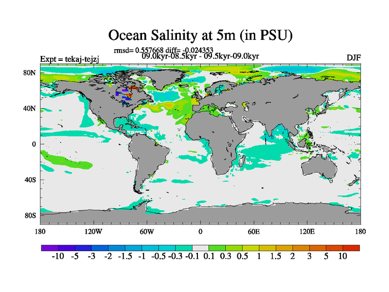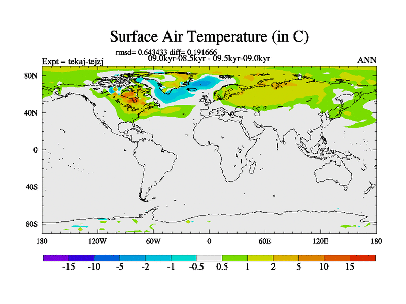 This is part of our deglaciation simulations. All forcings included except melt water fluxes. This series originally started from the tdphm spinup. Revised runoff maps, Russian rivers to Arctic. This vresion uses real meltwater fluxes. |