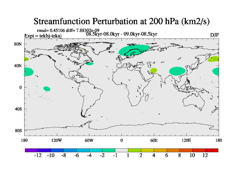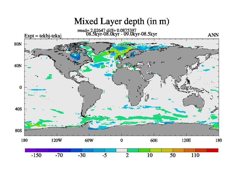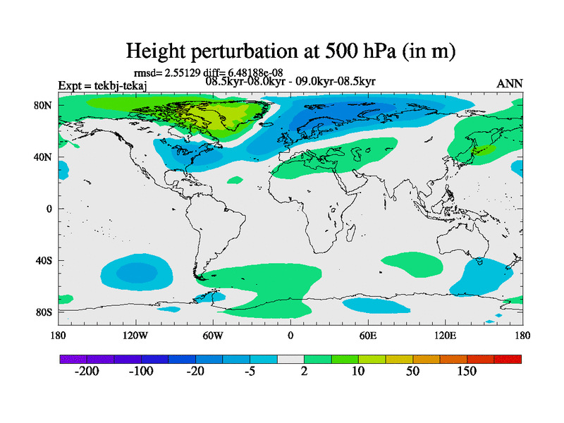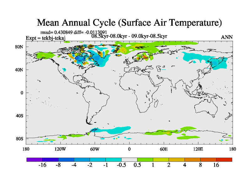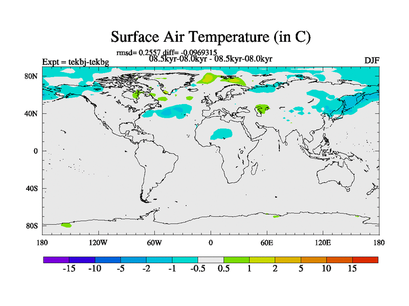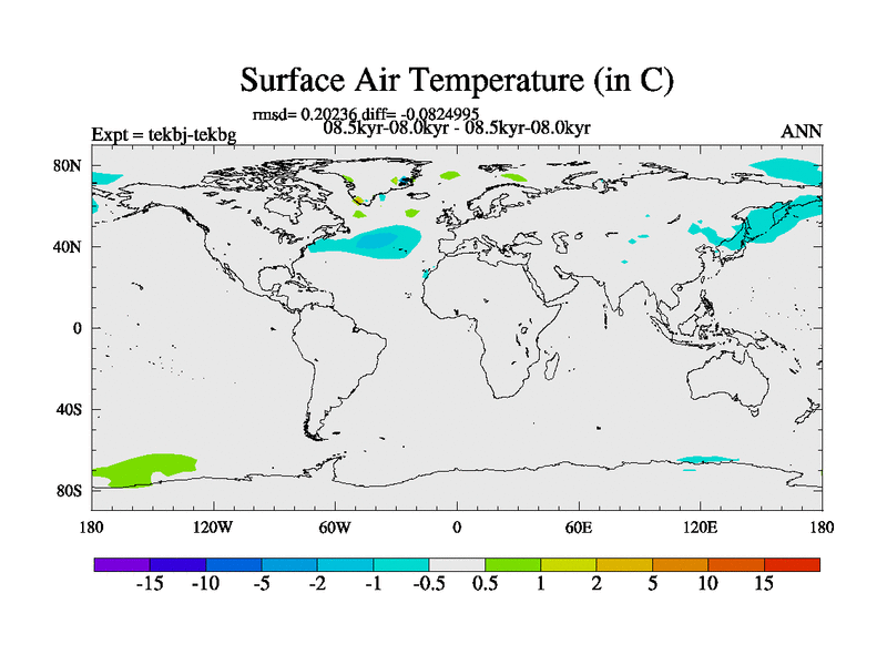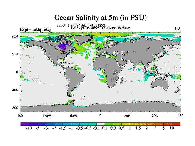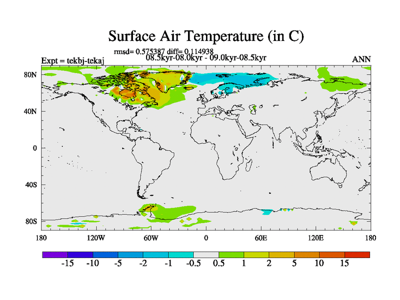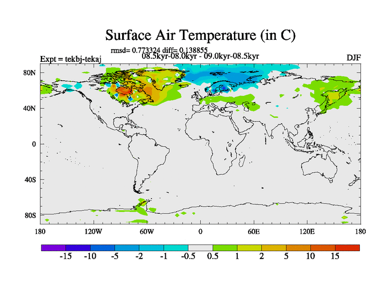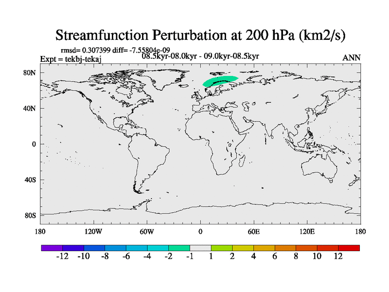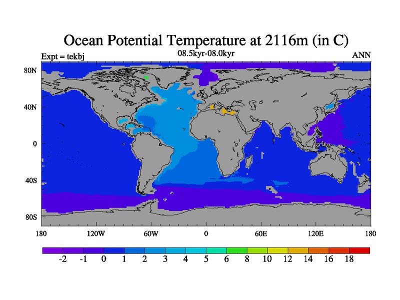 This is part of our deglaciation simulations. All forcings included except melt water fluxes. This series originally started from the tdphm spinup. Revised runoff maps, Russian rivers to Arctic. This vresion uses real meltwater fluxes. |