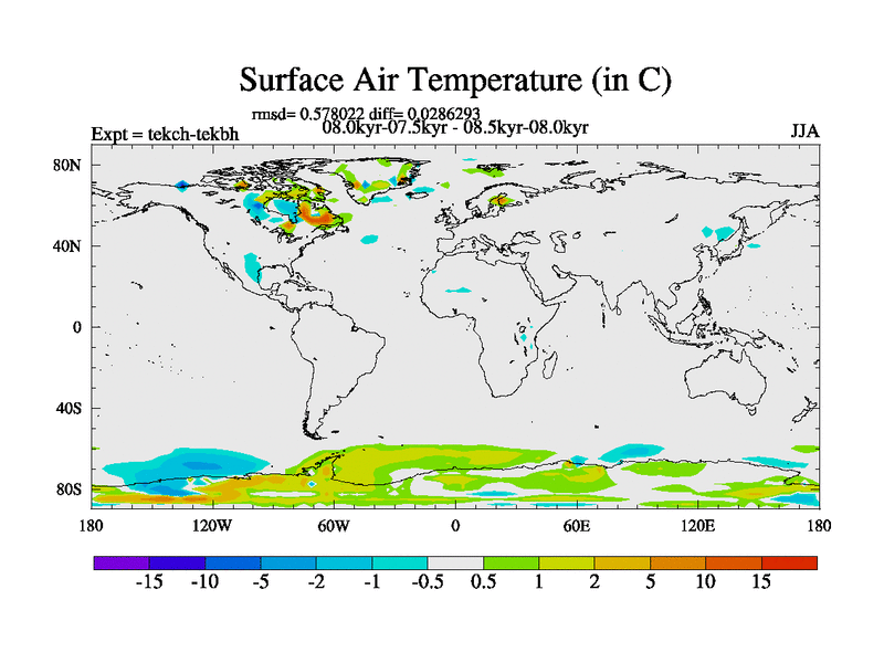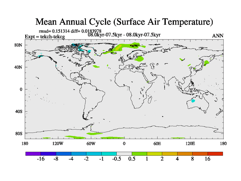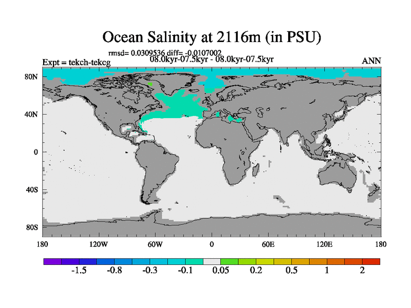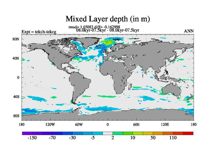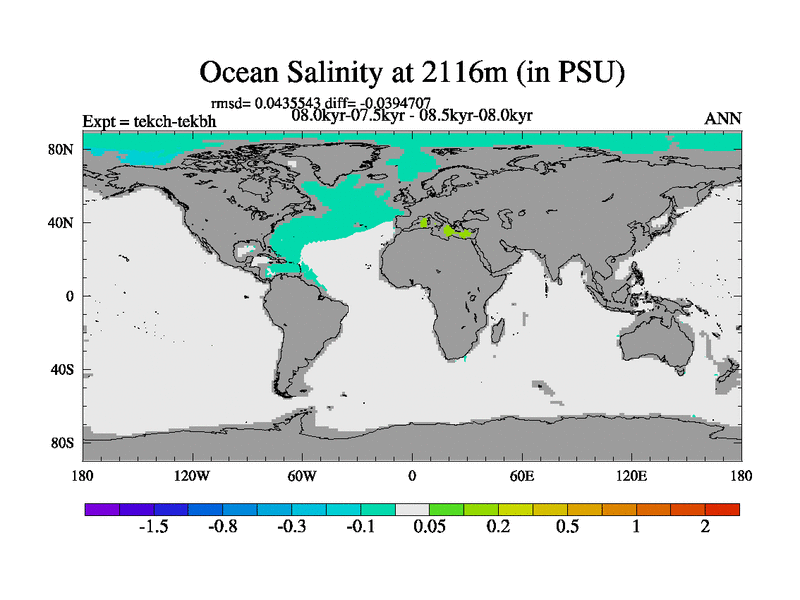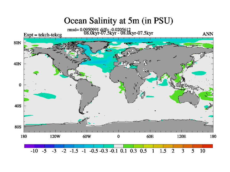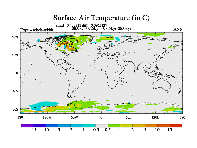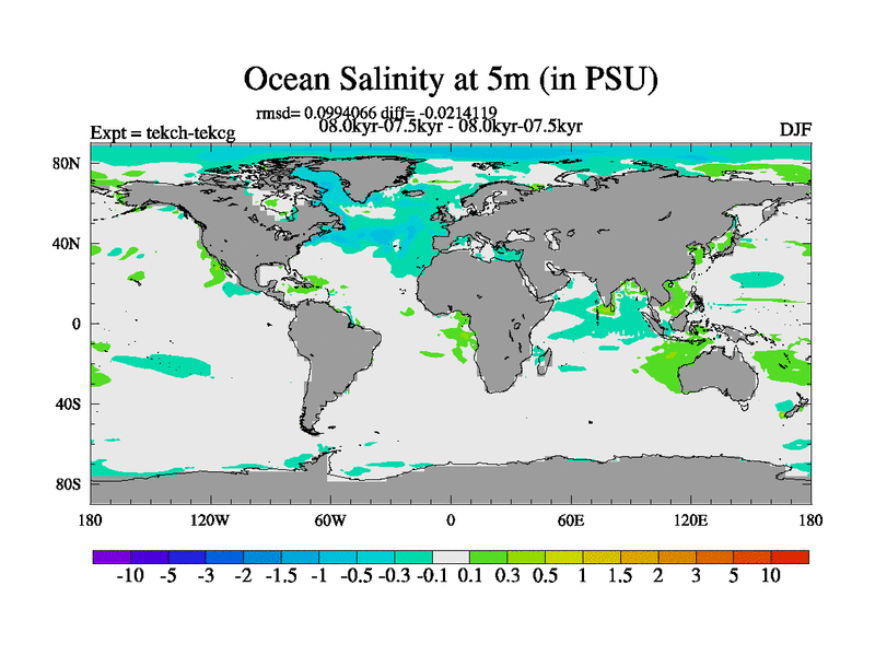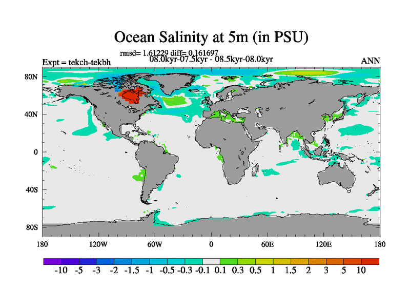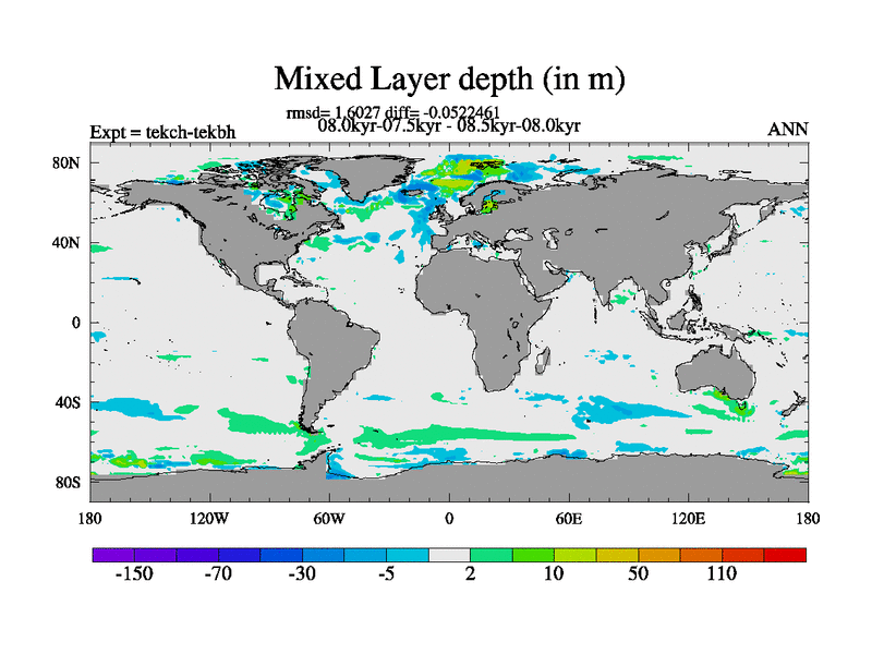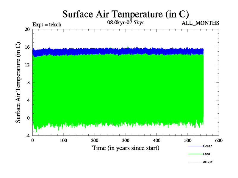 This is part of our deglaciation simulations. All forcings included except melt water fluxes. This series originally started from the tdphm spinup. Revised runoff maps, Russian rivers to Med. This vresion uses real meltwater fluxes. |