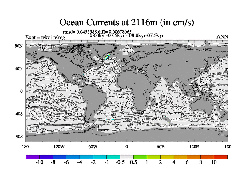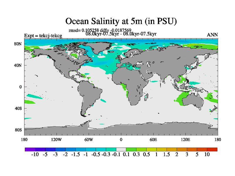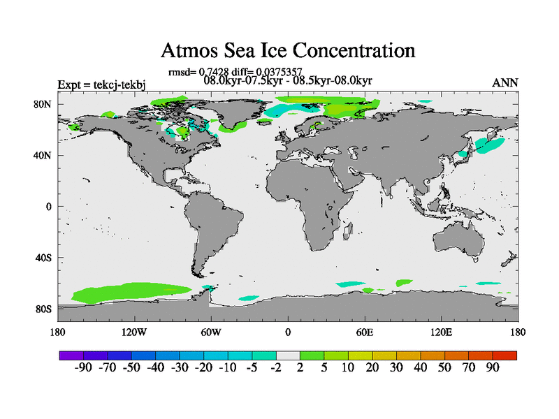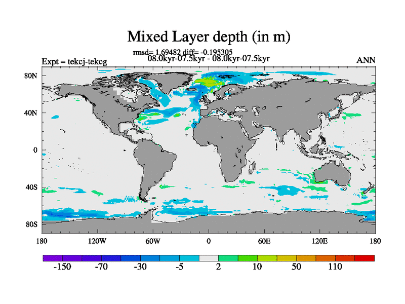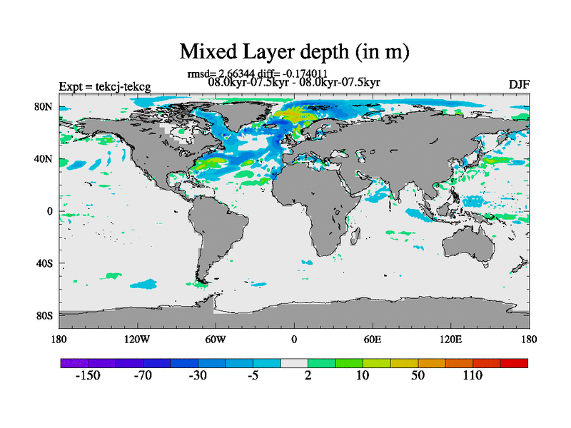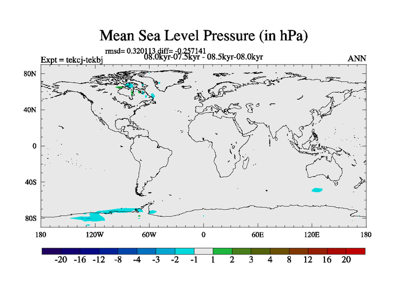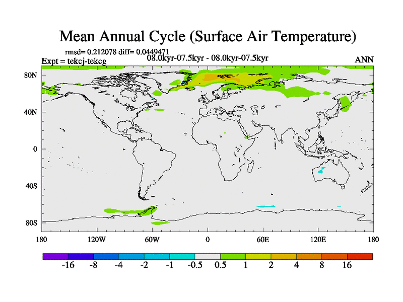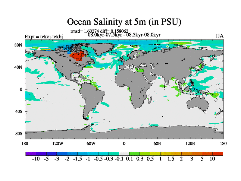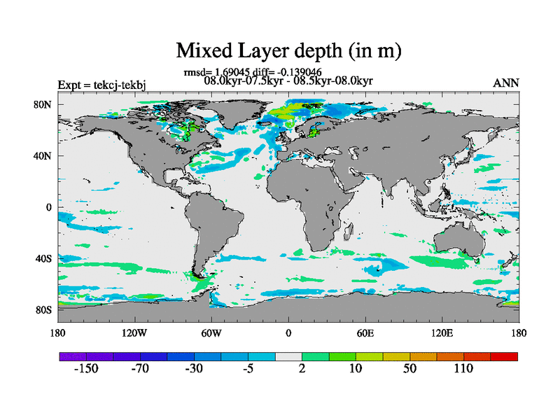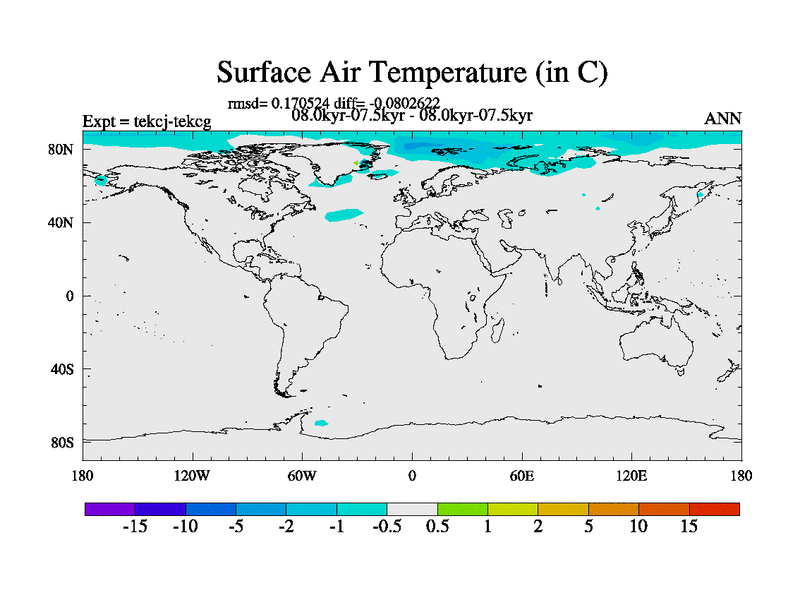 This is part of our deglaciation simulations. All forcings included except melt water fluxes. This series originally started from the tdphm spinup. Revised runoff maps, Russian rivers to Arctic. This vresion uses real meltwater fluxes. |